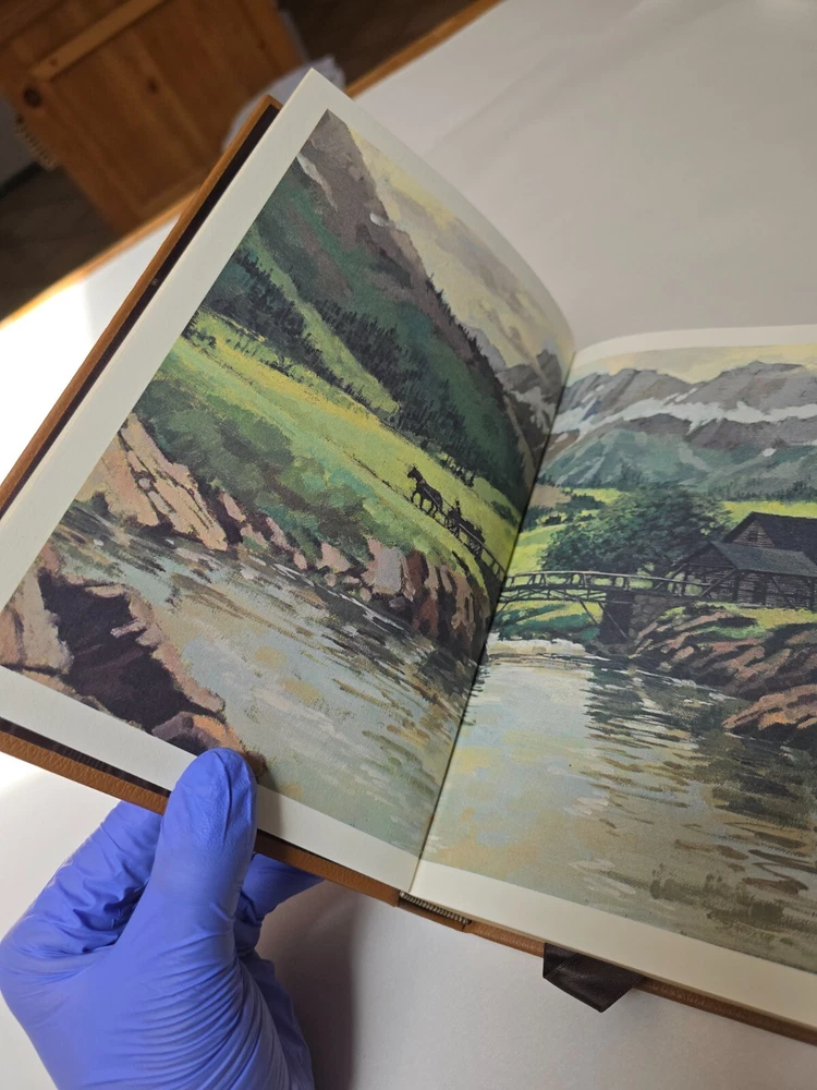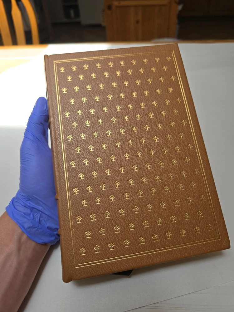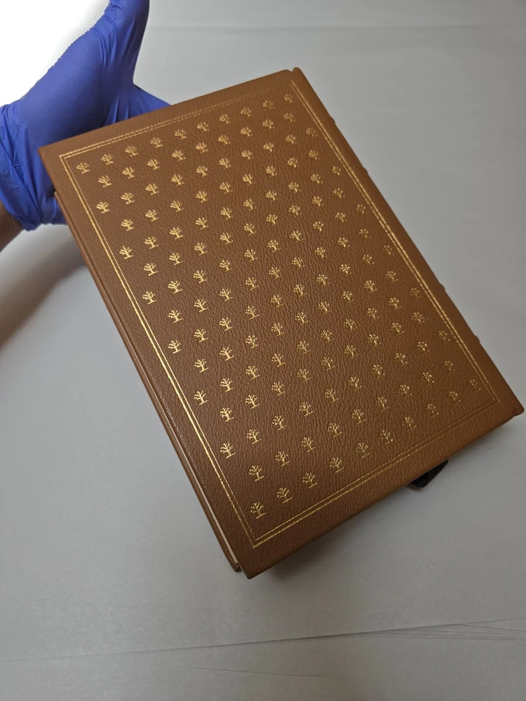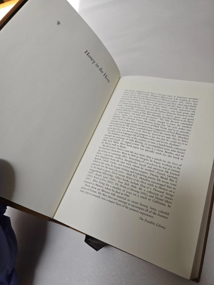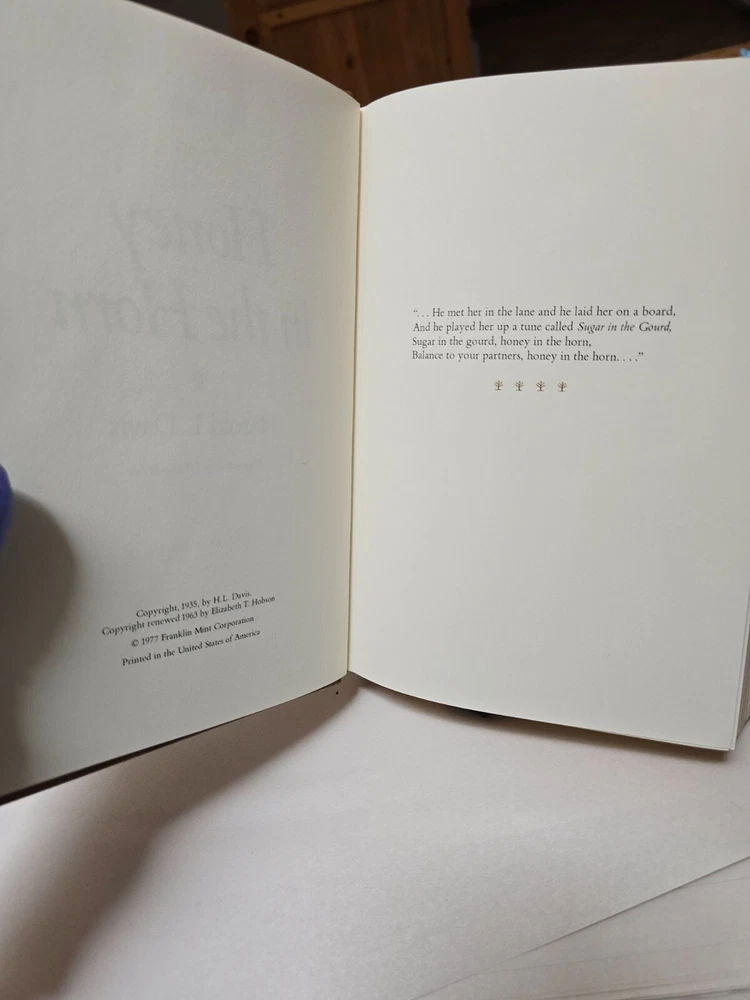 This is a limited edition collector's copy of "Honey in the Horn" by Harold L. Davis, published by Franklin Library in 1977. The book is bound in leather and features illustrations by Uldis Klavins. The book is a perfect addition to any collection of literature and fiction. "Very Fine" condition. This book has only been opened a few times and was preserved in storage since the time of its publication.