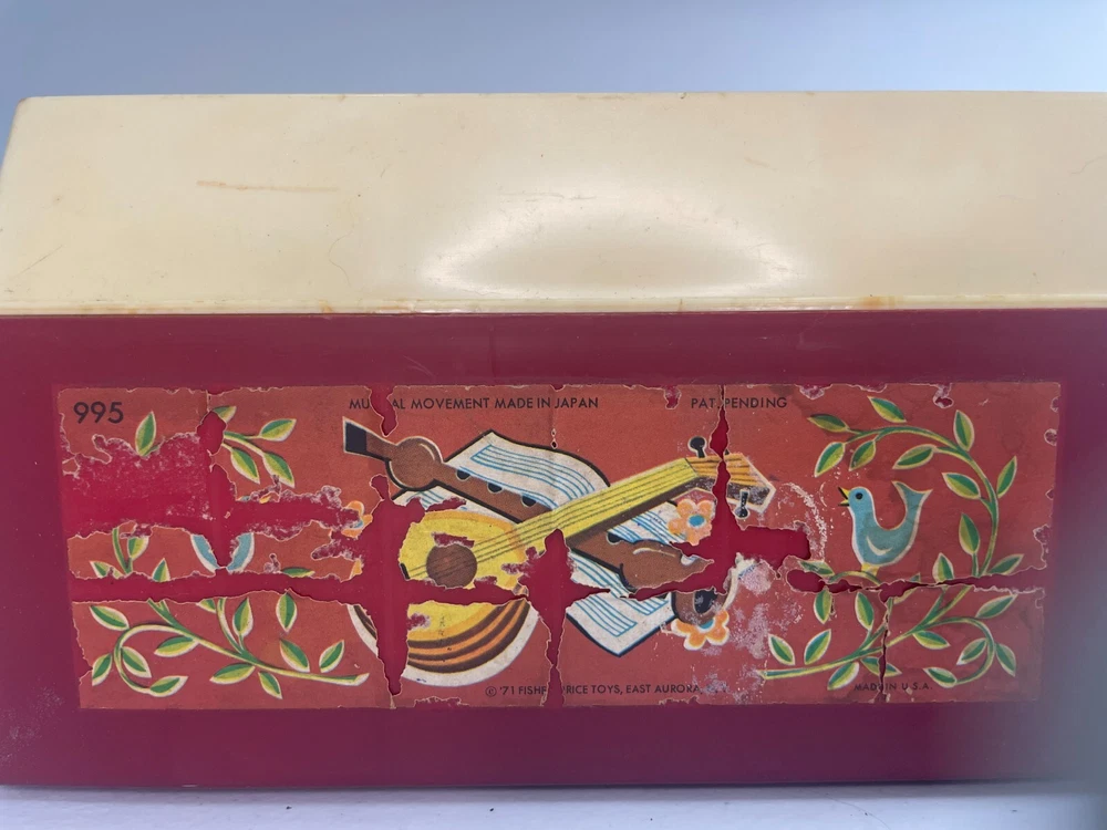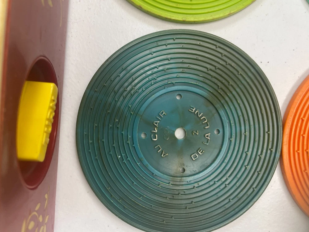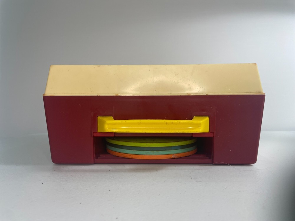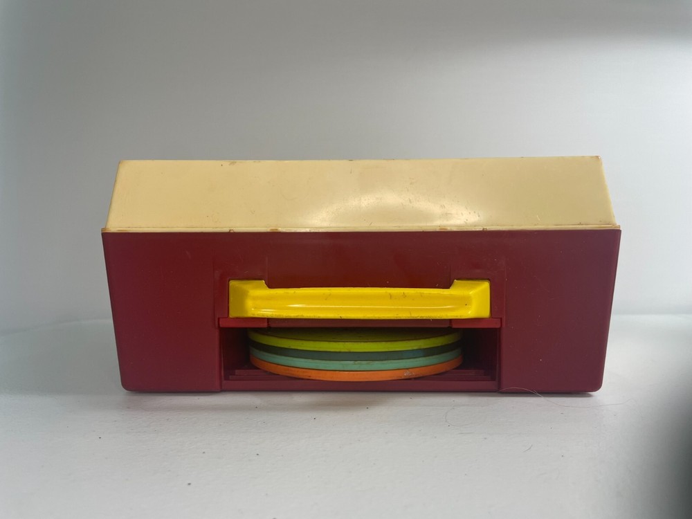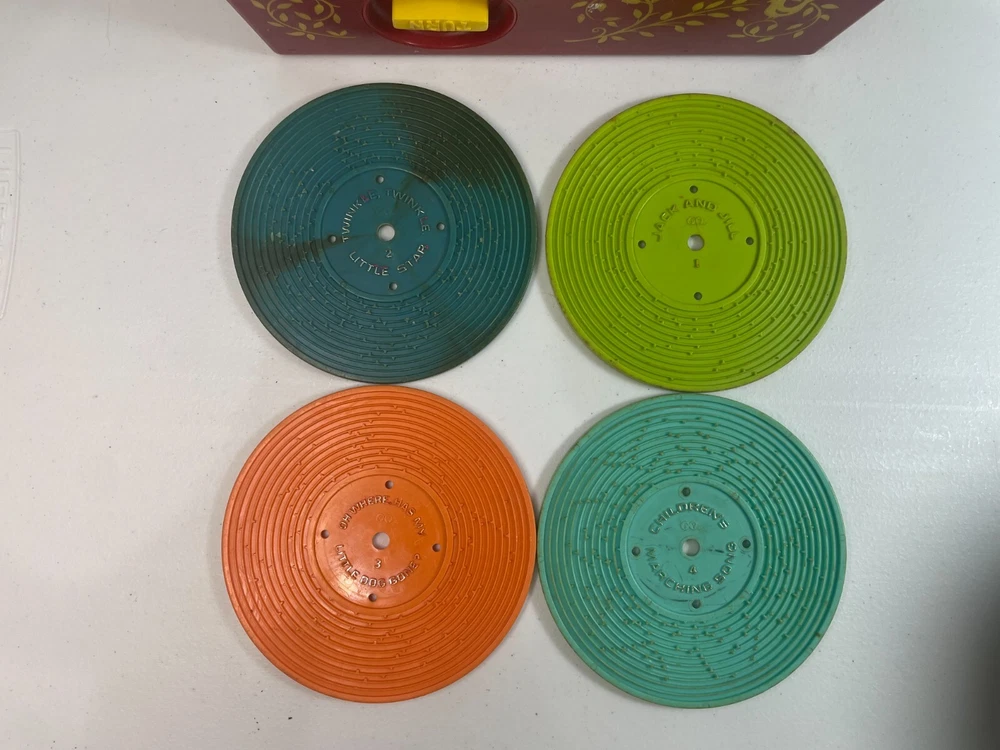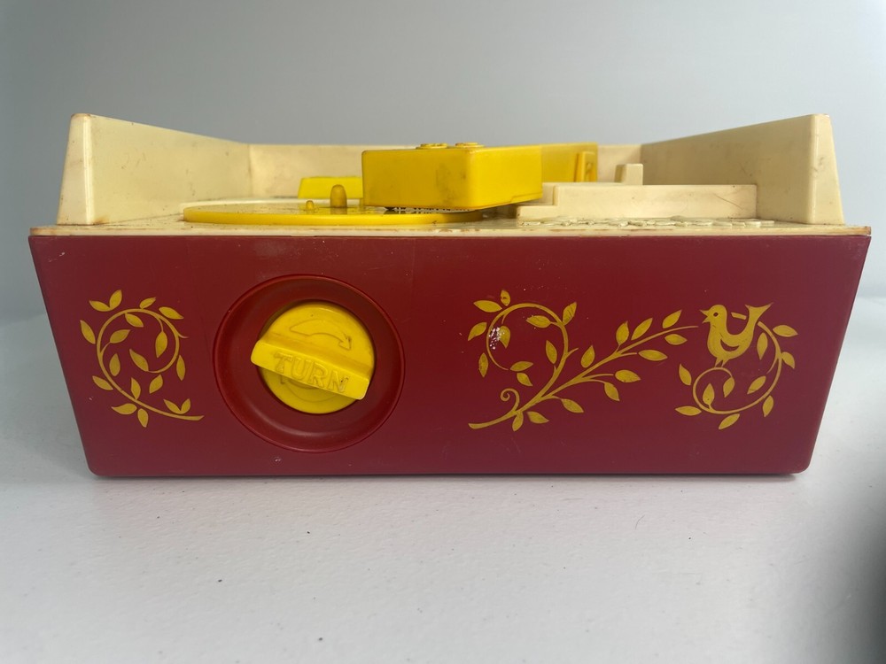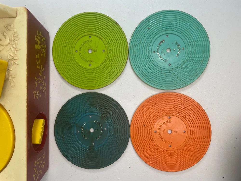 Vintage 1971 Fisher Price Music Box Record Player with 4 original records. This nostalgic toy was found after my parents passed away. The music box does have some cosmetic wear, including scratches and dings, needs a good cleaning, especially the records, but it’s still in good condition for its age and amount of use between 2 kids. The turntable rotates a little slowly, but everything works as expected. How it works: Wind it up with the dial. Place a record on the turntable. Move the arm onto the record. Flip the switch to “on” to start the music. Important Note: The turntable will only rotate and play music when the arm is placed on the record. The set includes 4 records, numbered 1-4, and each is double-sided: Humpty Dumpty & Jack and Jill Twinkle, Twinkle Little Star & Au Clair De La Lune Oh, Where Has My Little Dog Gone & London Bridge Camptown Races & Children’s Marching Song Condition: The music box is in good working order, but rotates a bit slowly. There are scratches and dings consistent with age and use. Selling as-is , no returns.