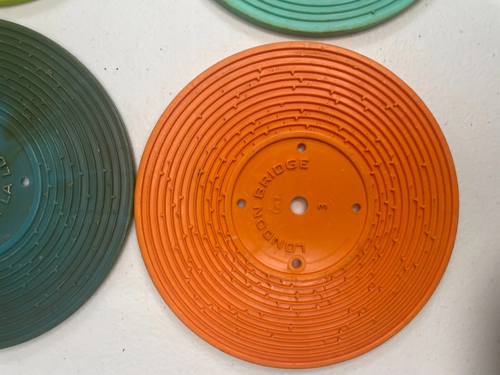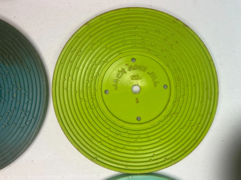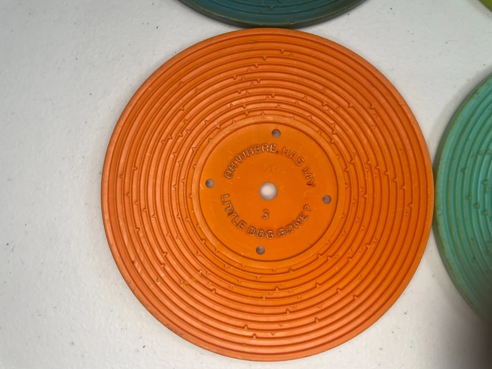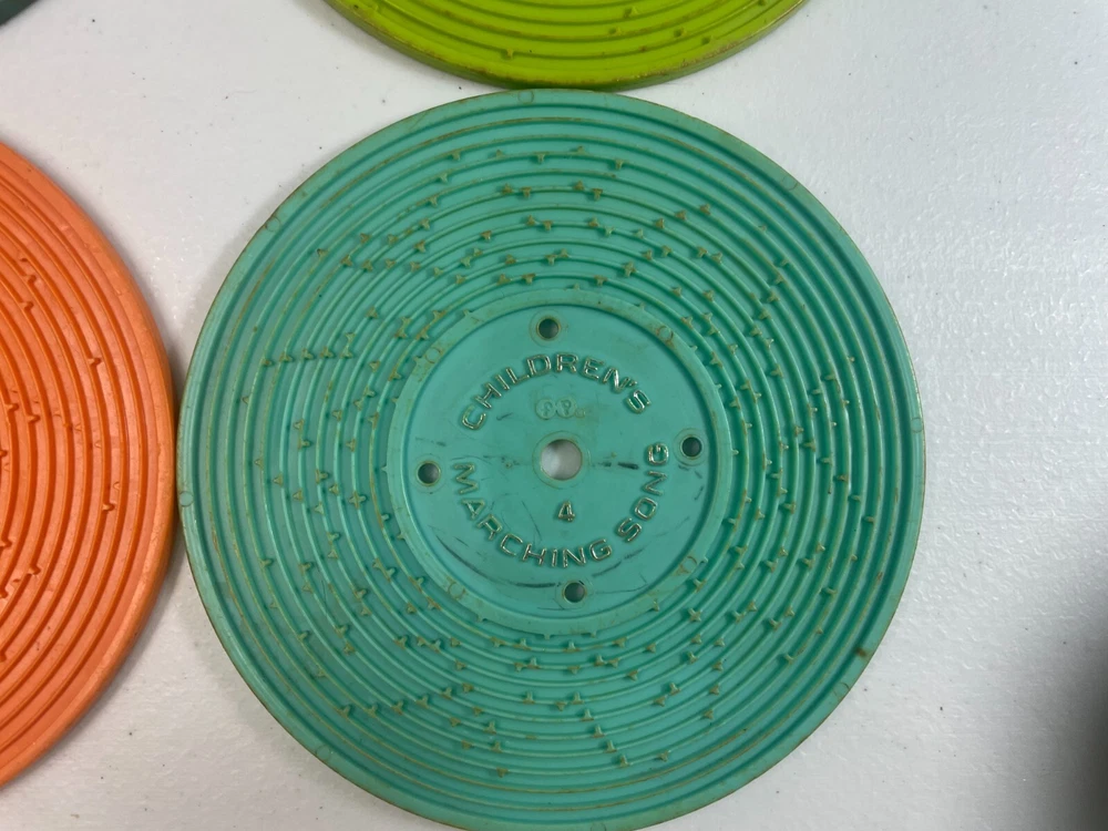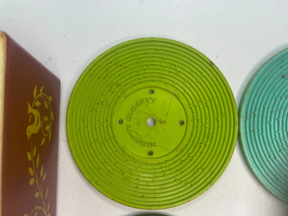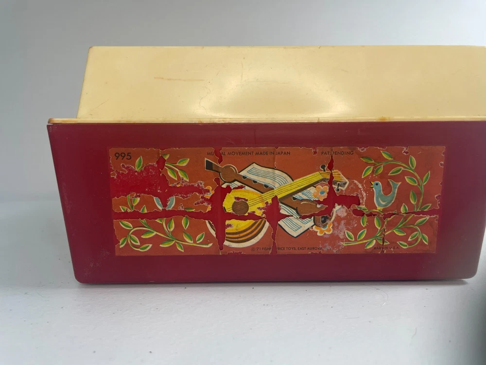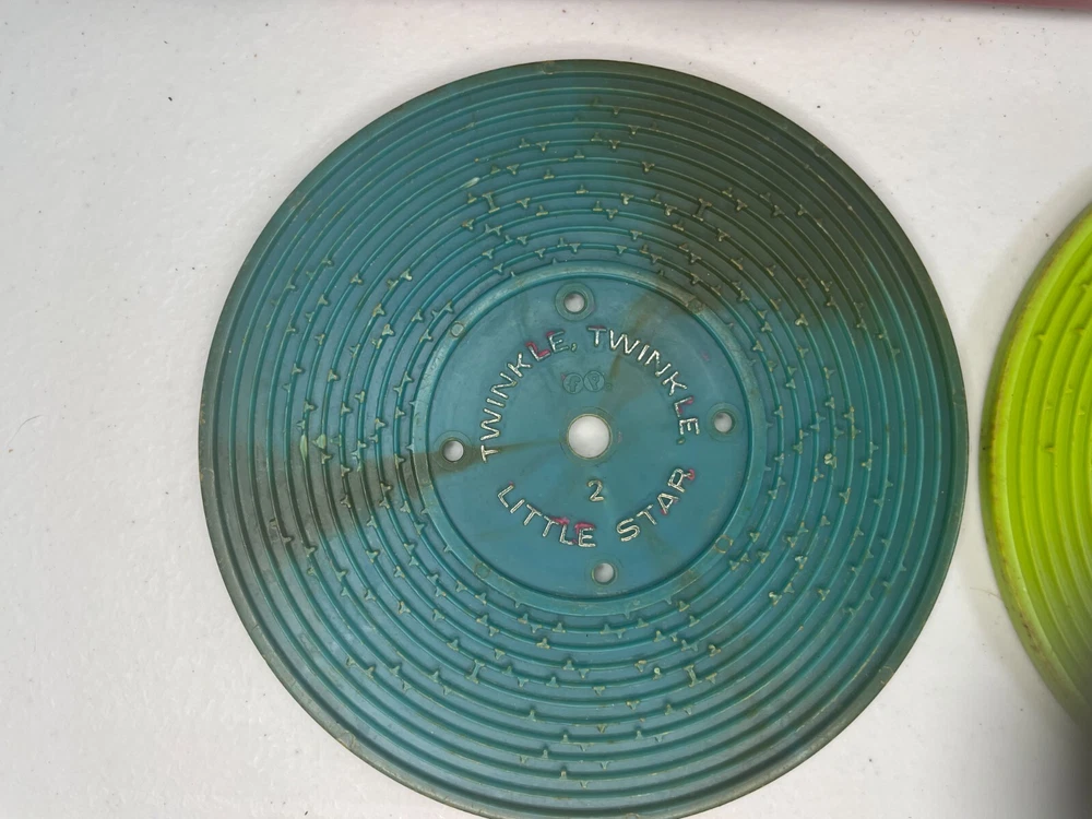 Vintage 1971 Fisher Price Music Box Record Player with 4 original records. This nostalgic toy was found after my parents passed away. The music box does have some cosmetic wear, including scratches and dings, needs a good cleaning, especially the records, but it’s still in good condition for its age and amount of use between 2 kids. The turntable rotates a little slowly, but everything works as expected. How it works: Wind it up with the dial. Place a record on the turntable. Move the arm onto the record. Flip the switch to “on” to start the music. Important Note: The turntable will only rotate and play music when the arm is placed on the record. The set includes 4 records, numbered 1-4, and each is double-sided: Humpty Dumpty & Jack and Jill Twinkle, Twinkle Little Star & Au Clair De La Lune Oh, Where Has My Little Dog Gone & London Bridge Camptown Races & Children’s Marching Song Condition: The music box is in good working order, but rotates a bit slowly. There are scratches and dings consistent with age and use. Selling as-is , no returns.