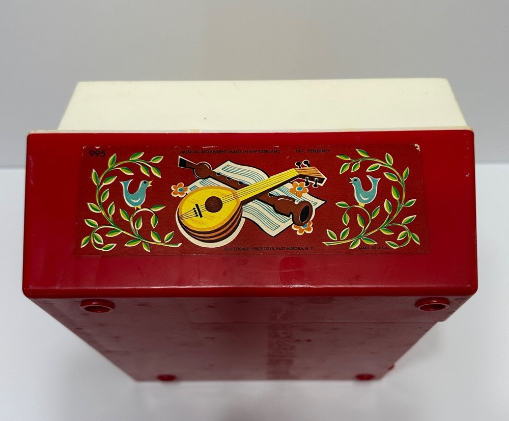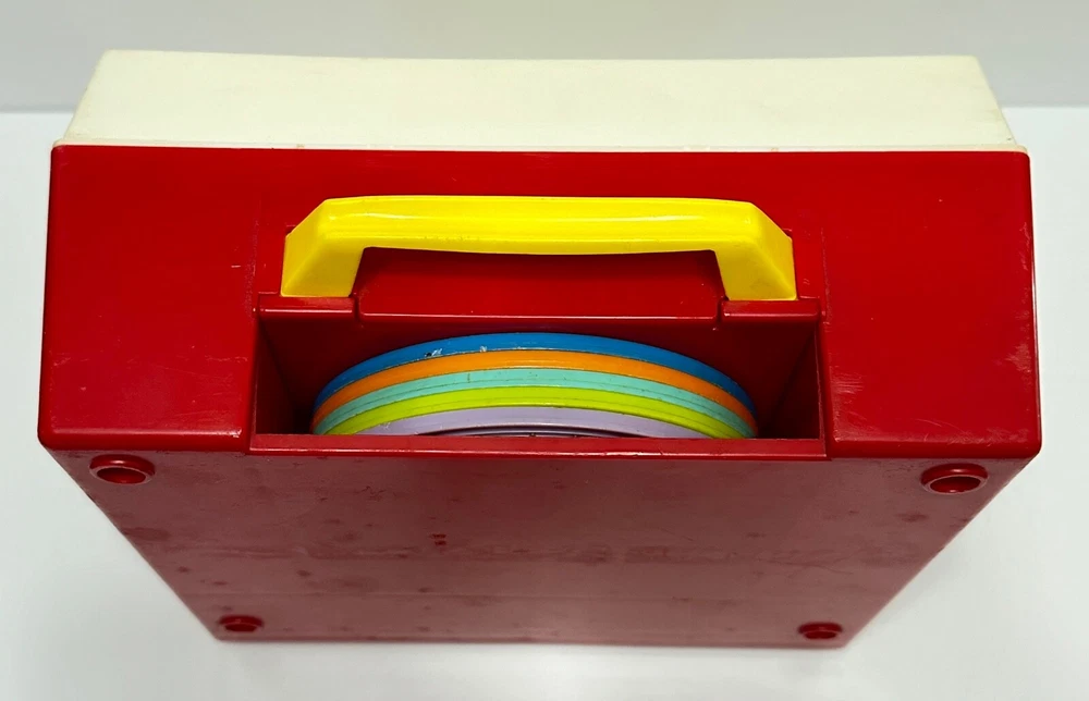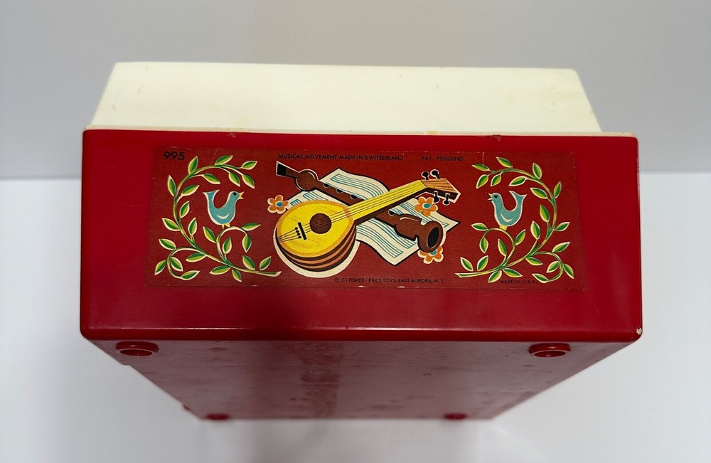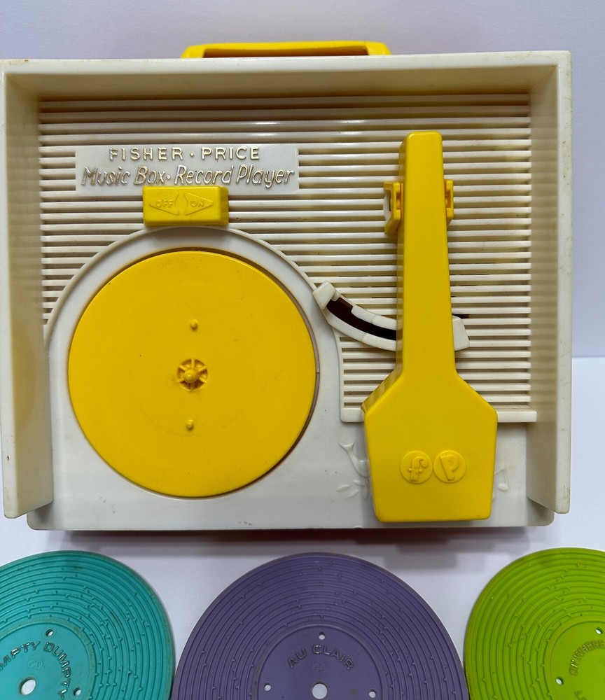 his vintage Fisher Price Music Box Record Player from 1971 is a must-have for any toy collector or lover of classic toys. It comes with 5 discs and is wind-up. The player has been tested and confirmed to be in working condition. It was a little slow to start but works better the more it is used. This is mine from my ch ildhood and I remember paying with it, so it hasn't been wound up for nearly 50 years! The red and yellow color scheme, along with the Fisher Price branding, will bring a touch of nostalgia to any room. This piece is perfect for vintage toy enthusiasts and adds a touch of charm to any collection. Don't miss the chance to own this classic toy from the United States. Good "Played With/ Vintage" Condition. Tested/Works! All 5 discs included! SEE PICS Records include the timeless hits: Jack And Jill Humpty Dumpty Twinkle Twinkle little star Au Clair De La Lune Oh where has my little dog gone London Bridge Camptown Races Children's Marching Song Hickory Dickory dock Edelweiss