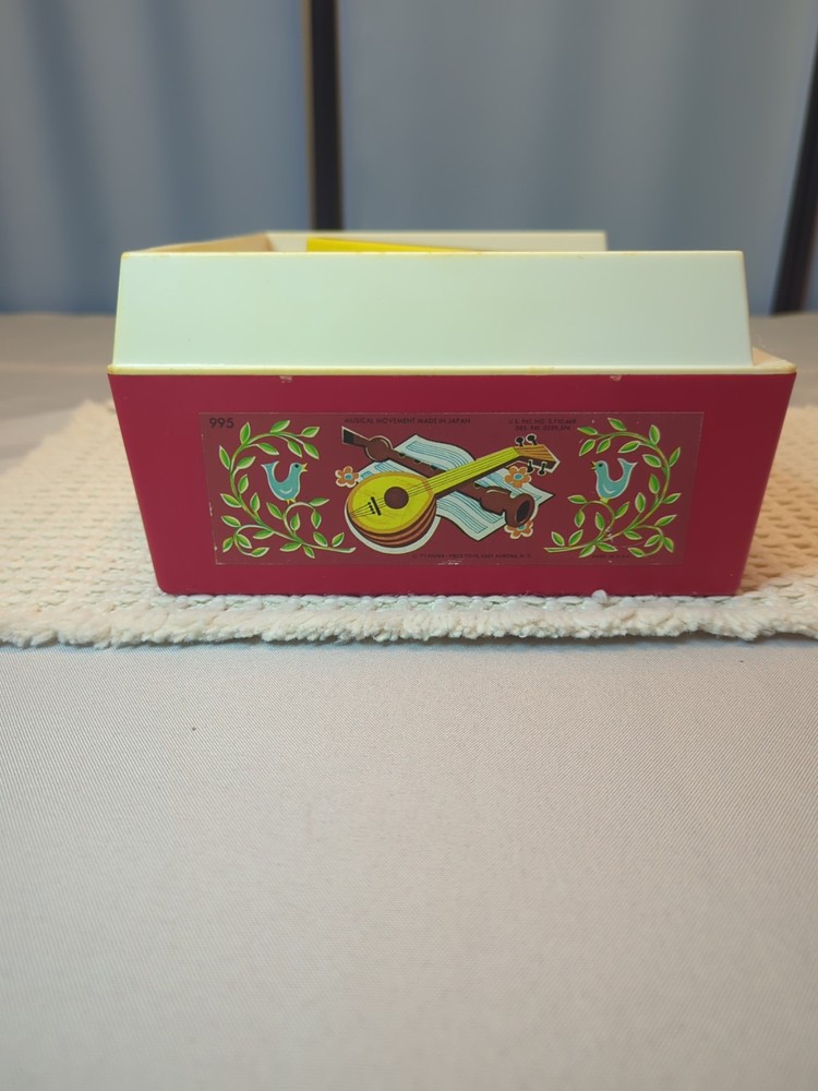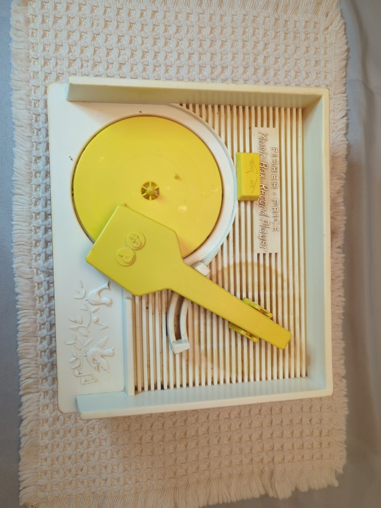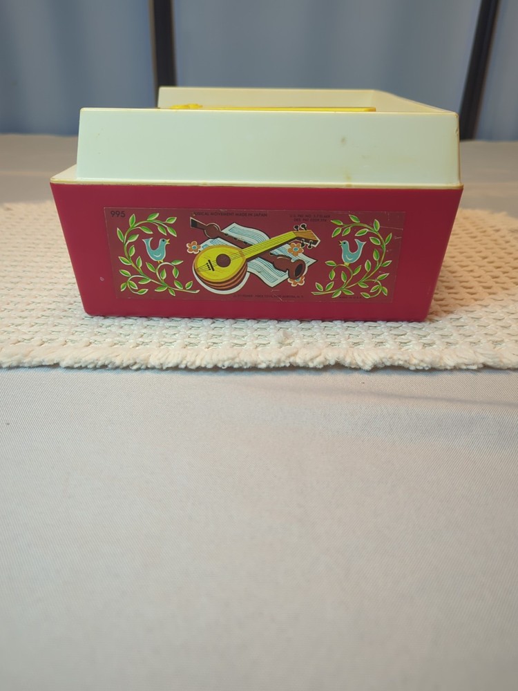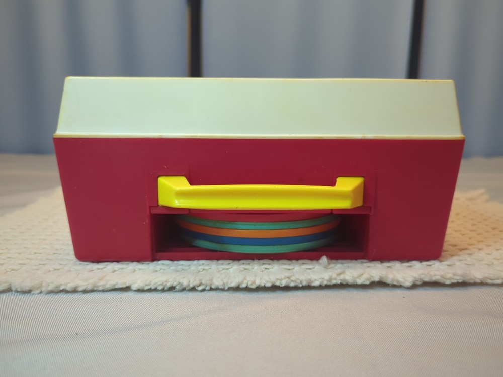 Player works well, some clicking as expected for age. Discoloration is due to age. All toys have been cleaned & disinfected. has 5 Double-Sided records: Au Claire de la lune/ Twinkle twinkle Little Star/Edelweiss/ Hickory Dickory Dock/Jack and Jill/ Humpty Dumpty/ London bridge/ Oh where has my little dog gone?/ Children's Marching song/Camp Town Races