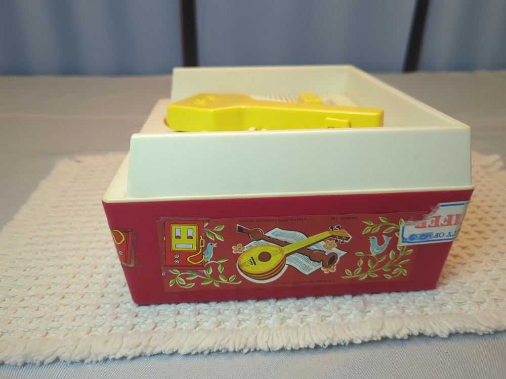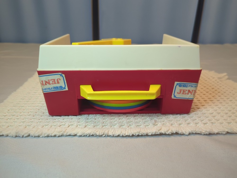 Player works well, some clicking as expected for age. Discoloration is due to age. All toys have been cleaned & disinfected. Has some stickers on it that says "property of Jennifer" unable to remove without damaging original decal. 4 Double-Sided records: Eau Claire de la lune/ Twinkle twinkle Little Star/Edelweiss/ Hickory Dickory Dock/ London bridge/ Oh where has my little dog gone?/Do Re Me/Blue Danube
