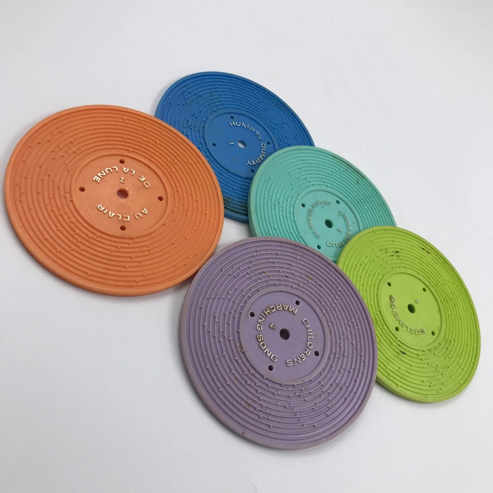 Good Preowned Condition Light Stains and Scuffs in Music Box and Various Records No Chips or Cracks, in Plastic Tested, Working Condition Includes 5 Double Sided Plastic Records See Pictures for Details and Condition
