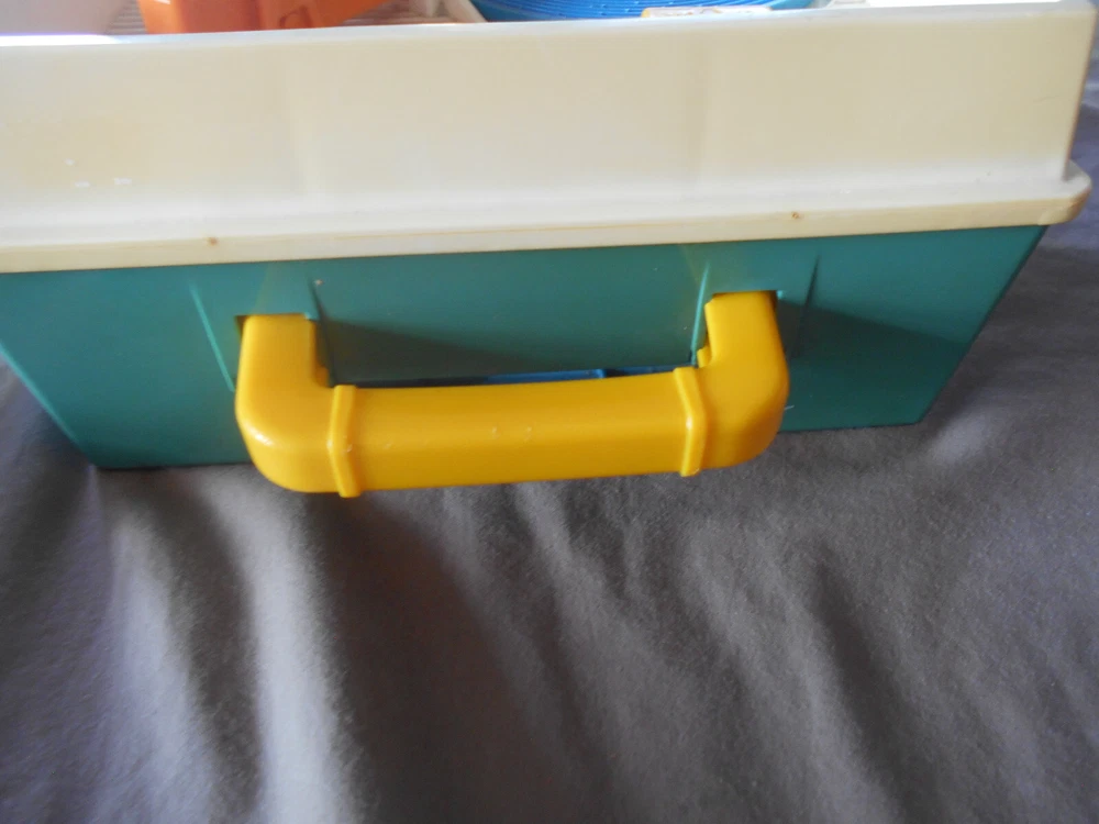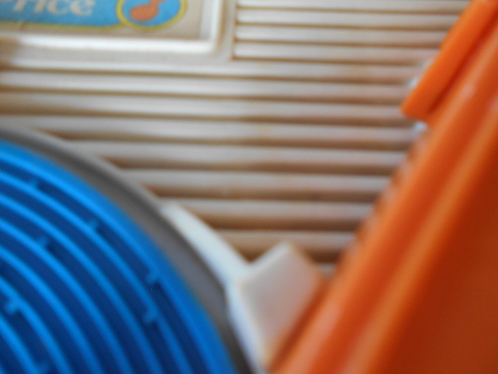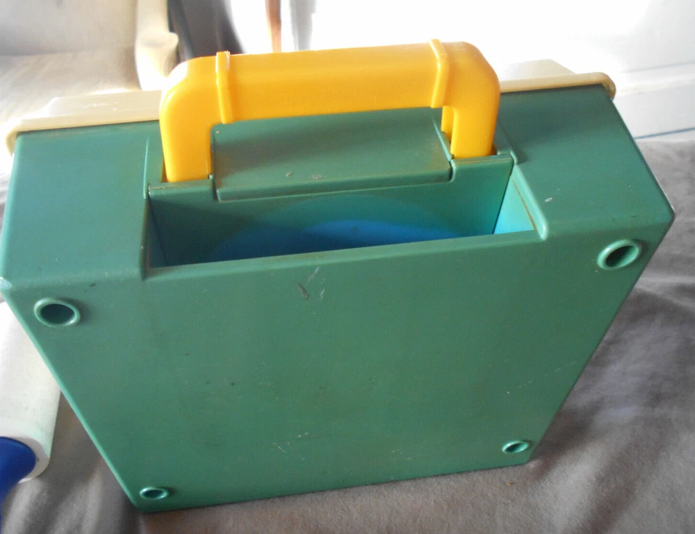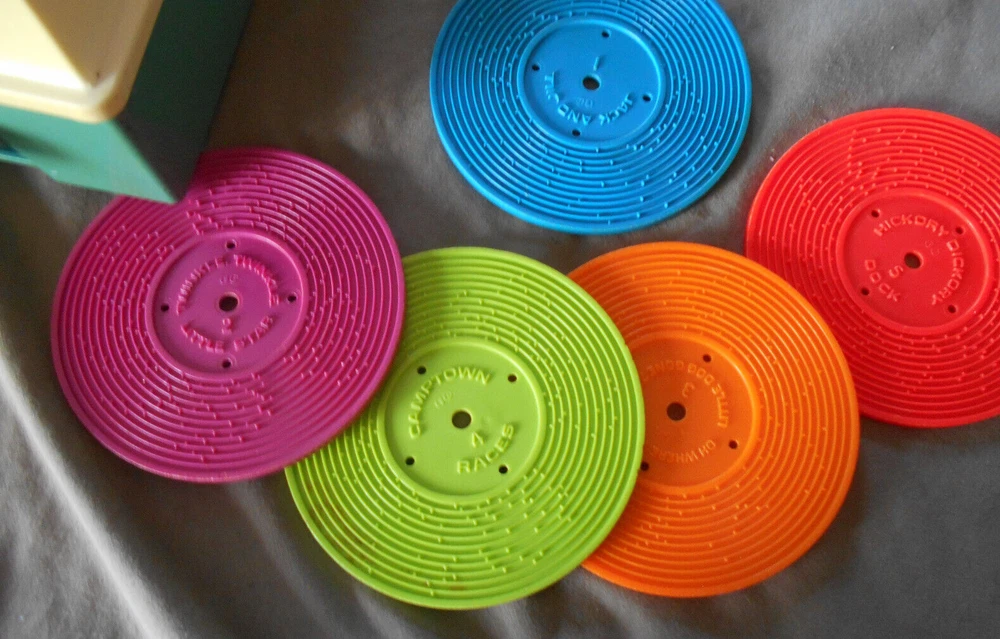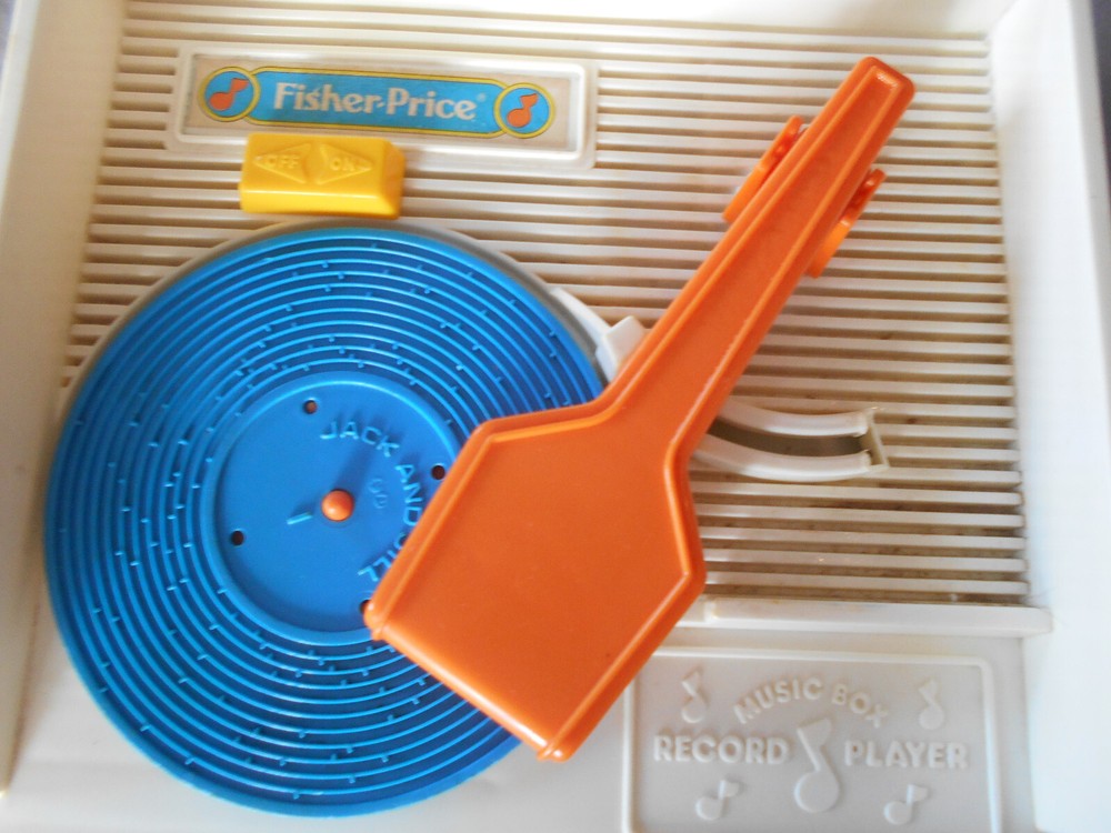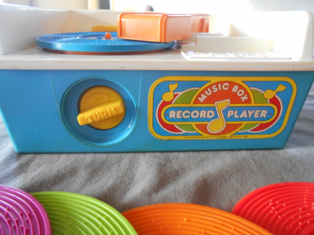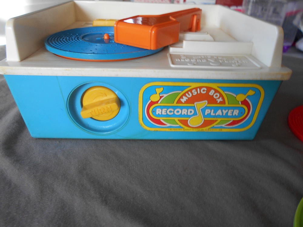 COMES WITH 5 RECORDS W 10 SONGS, 2 SIDED AND MAY NEED SOME GENERAL CLEANING. hAS SOME FADING YOU CAN SEE IN PICS 1. HICKORY DICKORY DOCK, EDELWEISS 2. TWINKLE TWINKLE STAR, AU CLAIRE 3. HUMPTY DUMPTY, JACK AN JILL 4. LONDON BRIDGES, WHERE HAS MY LITTLE DOG GONE? 5. CAMPDOWN RACES, CHILDRENS MARCHING SONG Crafted in 1987, the Fisher-Price Music Box Record Player is a nostalgic ode to classic entertainment. With its vibrant blue and orange hues, this wind-up music box brings a touch of retro charm to any collection. Designed in the United States, it embodies the sturdy, playful aesthetics synonymous with the Fisher-Price brand. This music box is not just a visually appealing piece but a functional gem that has been tested and confirmed to work, allowing you to enjoy the melodic tunes it plays. Its distinctive design, featuring the iconic Fisher-Price character family, makes it a perfect addition for collectors and enthusiasts of vintage toys and music memorabilia.