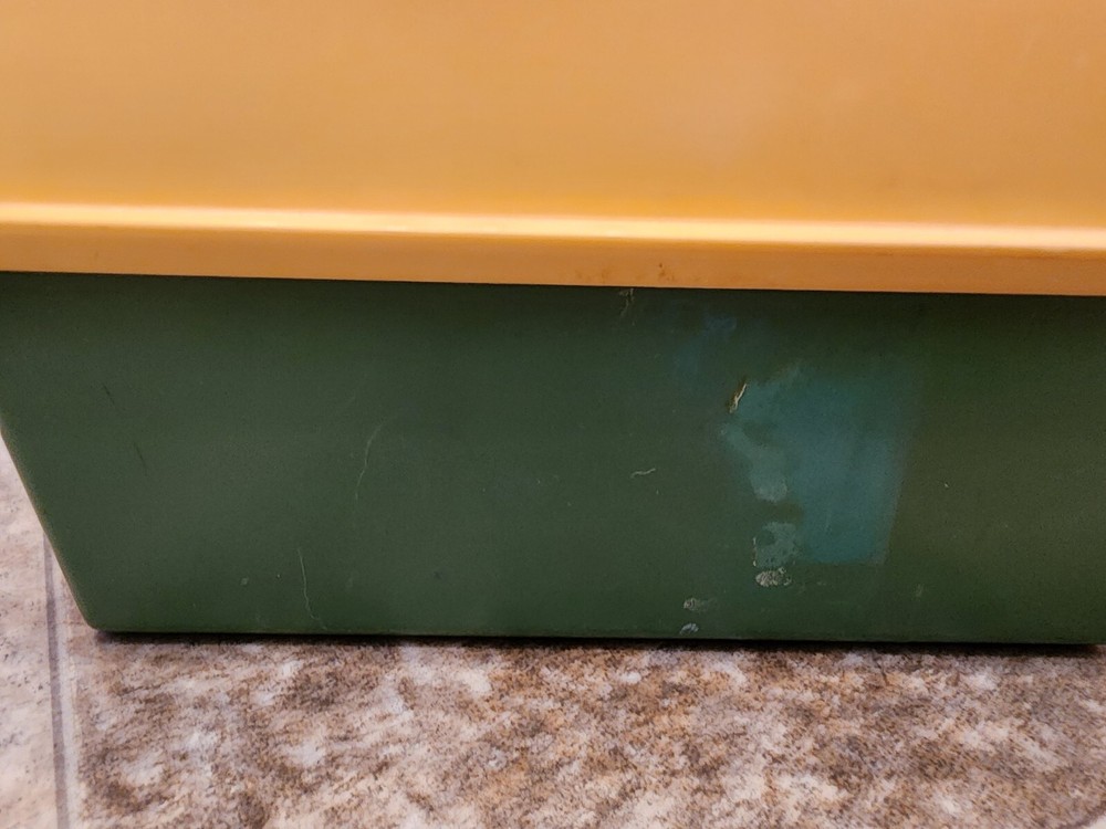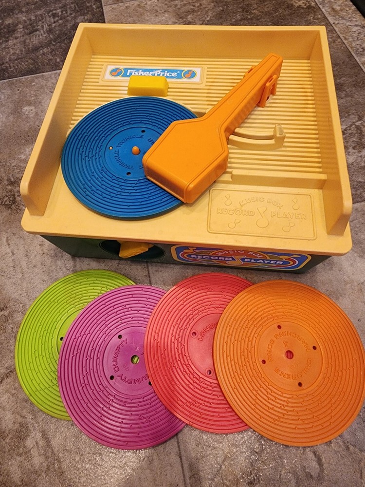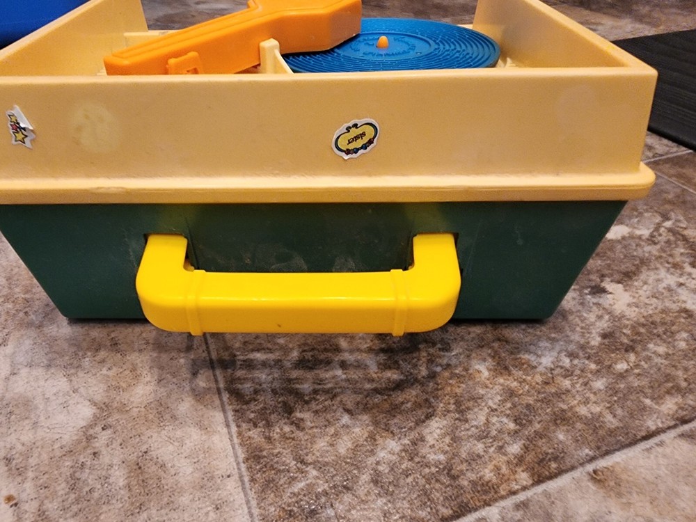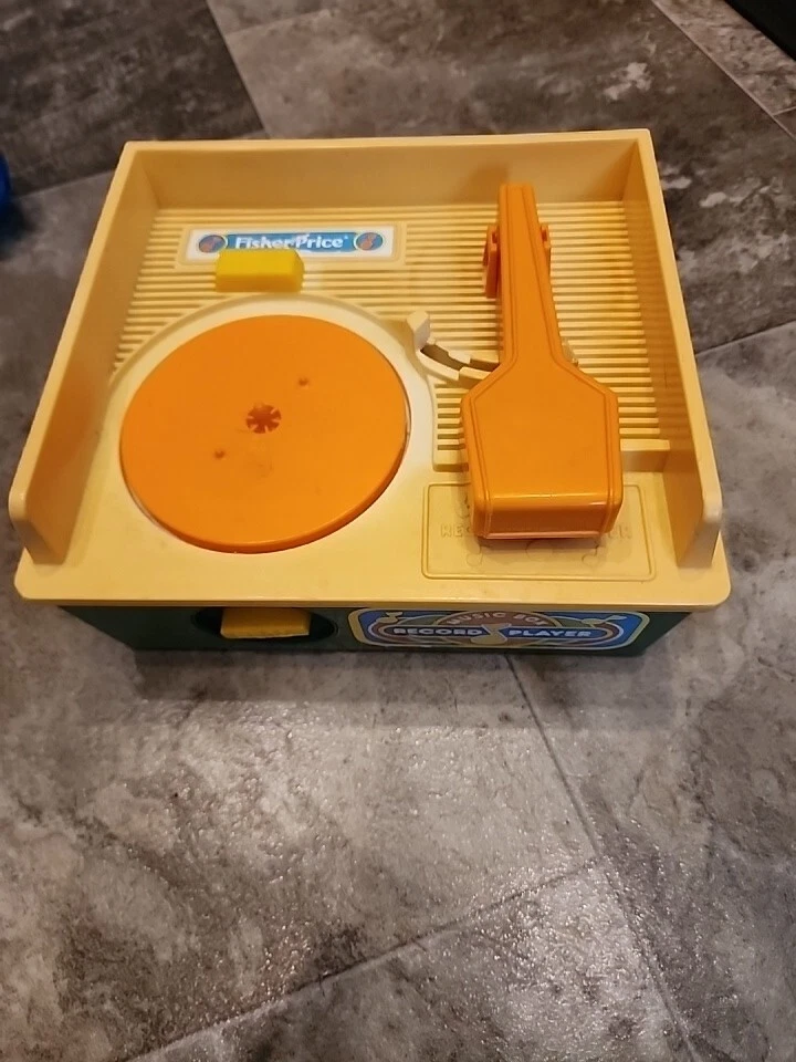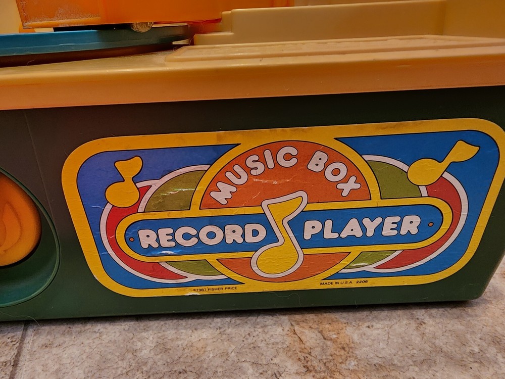 Record player works but plays music slowly. This vintage Fisher-Price music box record player is a gem for collectors and lovers of retro toys. With the ability to hold up to 5 discs, it provides hours of entertainment with its wind-up mechanism. The blue and orange color scheme, along with the music and toy themes, make it a chic addition to any collection. Made in the United States in 1987 by the Division of Quaker Oats, this Fisher-Price record player is a perfect addition to any vintage toy collection. The character family, Fisher Price, is known for its quality and durability, making this player a great find for those who appreciate music and toys.