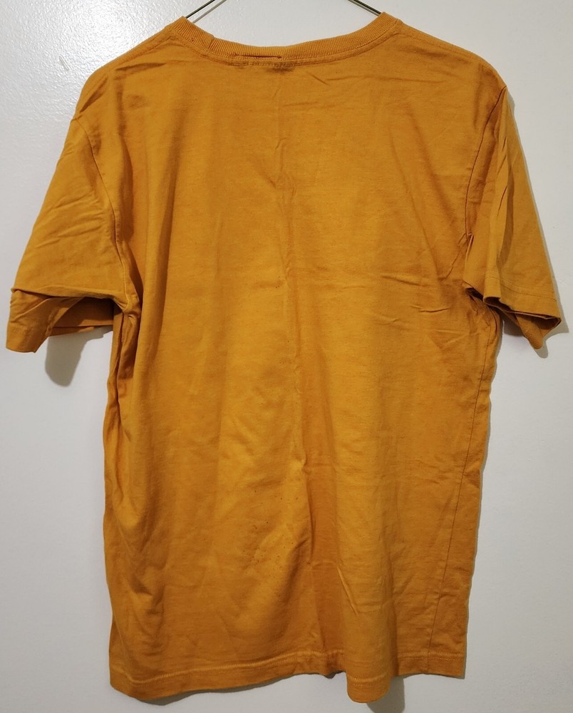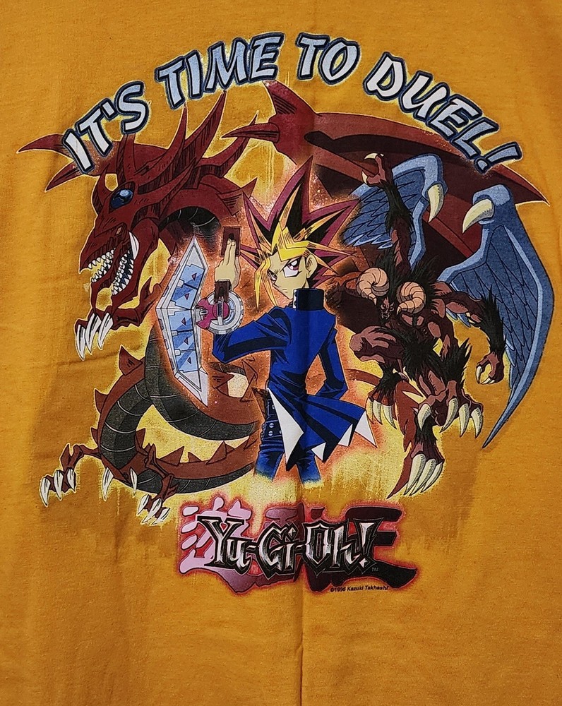 This vintage Y2K t-shirt features a graphic print of the iconic Yu-Gi-Oh! characters, Yugi Muto and Slifer the Sky Dragon. The shirt is made of comfortable jersey fabric and has a regular fit with a crew neckline and short sleeves. It is available in size M and is yellow in color. It measures 20 inches pit to pit and 28 inches long from top of neck hole to bottom hem. Some light spots on lower back, and a couple bu front neck line. The t-shirt is perfect for fans of the anime and movie series, as well as those who appreciate the unique and colorful design. It is also easy to care for and has been preshrunk to ensure that it retains its shape after washing. This item is a must-have for any collector or enthusiast of the Yu-Gi-Oh! franchise. Shipped usps ground advantage.