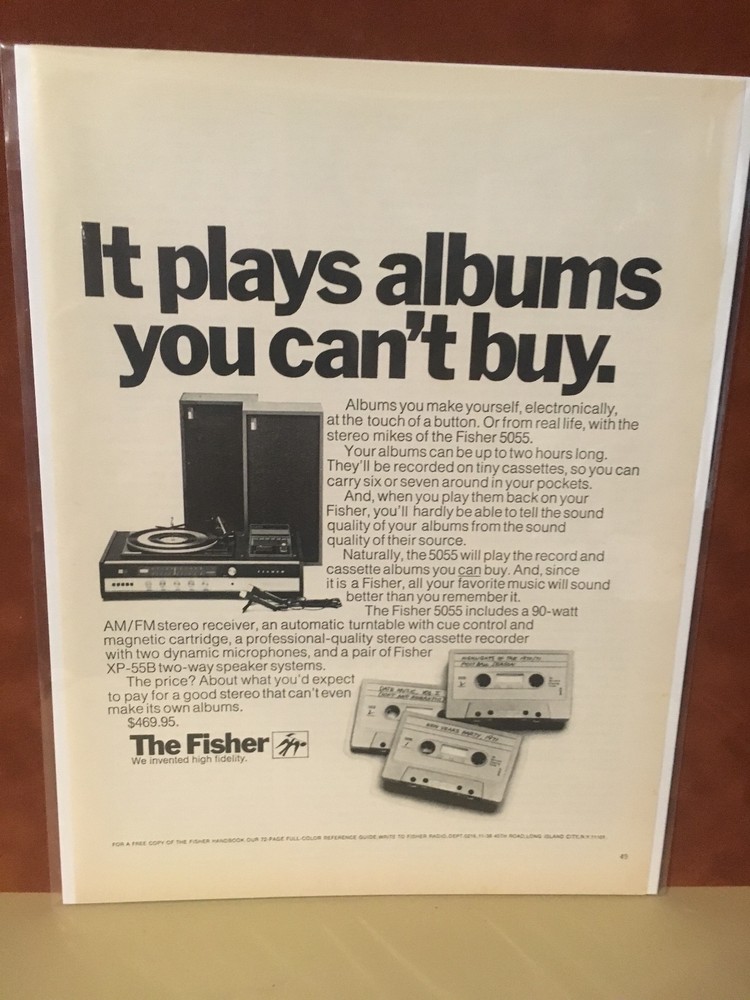Vintage 1970 Fisher 5055 Stereo Receiver/Turntable/Cassette Deck Print Ad Ad is in very good condition with minimum edge yellowing anon creases or tears. **See photo for a visual reference as to the condition of the ad. All ads are bagged and boarded. All ads are sold "as is" NO returns.