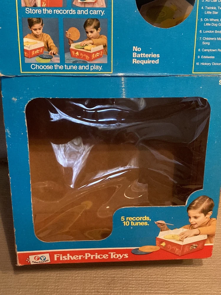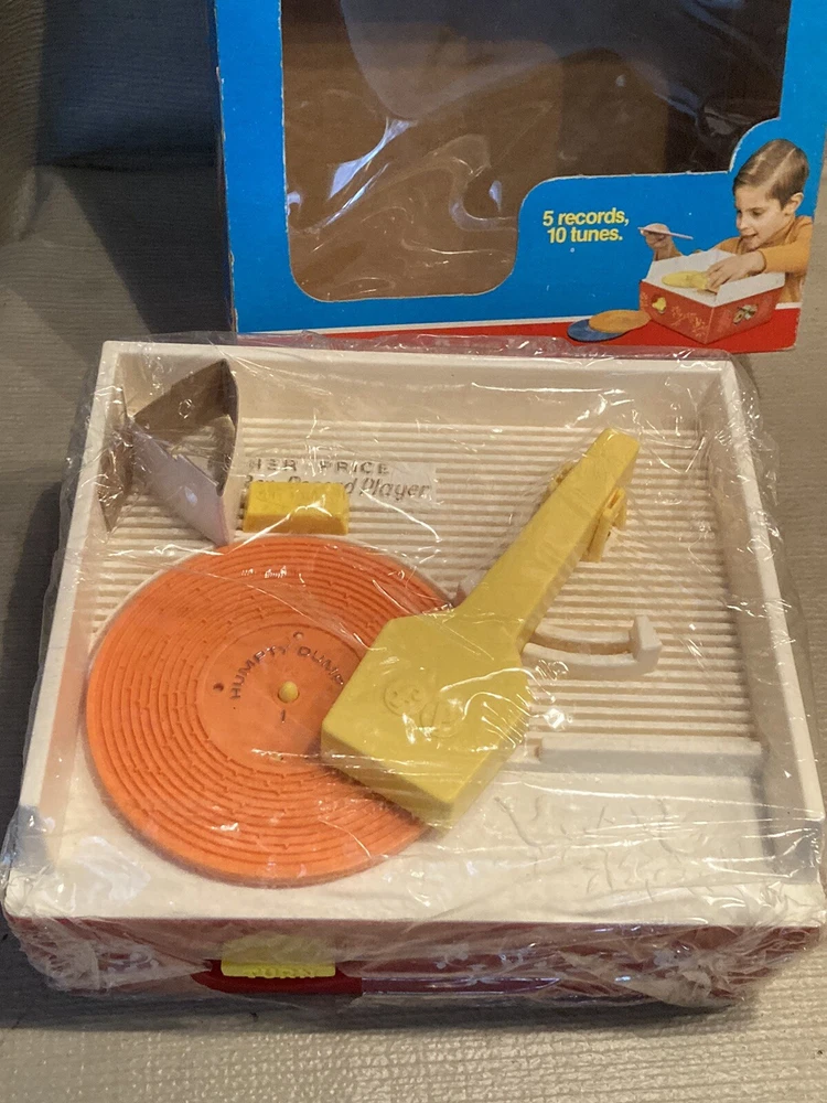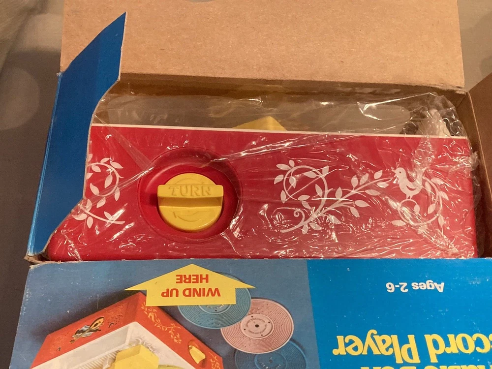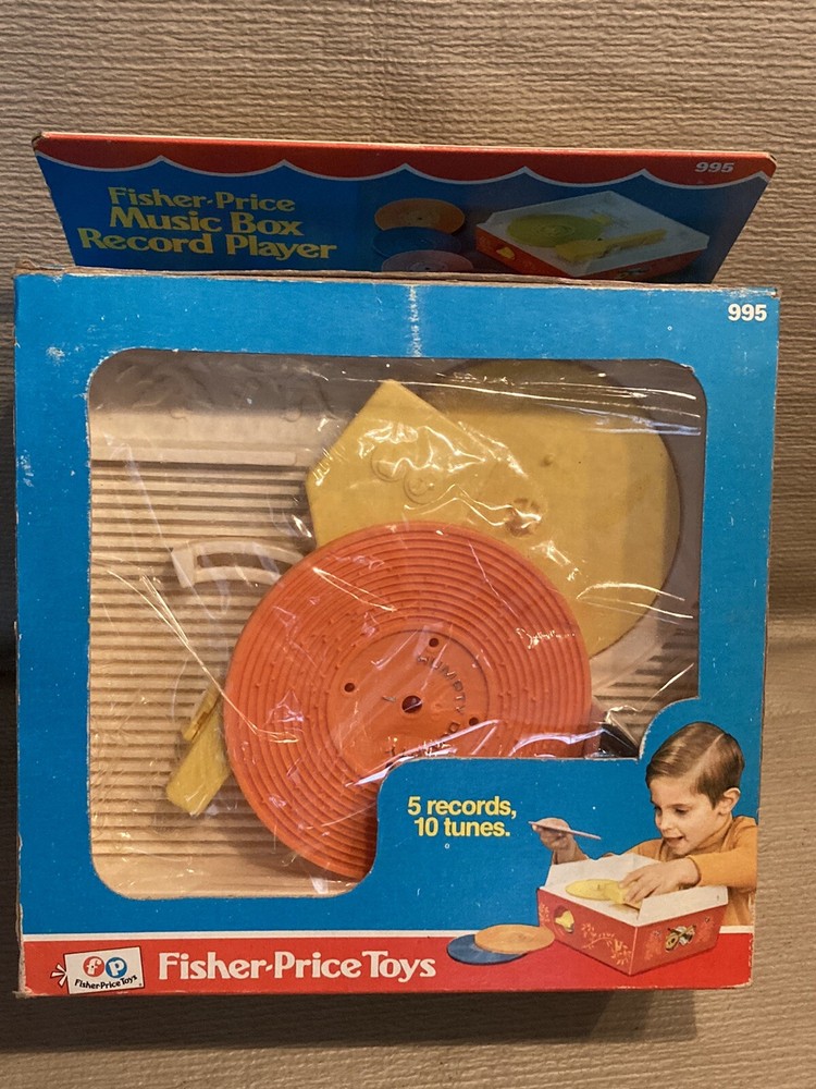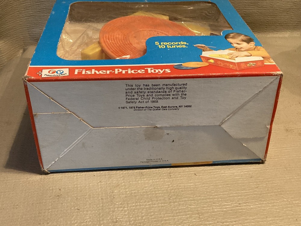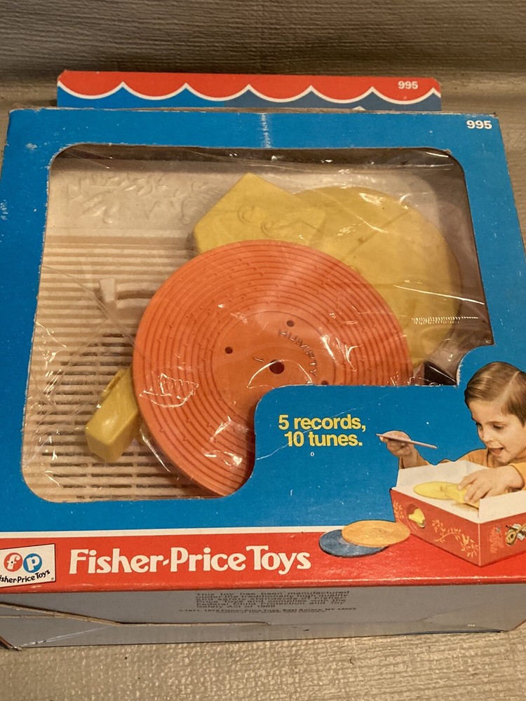 Vintage 1971/1975 Fisher Price Music Box Record Player 995 w/ 5 Records This record player is still in partial shrink/plastic. Box has a little wear, top flap is folded towards the box. Box cellophane is in nice shape. Top record was out of position but I was able to reposition the arm and get the record in place. Record player cranks up and platter spins, makes sounds!! Nice older toy in great condition. Item will be signature required. Let me know if you have any questions or need more pics. Thanks!!