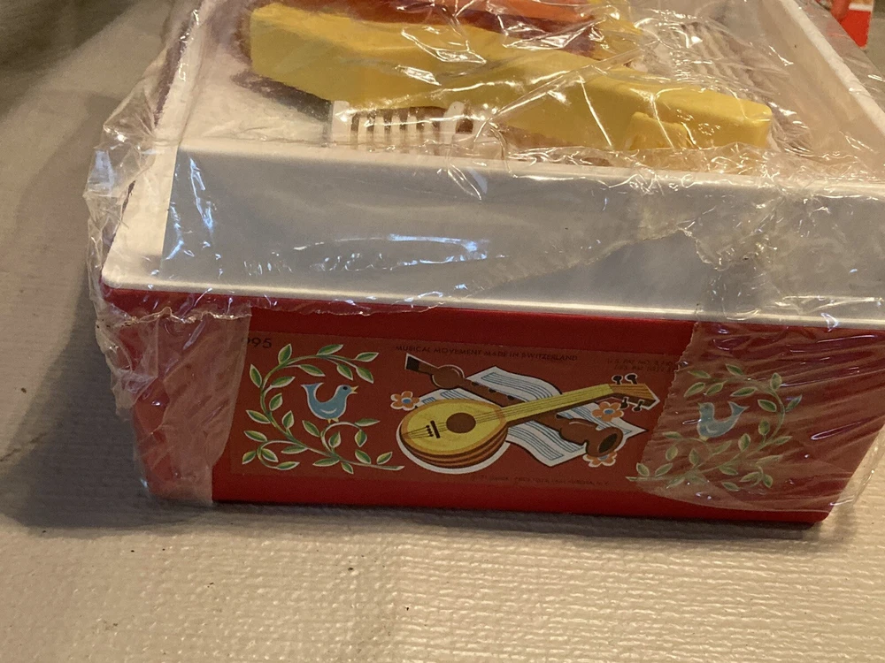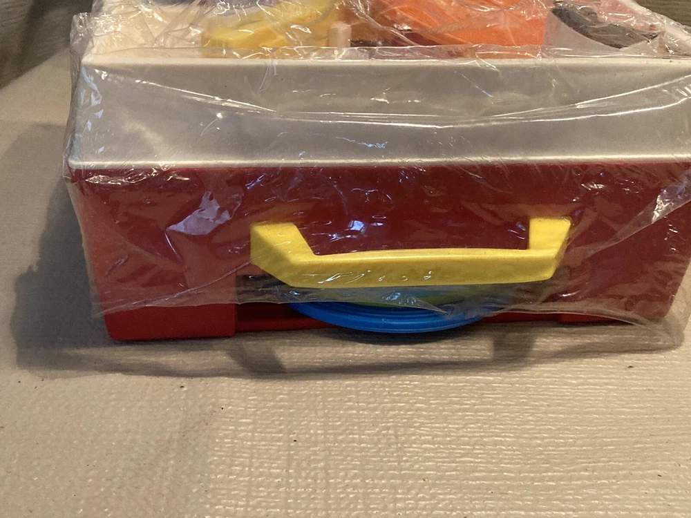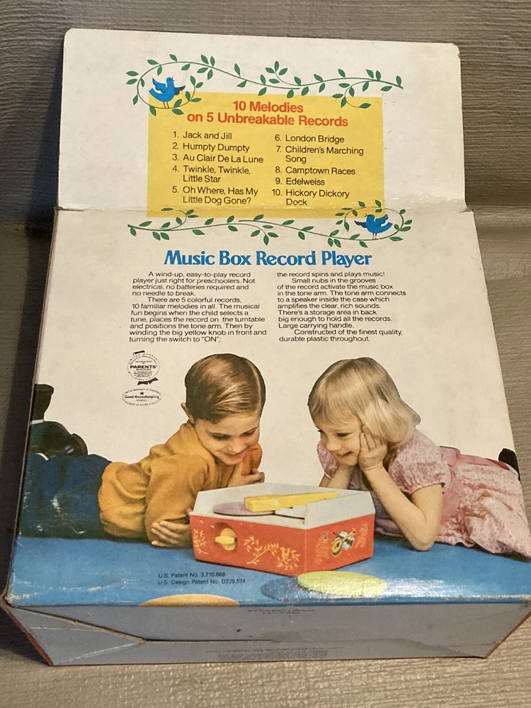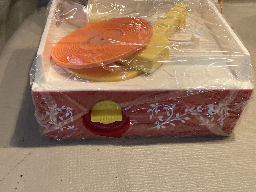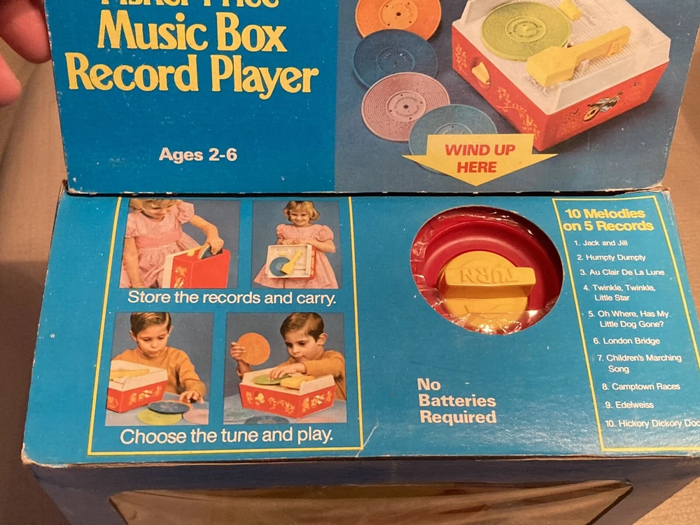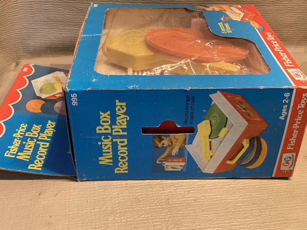 Vintage 1971/1975 Fisher Price Music Box Record Player 995 w/ 5 Records This record player is still in partial shrink/plastic. Box has a little wear, top flap is folded towards the box. Box cellophane is in nice shape. Top record was out of position but I was able to reposition the arm and get the record in place. Record player cranks up and platter spins, makes sounds!! Nice older toy in great condition. Item will be signature required. Let me know if you have any questions or need more pics. Thanks!!
