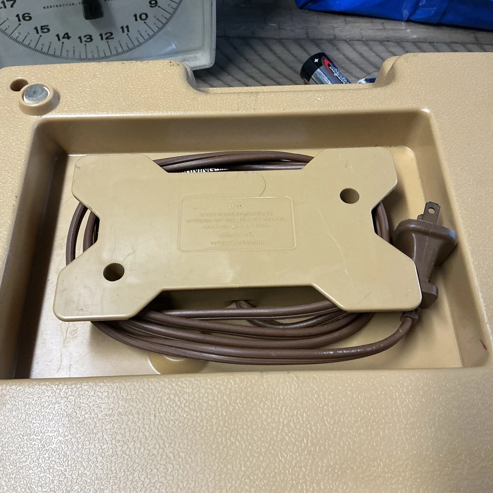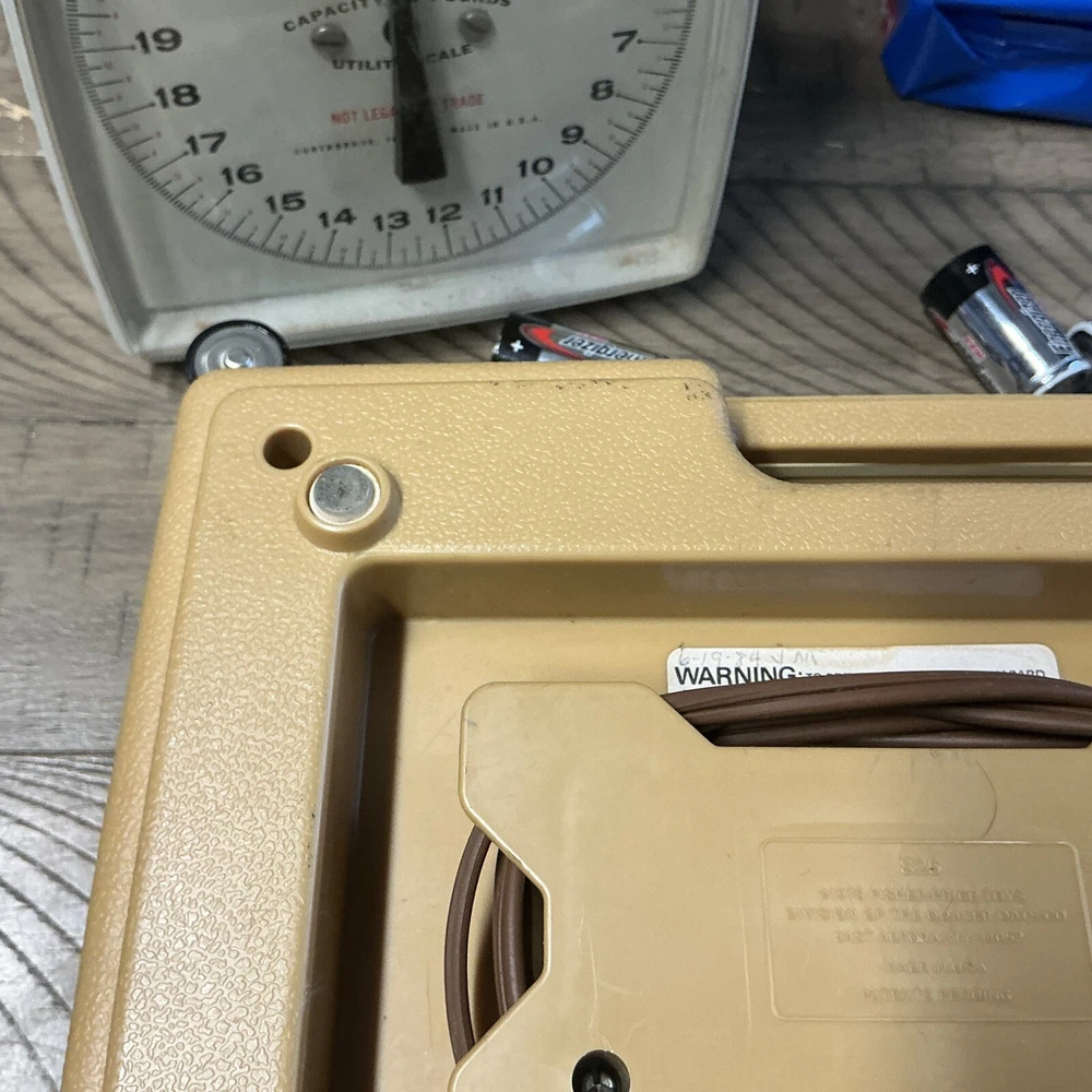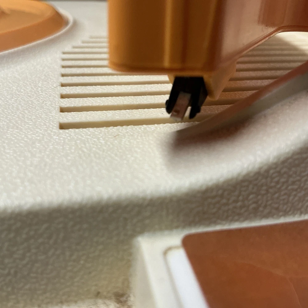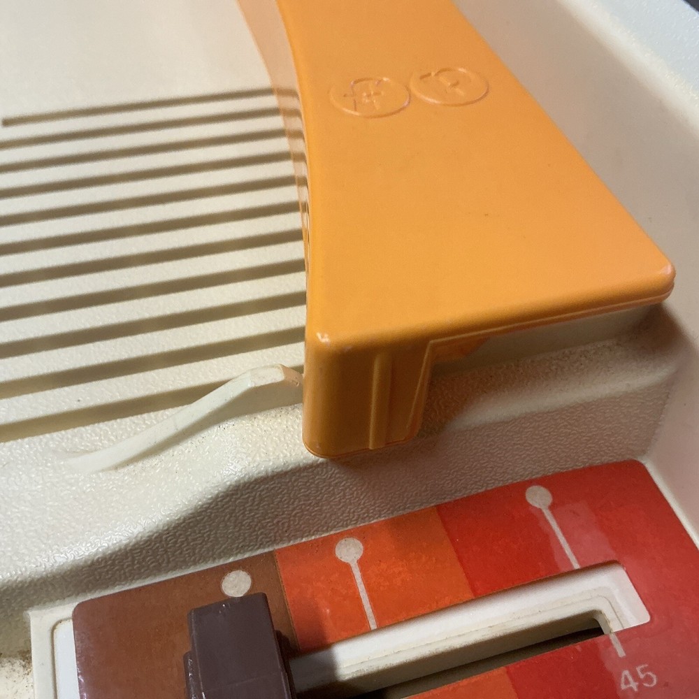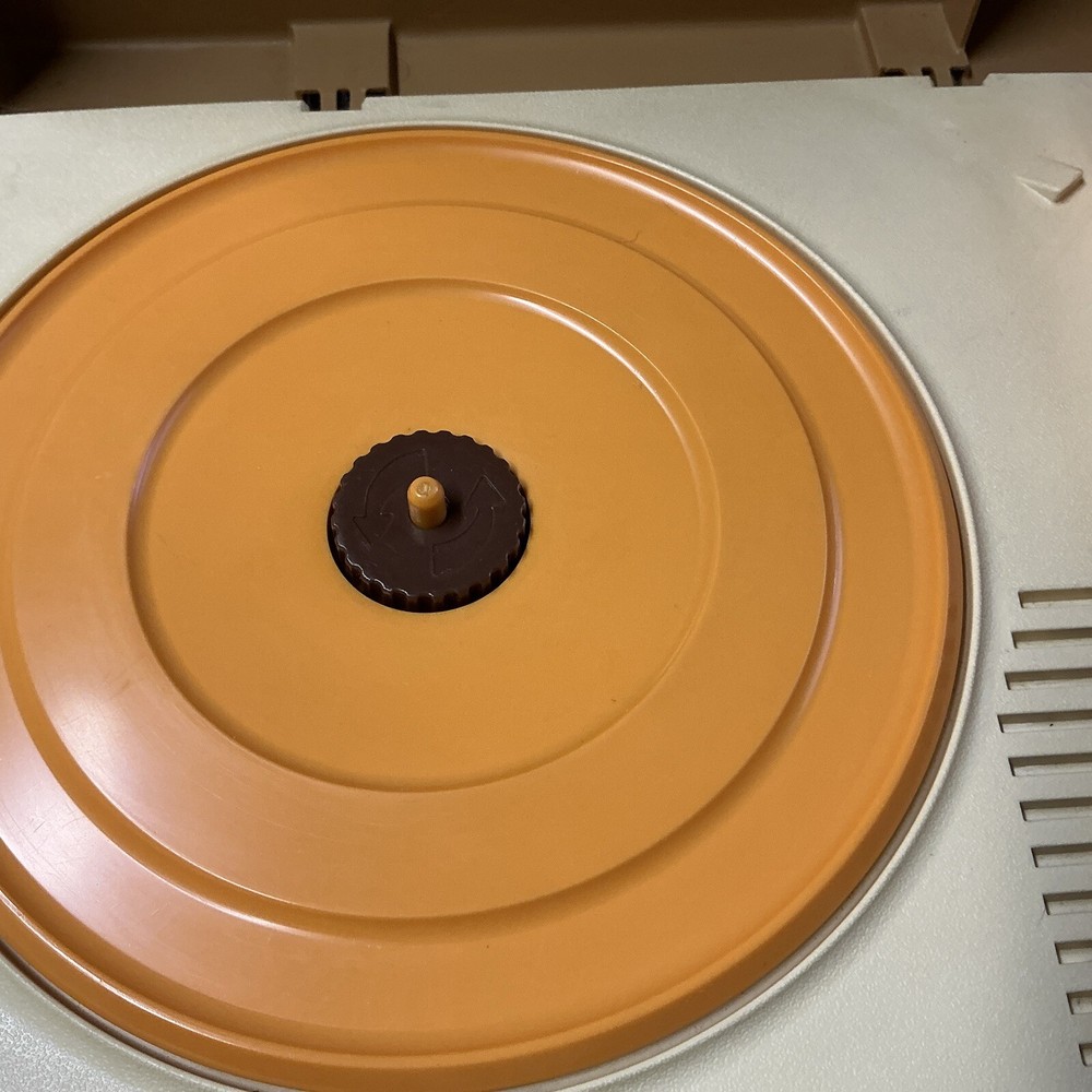 The vintage Fisher-Price Record Player Model 825, produced in 1978, is a kid's phonograph turntable. This classic toy from the well-known brand features a retro design and plays records to entertain children with music. It is a collectible item that offers a nostalgic touch to any toy or music collection. Powers up and table spins at both speeds. Unable to test sound (no records available) Sold as is