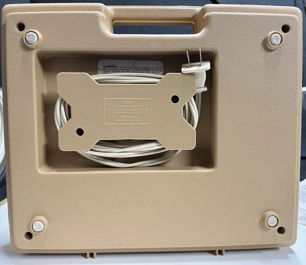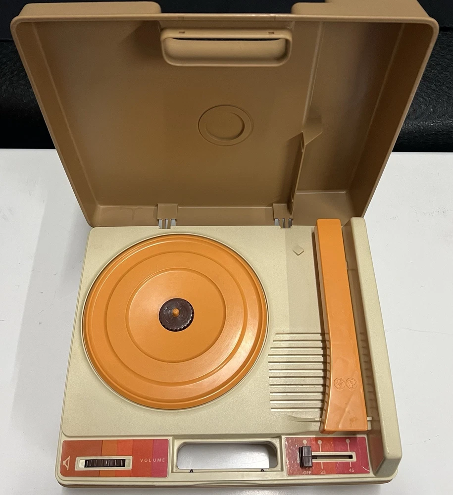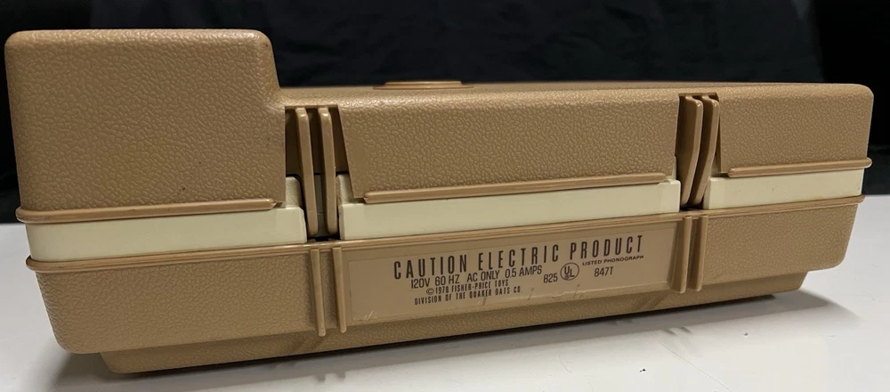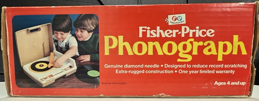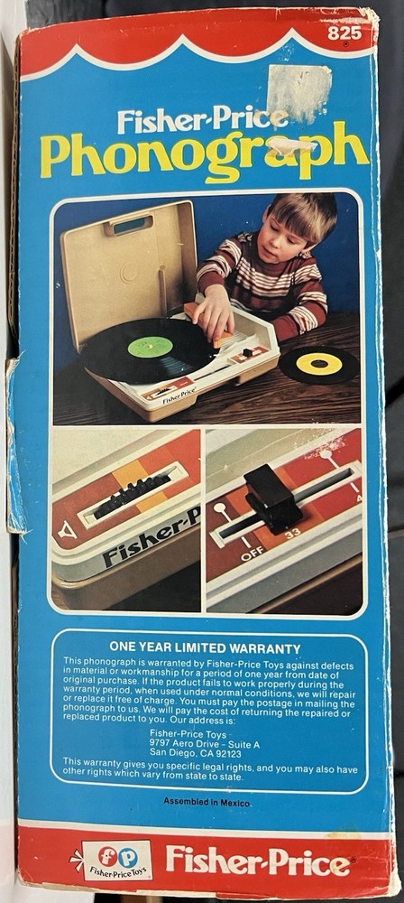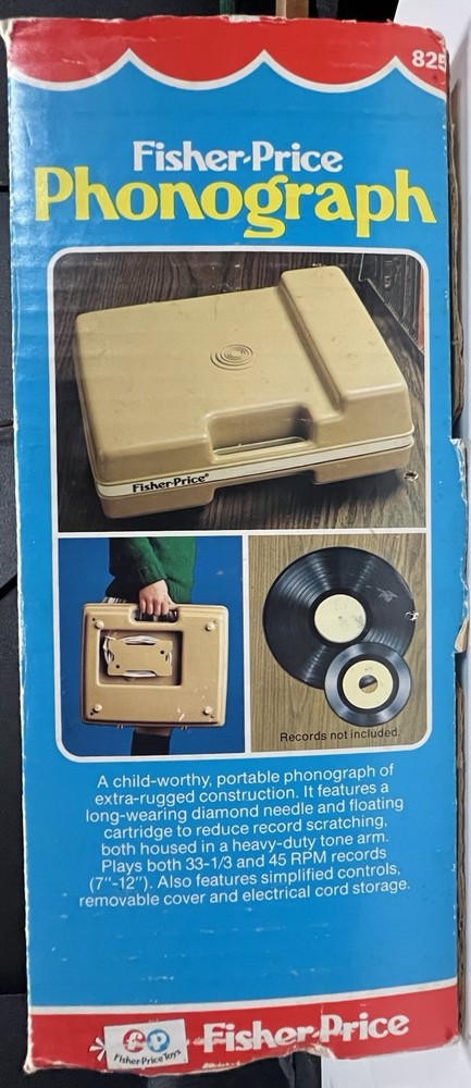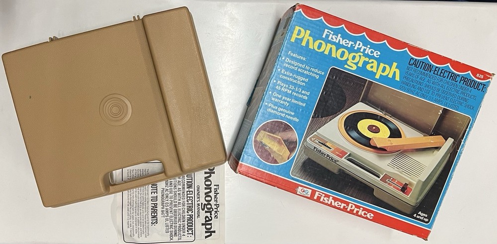 Vintage 1978 Fisher Price Record Player Turntable #825 Plays both 33 and 45 rpm records This is in excellent condition and has been safely stored in its original box. It plays and makes sound but it skips/skates so the stylus needs replacing. It turns on and spins -volume and speed controls are also in working order. The original stylus /needle will need to be replaced. Box says: Fisher Price Phonograph It's easy lo play, portable, stylish and made to last a whole long childhood. Floating cartridge system with diamond needle. To minimize audible scratches a spring-mounted floating cartridge assembly is designed to withstand a child's handling of the tone arm, without seriously damaging the record. Diamond needle gives five times the playing life of the needle commonly used in most other childrens phonographs. Snap-off cover 4-inch speaker Extra-rugged tone arm Electrical cord storage Diamond needle Sturdy molded base On/Off, Speed control Turntable with built-in adapter plays 33⅓ and 45 rpm records UL LISTED 847T ELECTRONIC PHONOGRAPH 120V 60 HZ AC ONLY. 0.5 AMPS Assembled in Mexico 01979 Fisher-Price Toys, San Diego, Callfornia 92120 Division of The Quaker Oats company Stamped on back of the box with 810706