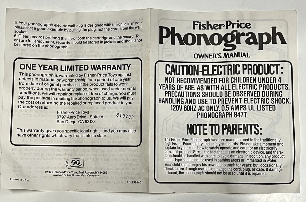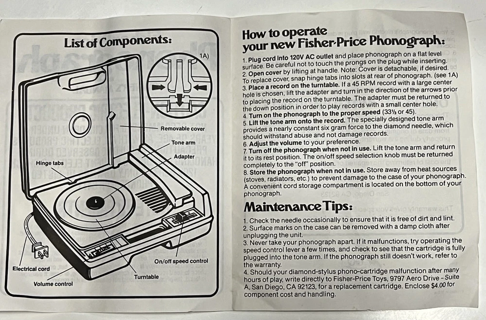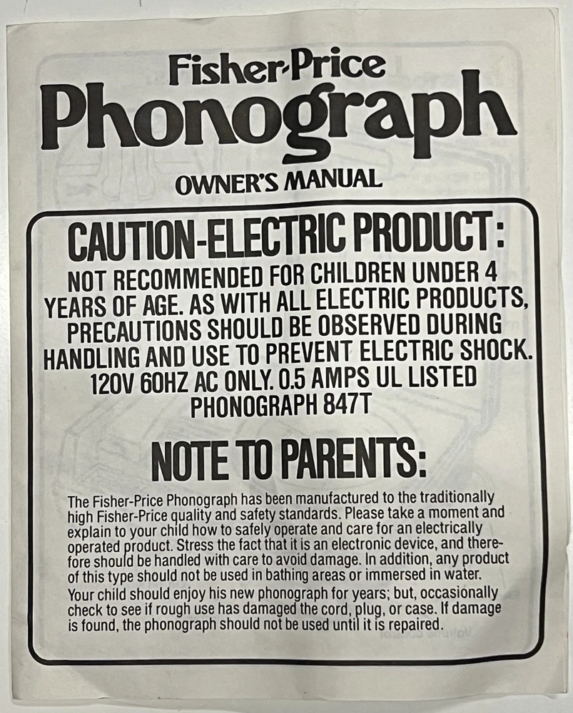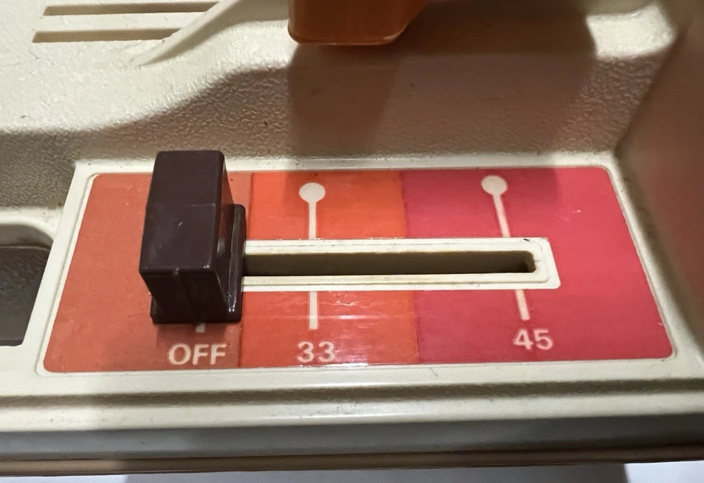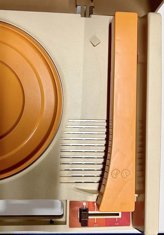 Vintage 1978 Fisher Price Record Player Turntable #825 Plays both 33 and 45 rpm records This is in excellent condition and has been safely stored in its original box. It plays and makes sound but it skips/skates so the stylus needs replacing. It turns on and spins -volume and speed controls are also in working order. The original stylus /needle will need to be replaced. Box says: Fisher Price Phonograph It's easy lo play, portable, stylish and made to last a whole long childhood. Floating cartridge system with diamond needle. To minimize audible scratches a spring-mounted floating cartridge assembly is designed to withstand a child's handling of the tone arm, without seriously damaging the record. Diamond needle gives five times the playing life of the needle commonly used in most other childrens phonographs. Snap-off cover 4-inch speaker Extra-rugged tone arm Electrical cord storage Diamond needle Sturdy molded base On/Off, Speed control Turntable with built-in adapter plays 33⅓ and 45 rpm records UL LISTED 847T ELECTRONIC PHONOGRAPH 120V 60 HZ AC ONLY. 0.5 AMPS Assembled in Mexico 01979 Fisher-Price Toys, San Diego, Callfornia 92120 Division of The Quaker Oats company Stamped on back of the box with 810706
