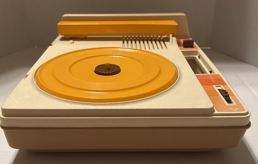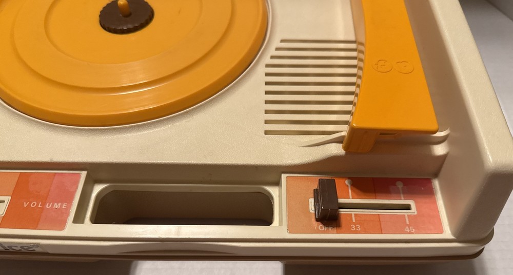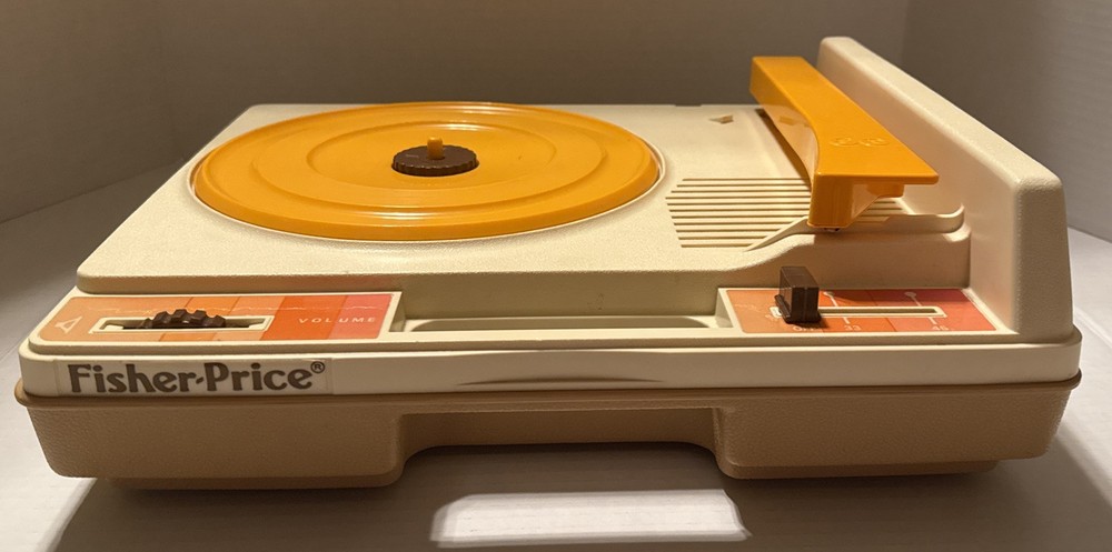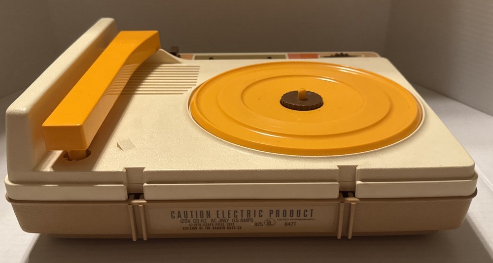 The Vintage 1982 Fisher-Price Record Player #825 is a portable phonograph that plays 33 and 45 rpm records. Designed for children ages 3-7, it is a classic toy in the Fisher-Price brand, suitable for preschoolers and young children to enjoy music and play pretend with. This toy is fully operational and works as intended. Record player does not have cover and needs new needle. It does work!