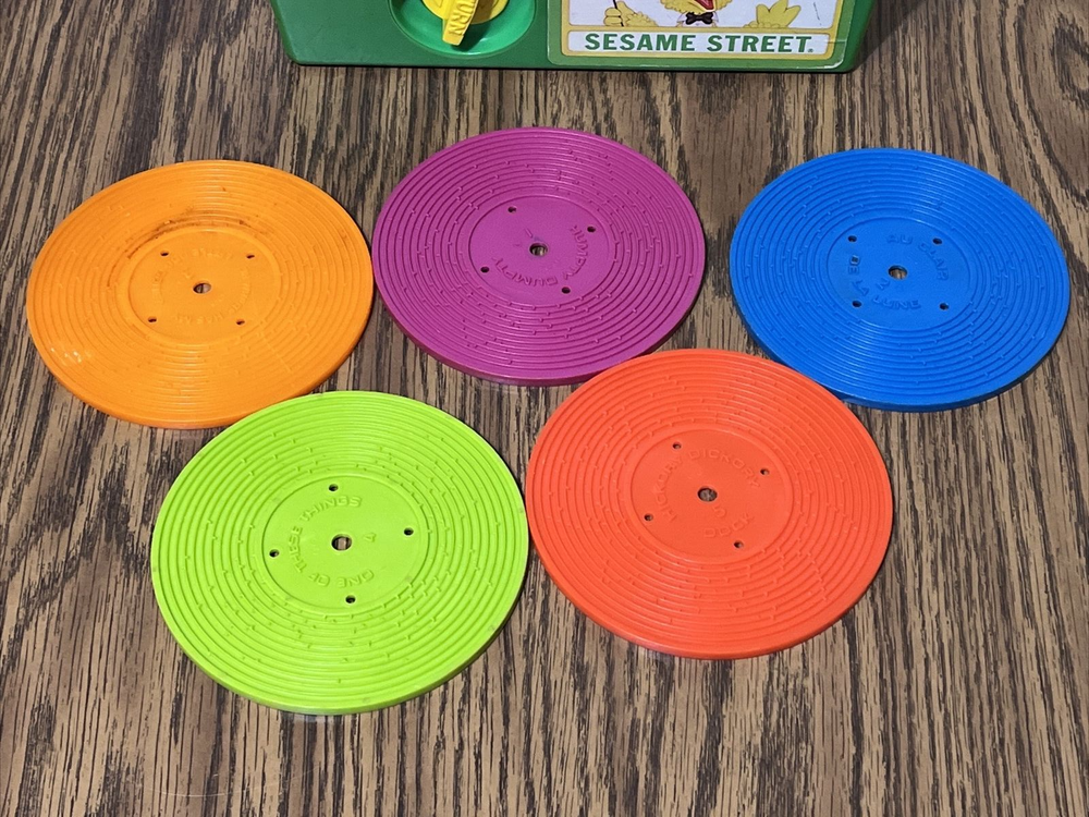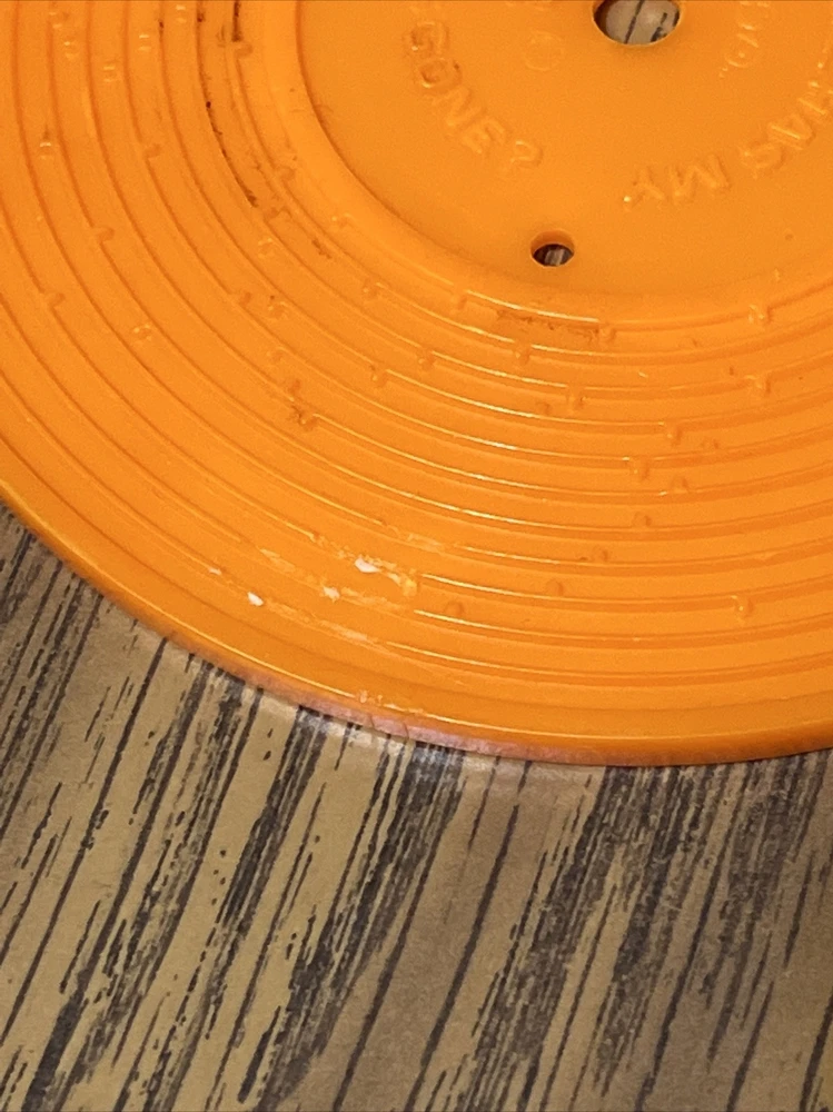 Works! Has some marks and scratches (see photos). I did not attempt to remove them for fear of damaging this neat collector's item. All 5 records are present. The orange one has more wear than the other and some of the "threads" are missing in a spot (see last photo). Please see photos as they are part of the description. I have taken pictures from multiple angles so you can see the condition of this item. Please feel free to ask questions. Thank you for looking!