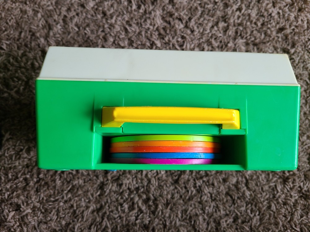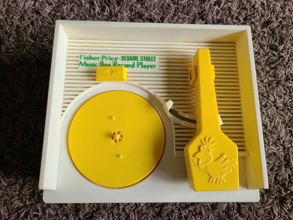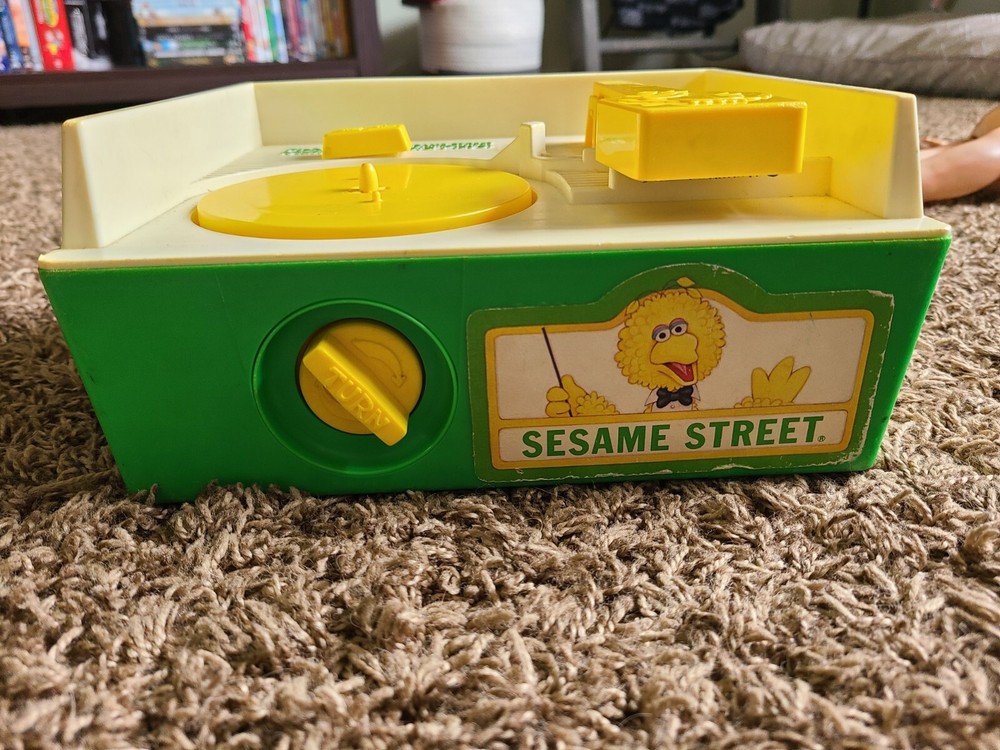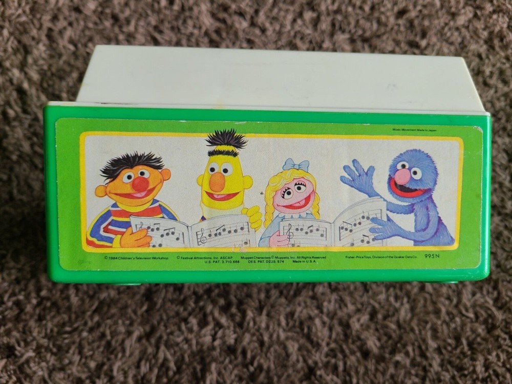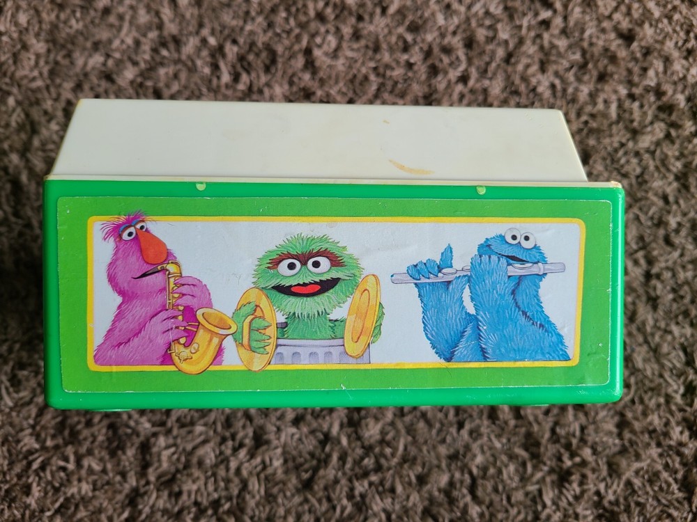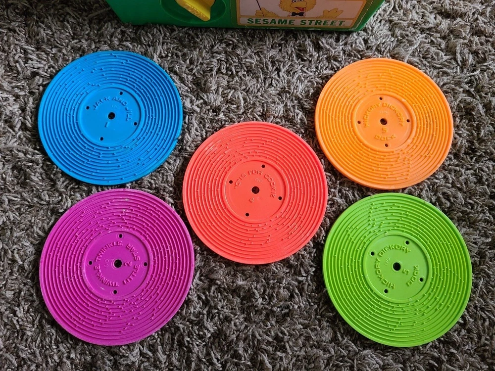 Vintage 1984 Fisher Price Sesame Street Music Box Record Player. Music box in working condition. Has and plays 5 records, however, the orange and the green ones are the same (missing the record numbered 3). Please see pictures for specific item condition.