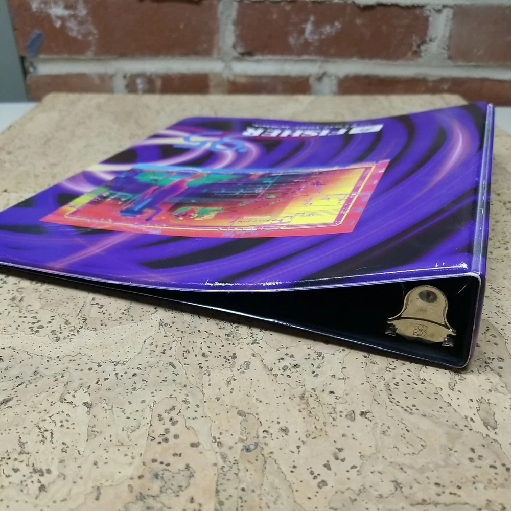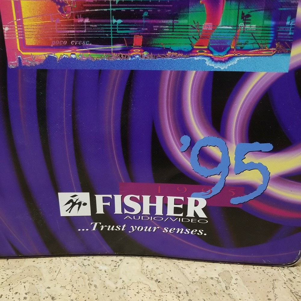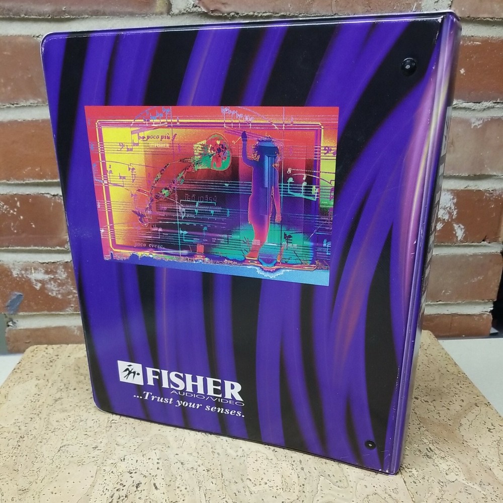 Vintage 1995 Fisher Audio/Video 3 Ring Sales Binder. Trust Your Senses. 1 1/2" binder. Pocket plus salesperson card pocket inside front cover. Three ring binder functions well. Some edge wear. Same graphics front and back. Front cover has a curve from being stored empty. Please see photos for detailed description.