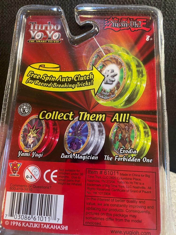This vintage 1996 Yu-Gi-Oh! Turbo Yo-Yo features the iconic character Exodia The Forbidden One in a neon yellow color scheme. The collectible item is a must-have for any fan of the Yugioh franchise and animation merchandise. The item is in great shape and ready for display or play.