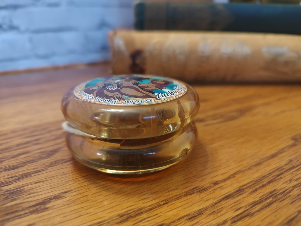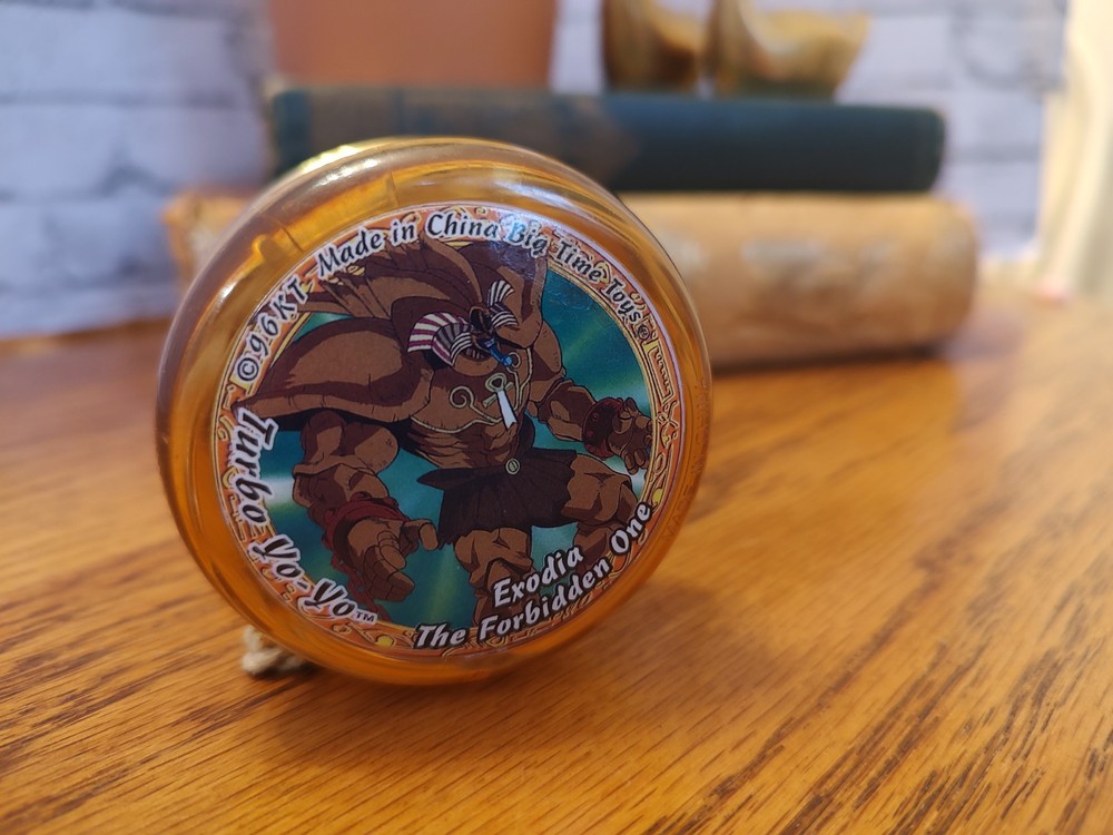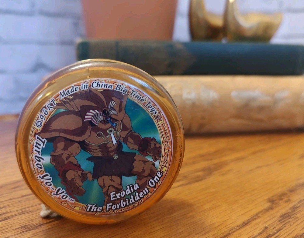 This vintage Yu-Gi-Oh! Turbo Yo-Yo features Exodia The Forbidden One from the Series 1 collection. Made from a combination of plastic and metal, the yo-yo measures 2.5 inches in height and 1 inch in width. It was manufactured in China in 1996 and comes in a neon yellow color. The yo-yo is in great shape and is a perfect addition to any Yugioh fan's collection. The TV show and franchise are also included in the aspects section for clarification. The Big Time toys manufactured this yo-yo. I don't know if it's supposed to do something like light up? It has things on the inside. Don't know that much about it I know it does go up and down like the yo-yo that's as far as I've tested it. Smoke free pet free home