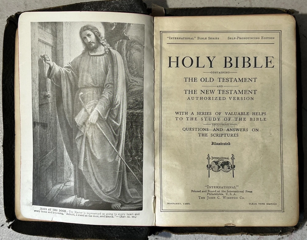 Vintage Holy Bible Self-Pronouncing John C. Winston International Bible Series Publication date unknown, but my guess is somewhere around 1905. THE OLD TESTAMENT AND THE NEW TESTAMENT AUTHORIZED VERSION WITH A SERIES OF VALUABLE HELPS TO THE STUDY OF THE BIBLE INCLUDING: QUESTIONS AND ANSWERS ON THE SCRIPTURES Illustrated Acceptable condition for its age See pictures for additional information and condition.