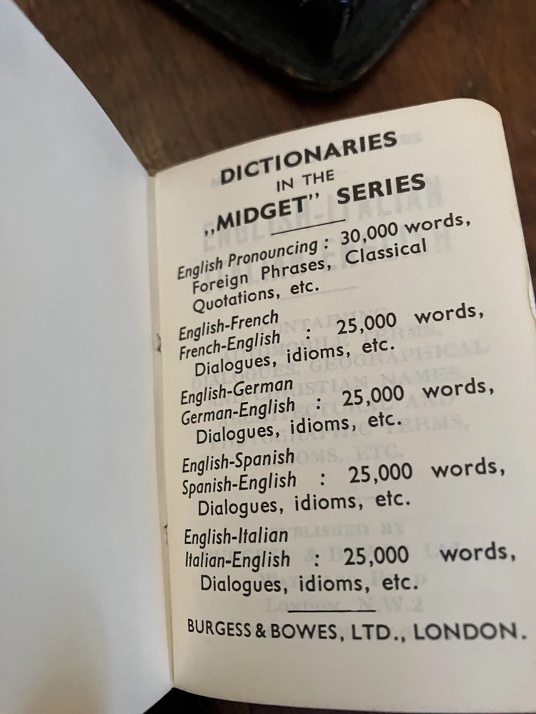Set of ‘midget’ European language dictionaries by Burgess & Bowes. Bound in high-quality black leather case. Lovely quality vintage item. Very good condition for age, please do see photos and contact me if any specific questions. English - Italian English - French English - German English - Spanish
