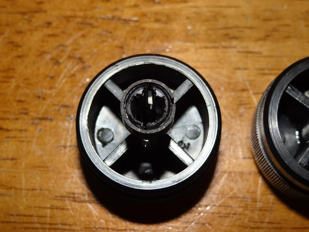 Two knobs from Fisher 28 turntable. 1-1/8" diameter. Good condition. Picture show actual items for sale. Thanks for looking!