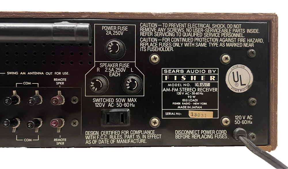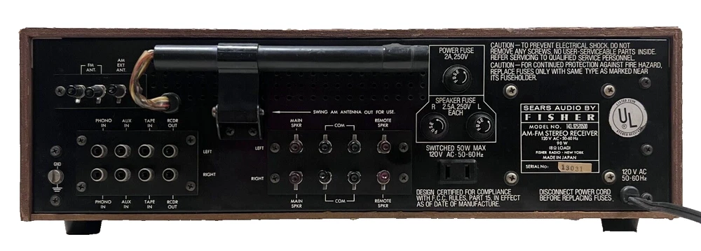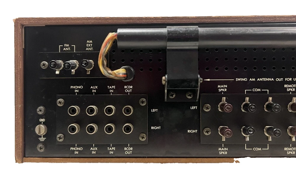 Our Restoration Procedures: 1. Check Out The Stereo, If There Is Anything Wrong, We Will Fix It. 2. Clean & Lubricate All Of The Switches & Controls. 3. Electrolytic Capacitor Check, If There Is Any Weak One, We Will Change It. 4. FM IF & MPX Circuit Alignment By Using A Sweep Signal Generator & Victor Scope. 5. Change Burned Lamps. 6. Check Out & Adjust Power Amplifier's Center Voltage & Standby Current. 7. Audio Frequency Response & Distortion Test. 8. Clean All Of The Knobs By Ultrasonic Cleaner. 9. Functional Check. 0. All Sales We Give A 90-Day Labor & Parts Warranty, If There Is Any Problem, You Send It Back We Will Repair It For You Free Of Charge, You Pay The Send-In Postage, We Pay The Send-Back Postage. Specifications Tuning range: FM, MW Power output: 20 watts per channel into 8Ω (stereo) Frequency response: 20Hz to 20kHz Total harmonic distortion: 0.5% Input sensitivity: 2mV (MM), 150mV (line) Signal to noise ratio: 60dB (MM), 70dB (line) Channel separation: 40dB (line) Dimensions: 6-1/16 x 19-1/8 x 13-1/8 inches