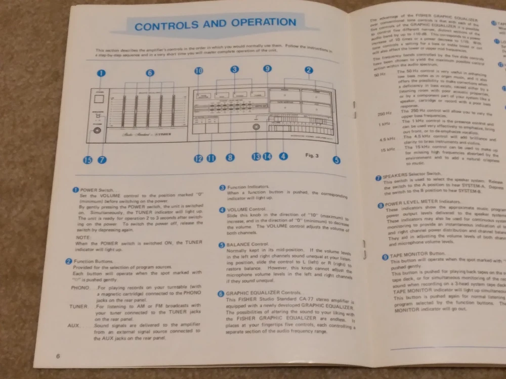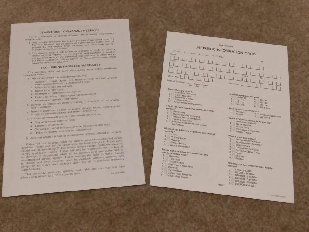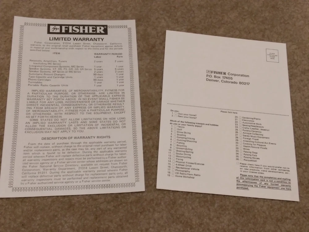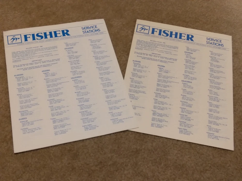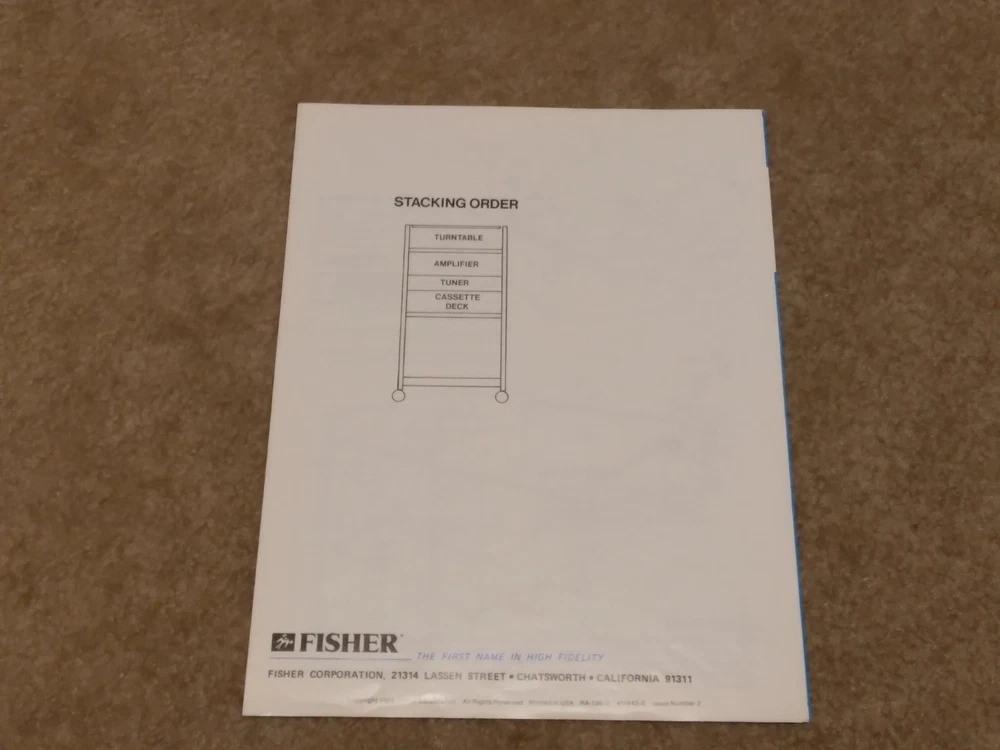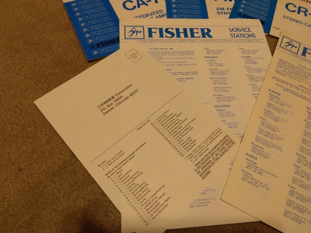 *All ORIGINAL* *Vintage Fisher Studio Standard Paper Work ONLY* (8 Pieces) ~CA-77 Integrated Stereo Amplifier Operating Instructions Manual ~FM-77 AM/FM Stereo Synthesizer Tuner Operating Instructions. ~CR-77 Stereo Cassette Deck Operating Instruction Manual.. ~RA-136-2 Component Cabinet Assembly Instructions & Part List. ~Fisher Service Station Locations Booklet (X 2).. ~Fisher Corporation Personal Information Card.. ~Fisher Limited Warranty Card.. **NO Receiver or any other equipment is included** ...[ Excellent Condition ]... *Selling as is and sale is final with no warranties, guaranties or adjustments and no returns... Sale Is Final... *See our other listings for more Vintage Stereo Stuff* Classic Audio Video & Stereo 3315 Harrison Ave. Cincinnati, Ohio 45211.......... [West Side, Cheviot Westwood Area] SALE IS FINAL with NO RETURNS ....................................................................................... See our other listings or stop in our store for more vintage Stereo and Turntables, Record albums, 8 track, Reel to Reel, VHS, Beta... ETC. 3315 Harrison Ave. Cincinnati, Ohio 45211 ........................................ Thank You.