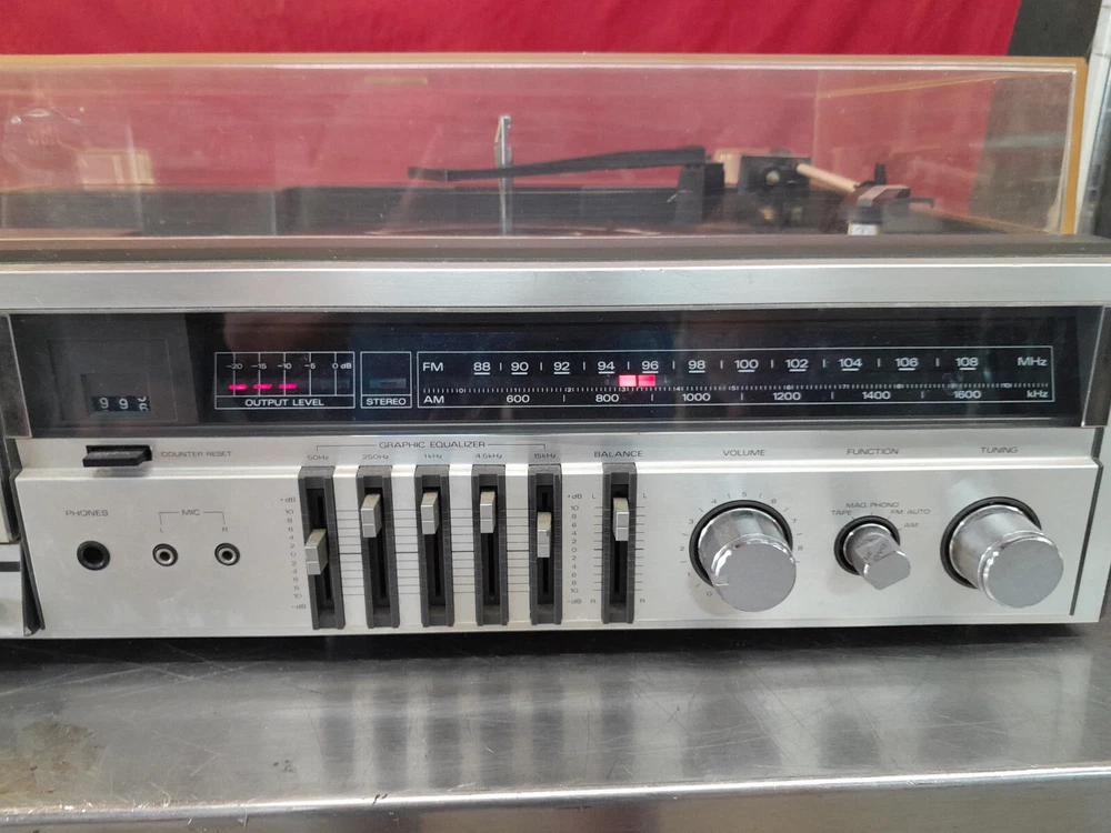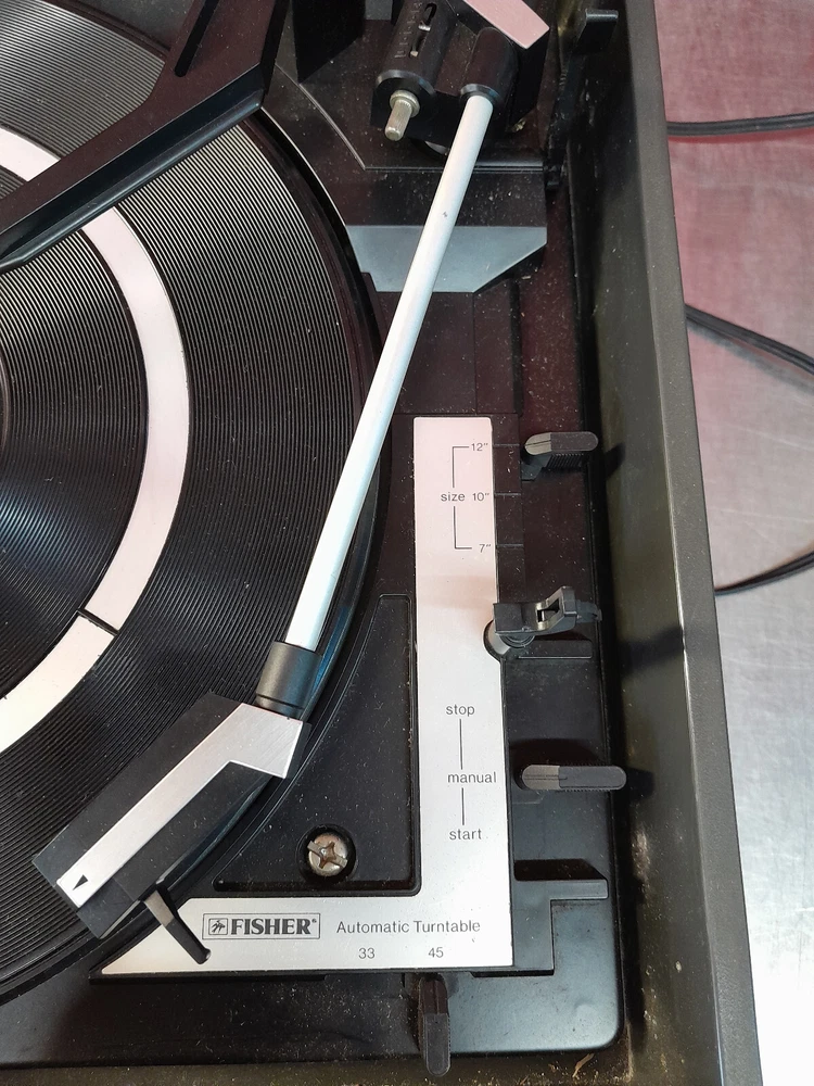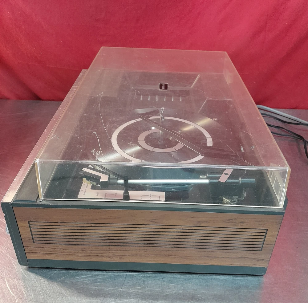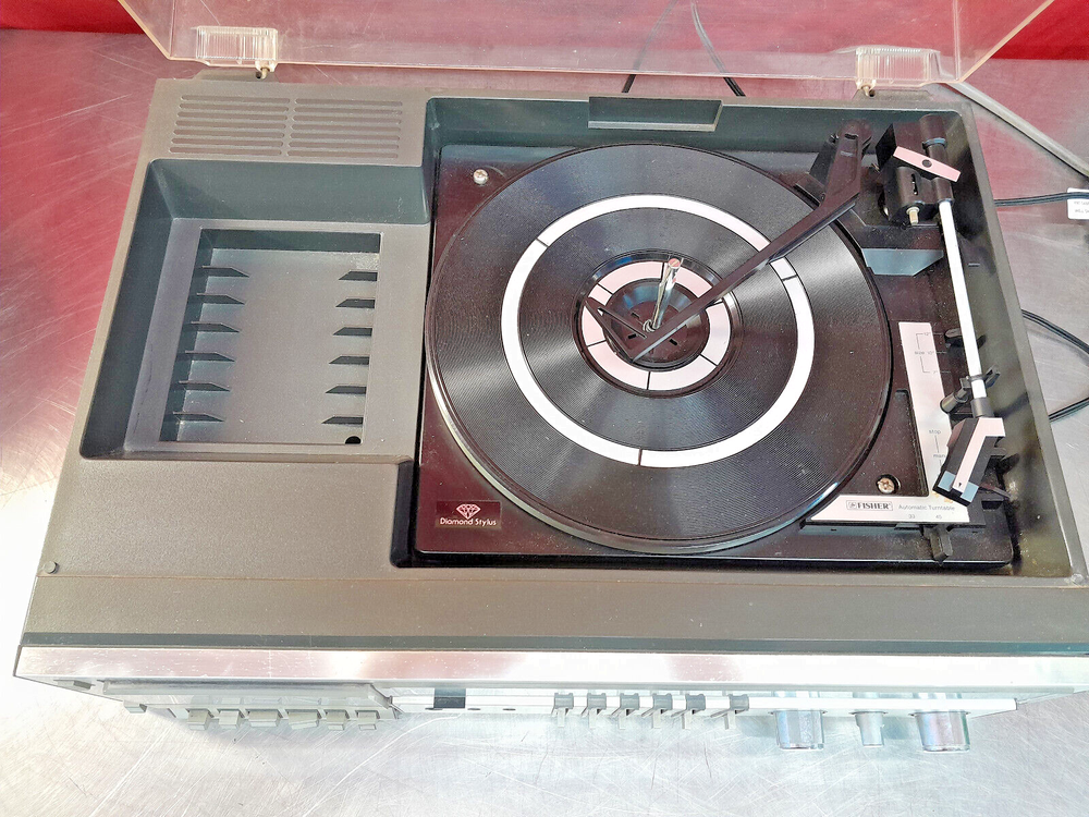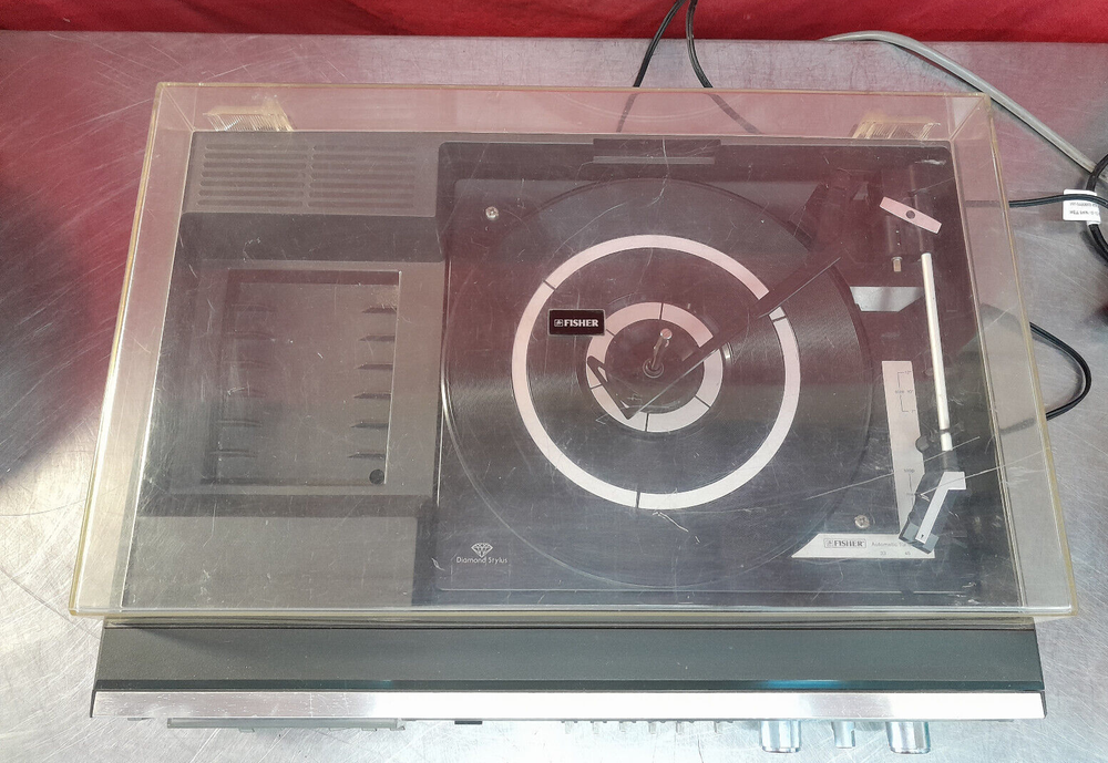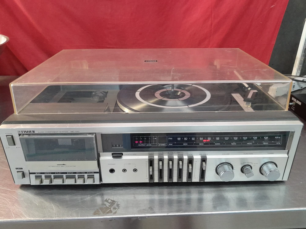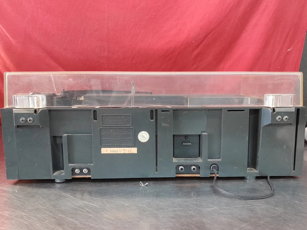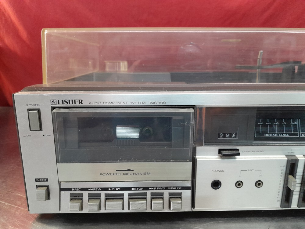 Vintage Fisher MC-510 Audio Component System Record Player Tape AM/FM Parts Onlyy Condition: Parts - Cassette deck works, turntable not working, the tuning knob is freewheeling, sound works, lights work, may need a belt for the turntable. The power turns on. The tape player spins, but it sounds like it is under water. The Record player aspect of this does not seem to work at all. It no longer turns and the tone arm that holds the cartridge is loose. The radio picks up frequencies, but unfortunately the dial to tune into specific channels turns but does nothing.The dust cover is in good condition. There is a bit of discoloration along with a couple of scratches and what looks to be like a spot where it melted. Please see all pictures for condition of item. FAST SHIPPING Local Pick Up Available Please see pictures for details and feel free to contact us with questions or concerns. Should anyone wish to come by the warehouse in the Rochester, NY area to look at any of our items for sale, please feel free to contact us. Thank You!