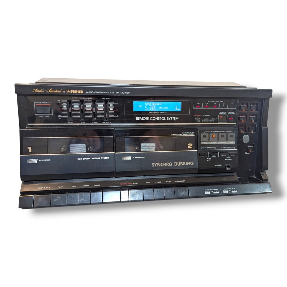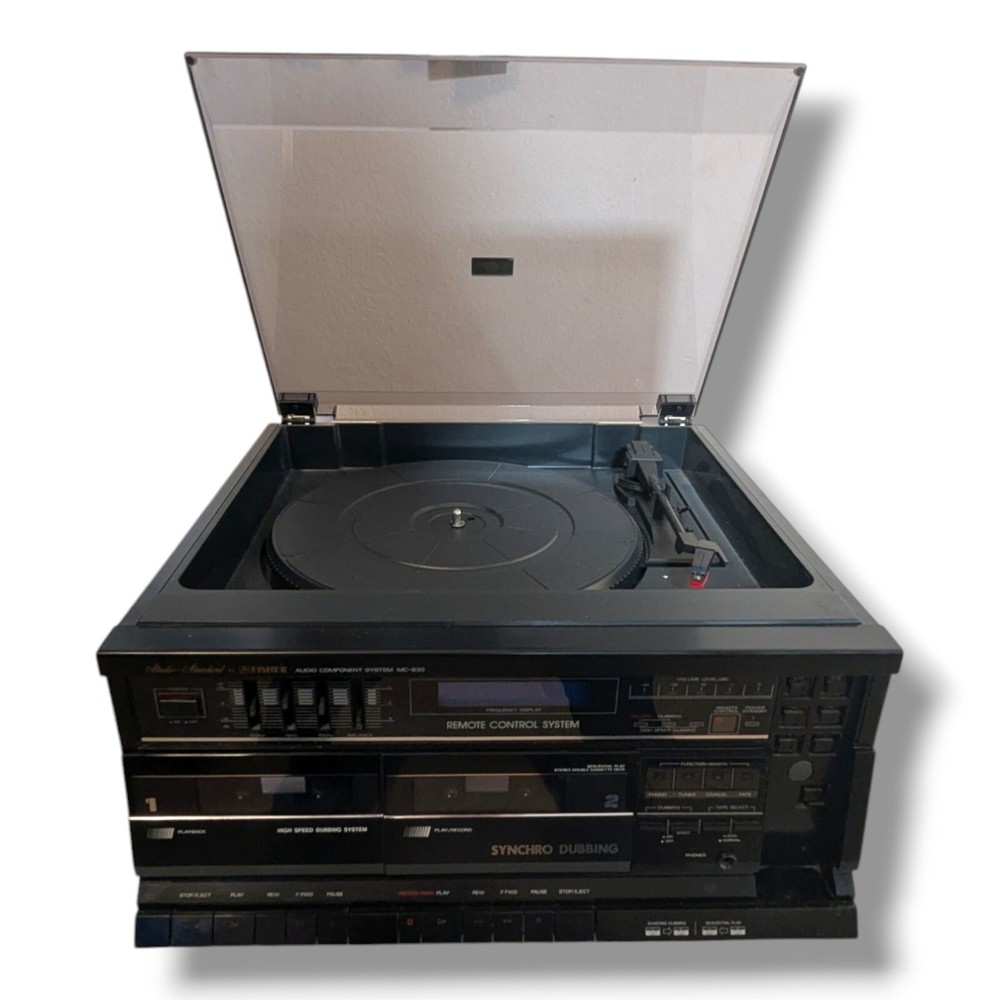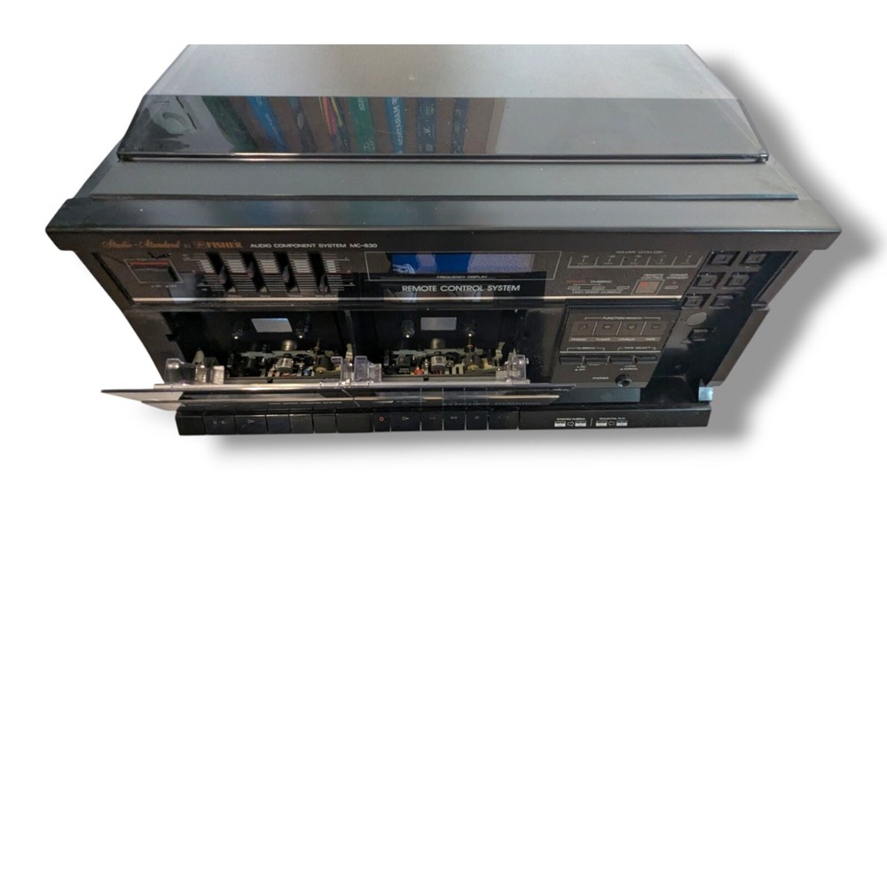 Vintage Fisher MC-630 All in One Compact Stereo Cassette/Turntable/Radio Unit turns on and radio is working. Does not include remote. Turntable turns. Cassette deck may need new belts. Overall good condition for age. Great for a restoration. Ships fast!