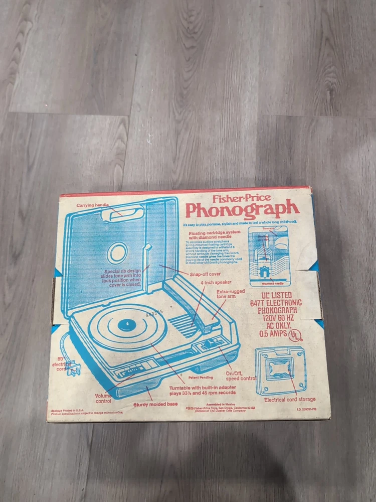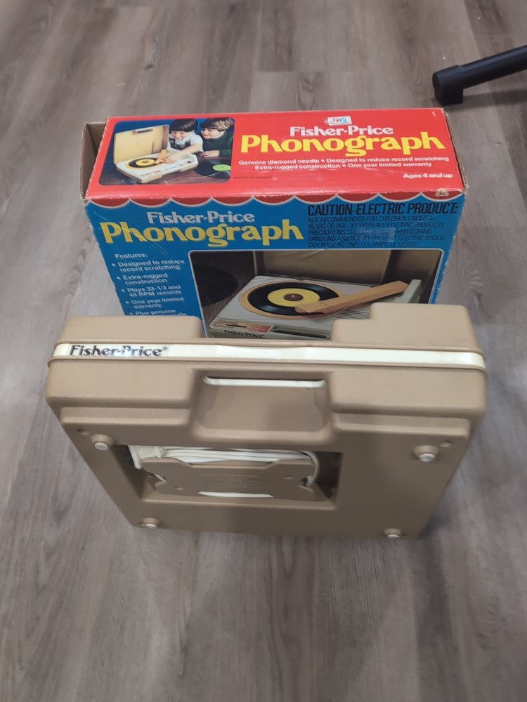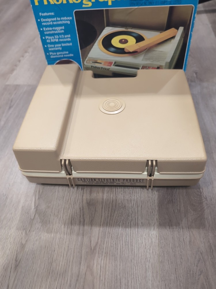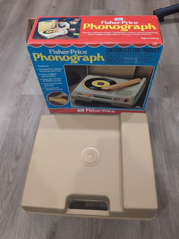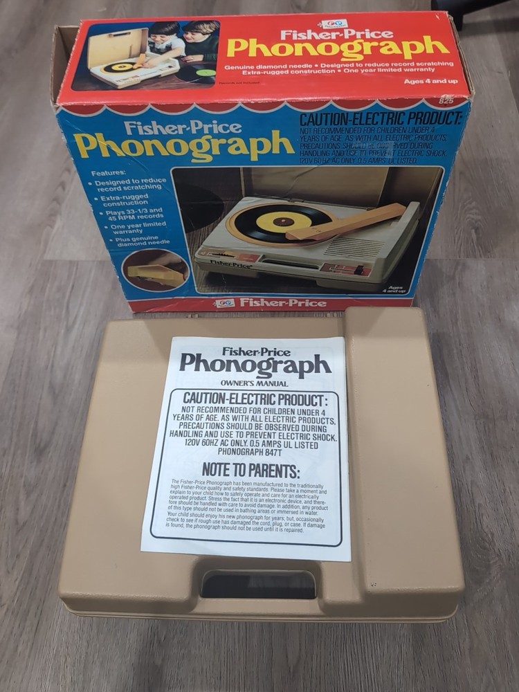 This is a vintage Fisher-Price phonograph record player from 1979, model #847T. It comes with its original box and manual. Made in Mexico, this toy is recommended for children aged 4 and up. It is a classic preschool toy that allows kids to play and listen to music on a retro-style phonograph. Tested and Working!