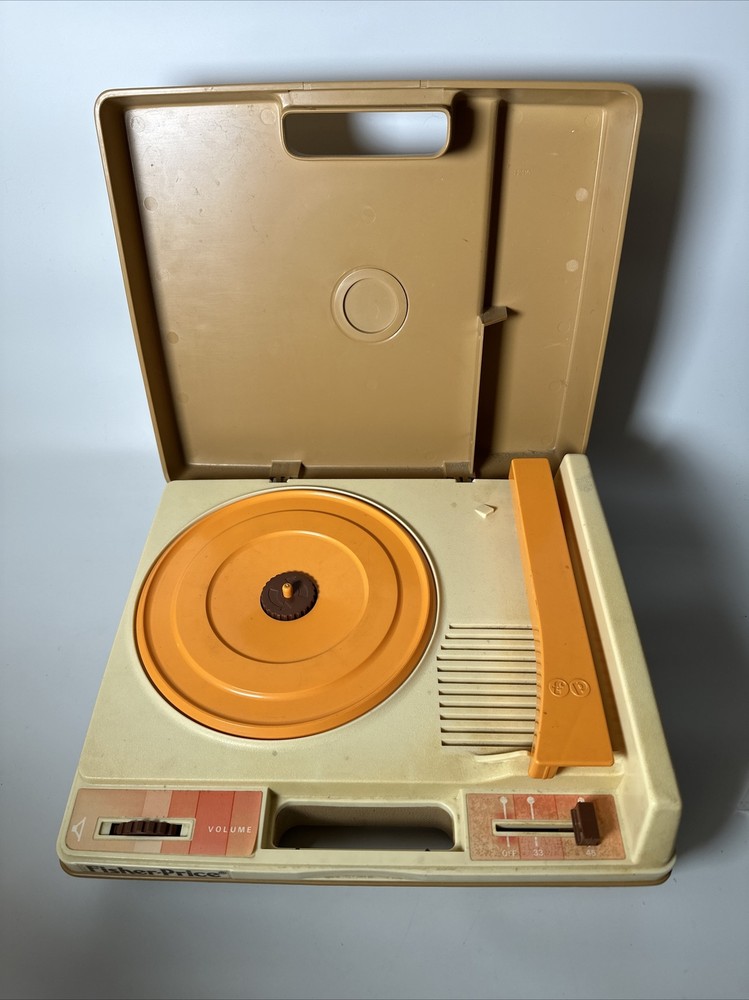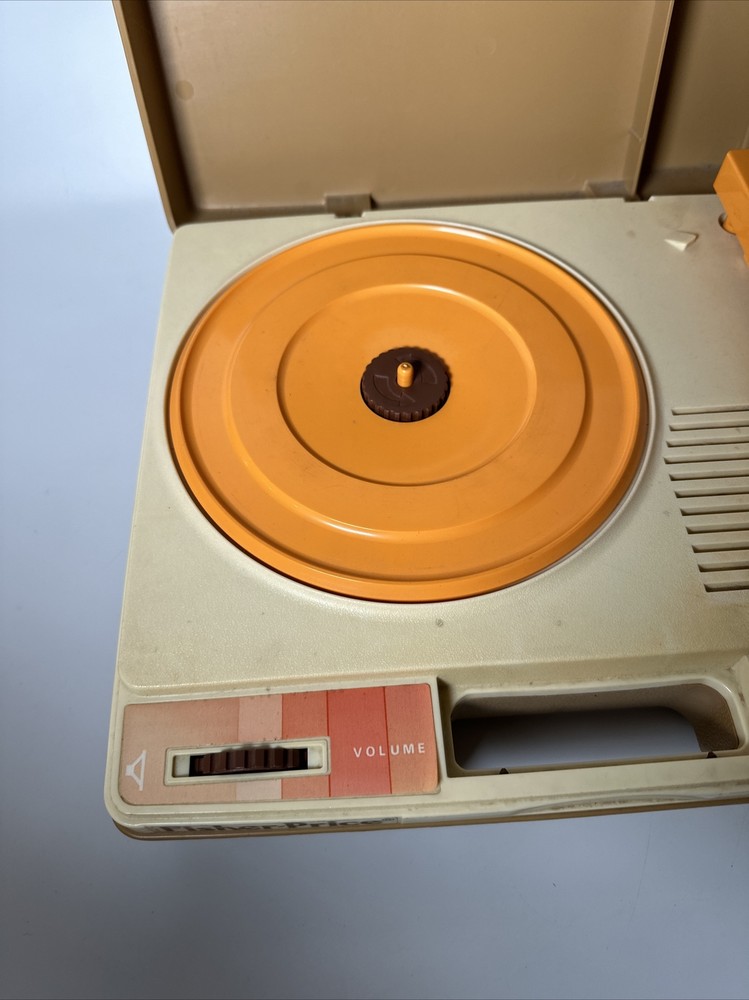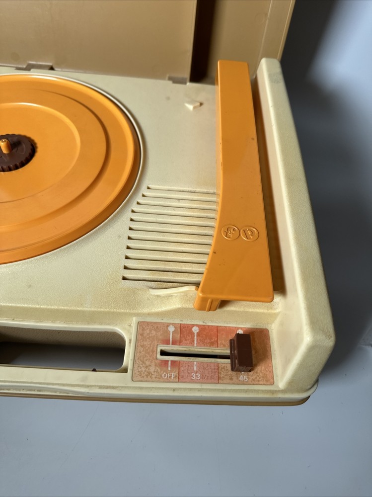 This vintage Fisher Price Portable Phonograph Record Player is a rare find for any music enthusiast. Made in 1978, it has a beautiful orange color and is compact, making it easy to move around. The turntable has speed settings of 45RPM and 33.3RPM, ensuring that you can listen to your records with ease. The player has an internal speaker for audio output and is portable, making it perfect for taking on the go. It is a great addition to any home audio setup and is sure to impress any guest. This Fisher Price Portable Phonograph Record Player is a must-have for any collector and is a rare find on eBay.