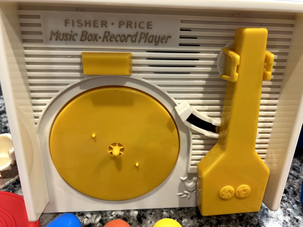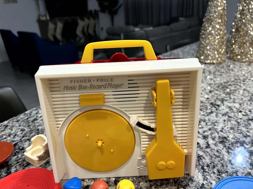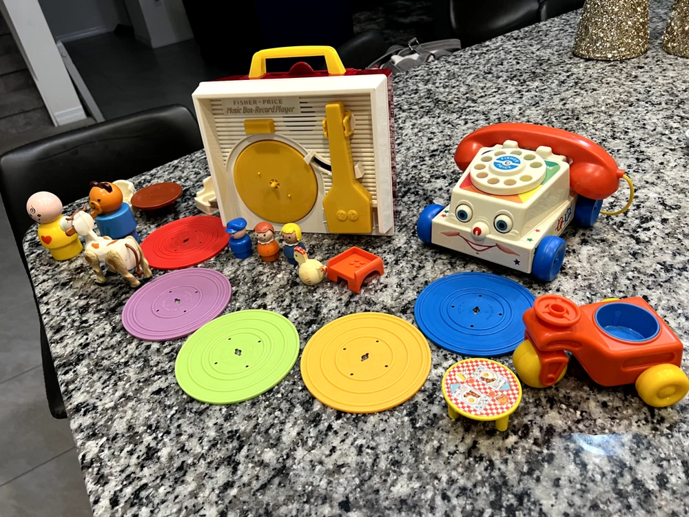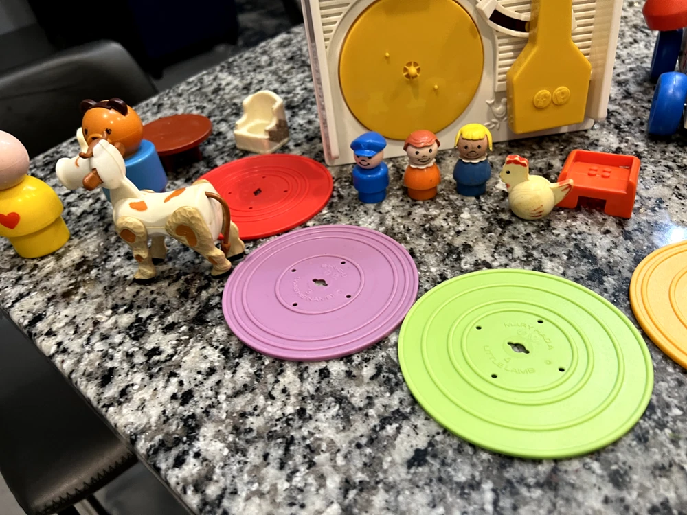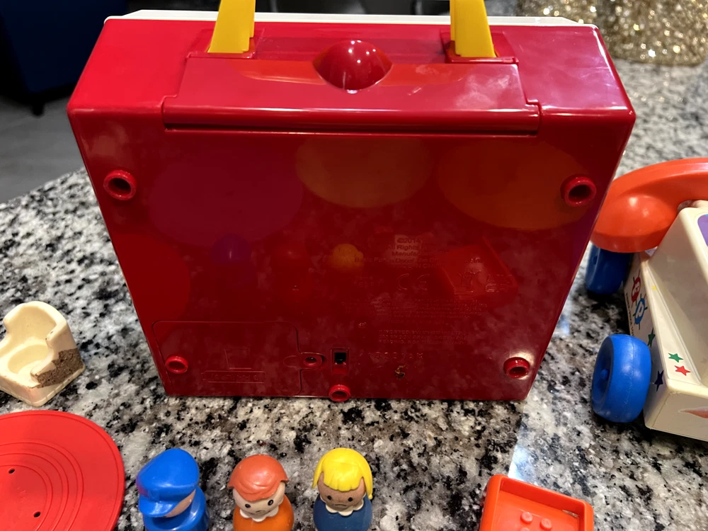 Good Condition, 1970 /reccord player /telephone w/ little people and accessories. Good Color. All Pieces are in Played with condition. The Graphics have some tears on outside and stickers on them. 20 Pieces of Played with Fisher Price. Family pieces are plastic body and plastic heads. These pieces are in Fair to Good Condition. Some paint loss.