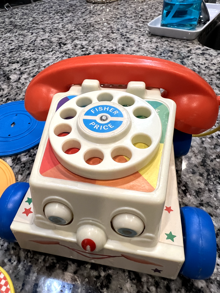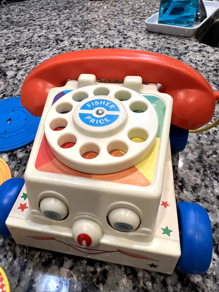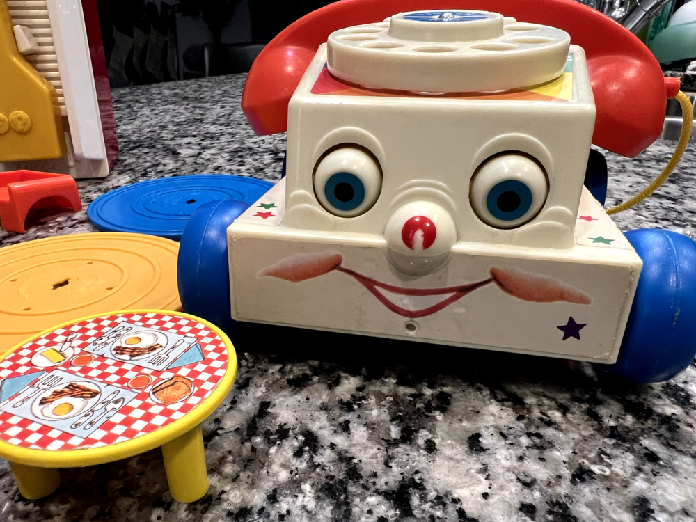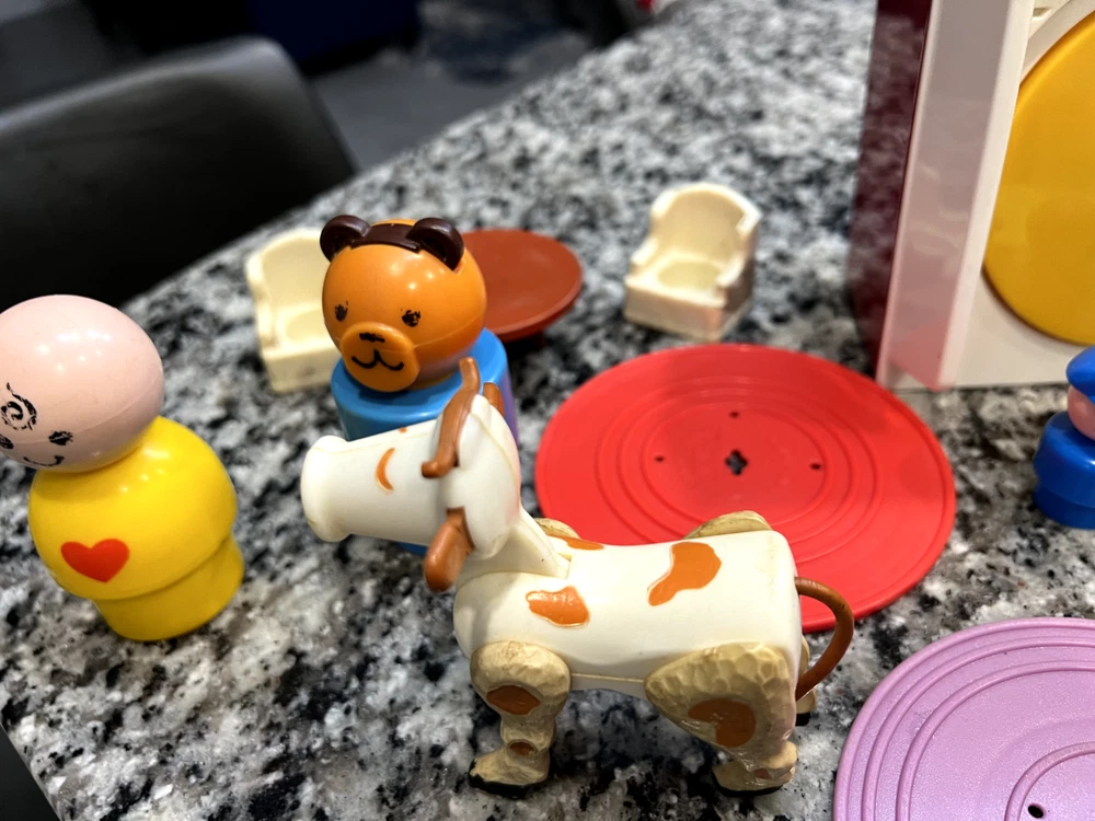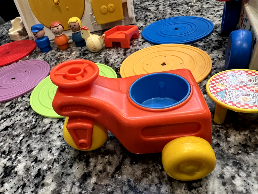 Good Condition, 1970 /reccord player /telephone w/ little people and accessories. Good Color. All Pieces are in Played with condition. The Graphics have some tears on outside and stickers on them. 20 Pieces of Played with Fisher Price. Family pieces are plastic body and plastic heads. These pieces are in Fair to Good Condition. Some paint loss.
