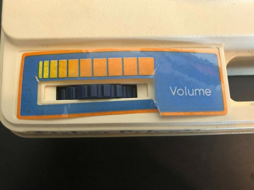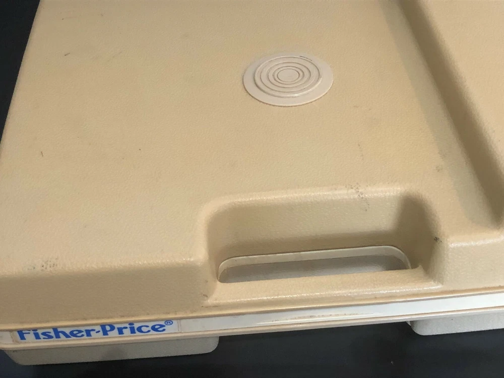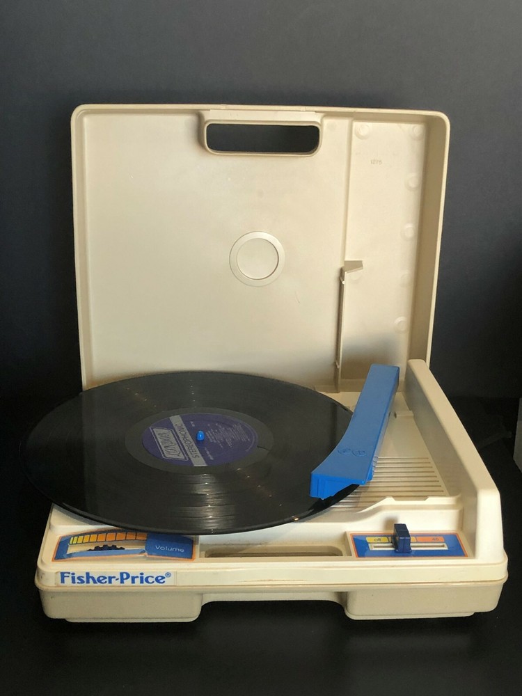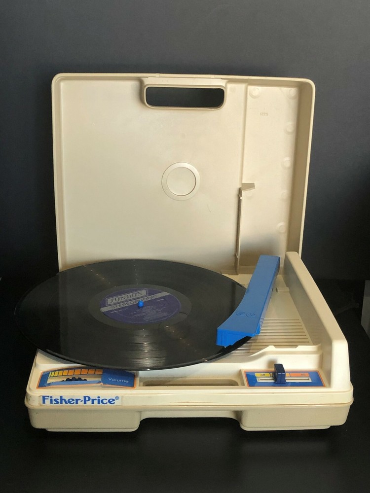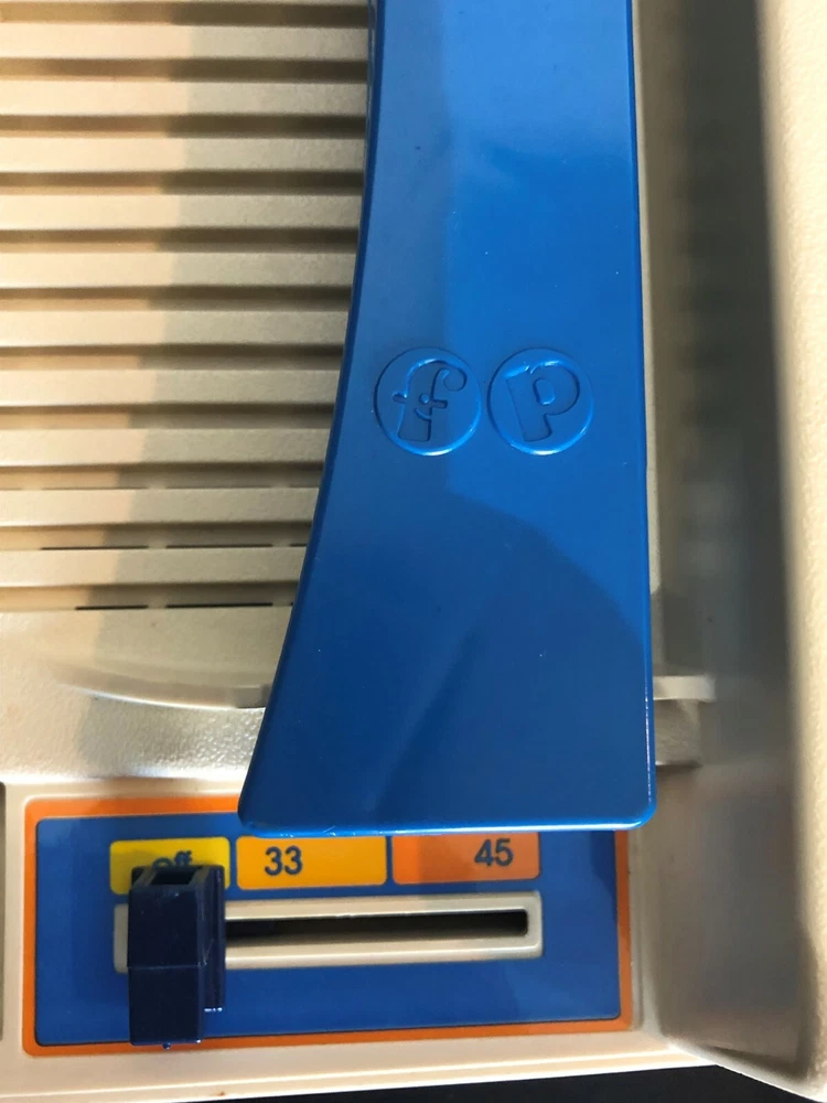 Vintage Fisher-Price Record Player. Tested & WORKS but only plays at one volume. Volume does not increase or decrease. Comes In Hardshell Case. Plays 33 & 45 Records. Pre-owned. Has some wear and scuff marks. Volume sticker has a tear through the bottom and has lost its adhesiveness and doesn’t stick. Has a blue colored turntable and needle. You must pull up on the blue middle round piece to play 45’s and push it down to play 33’s. Cord is in good shape and wraps underneath the record player. Please see all photos for further condition details as they are also part of the description. Sold as is.
