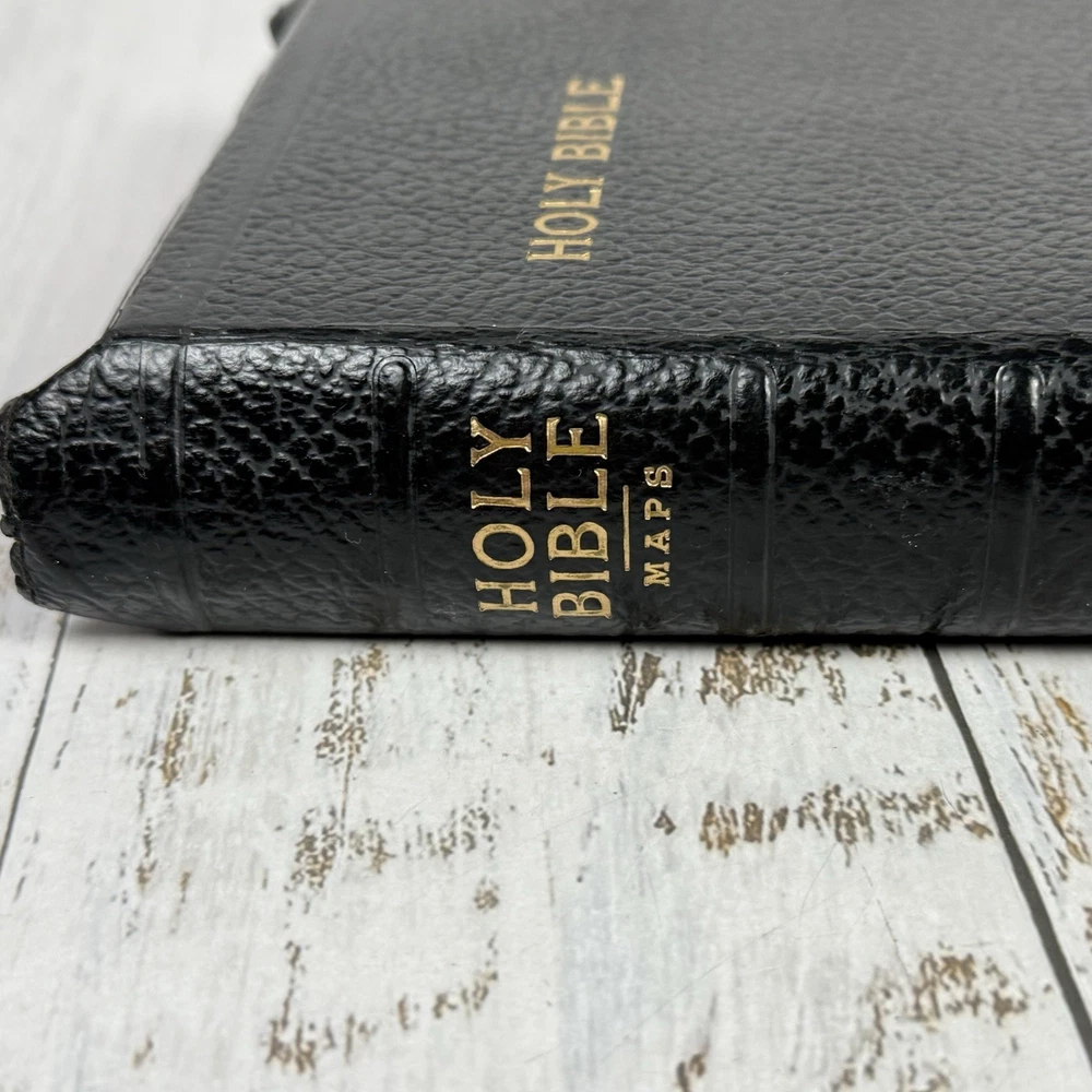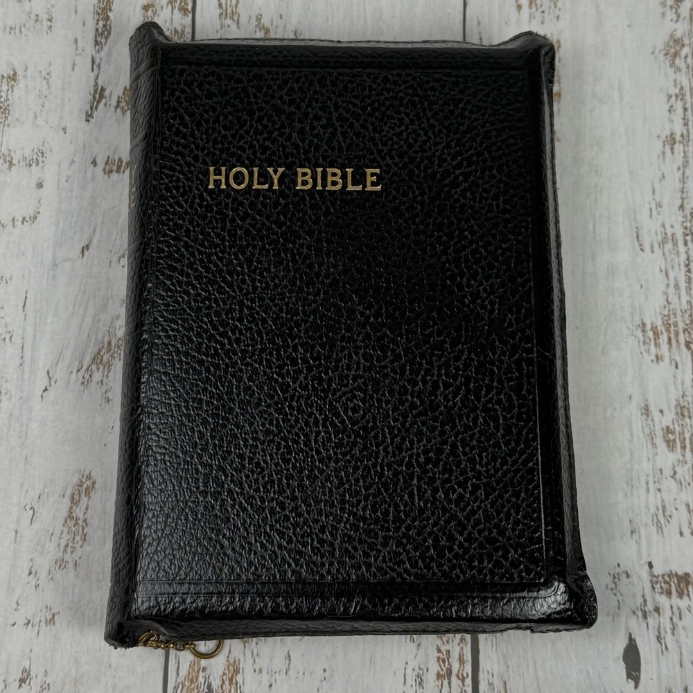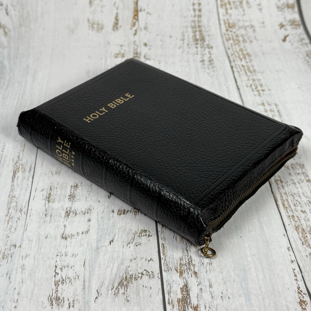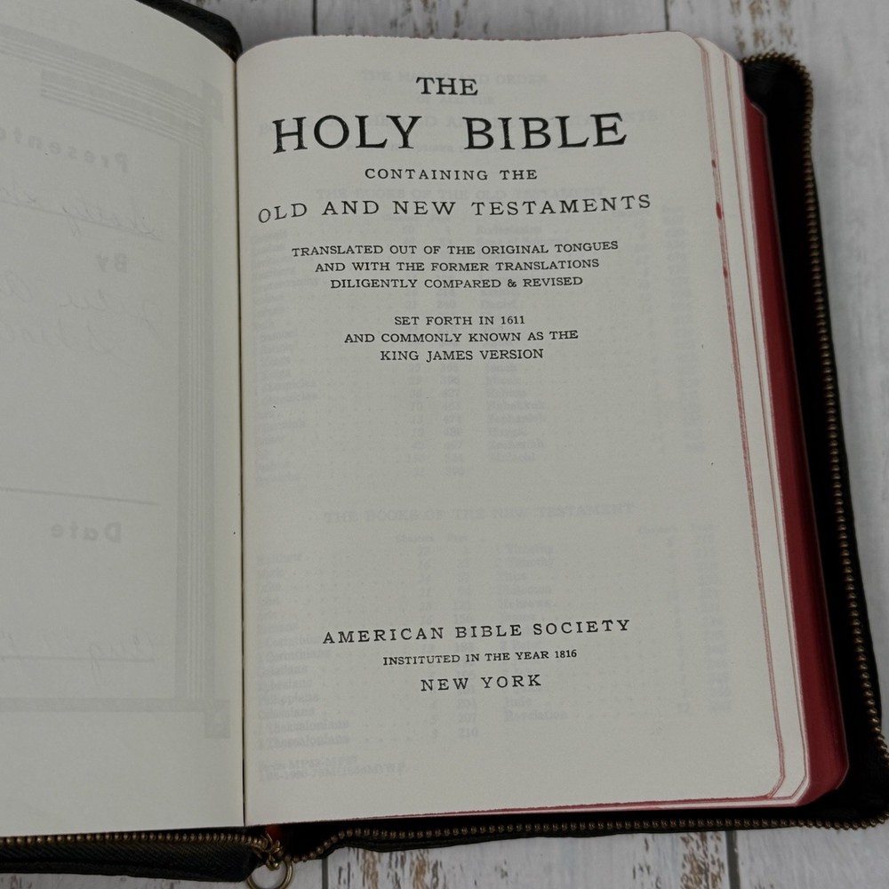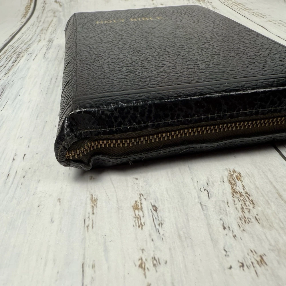 Red edge to pages. Nice clean Bible zip cover. This vintage Holy Bible from the American Bible Society is a beautiful addition to any collection. With a leather cover and maps, this KJV Bible from the 1950s series is perfect for both young adults and adults who are interested in Christianity and the Bible. The book is in excellent condition and is a great treasure for anyone who values history and the teachings of the Bible.