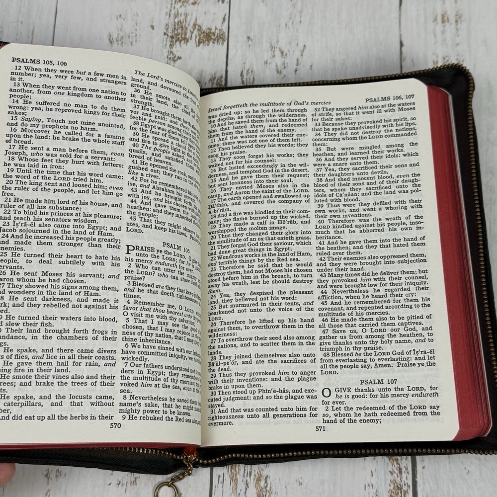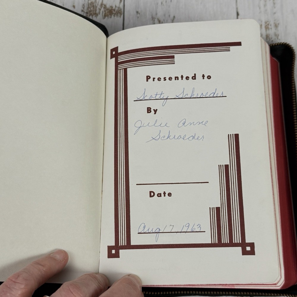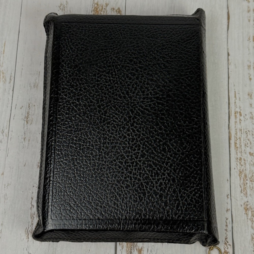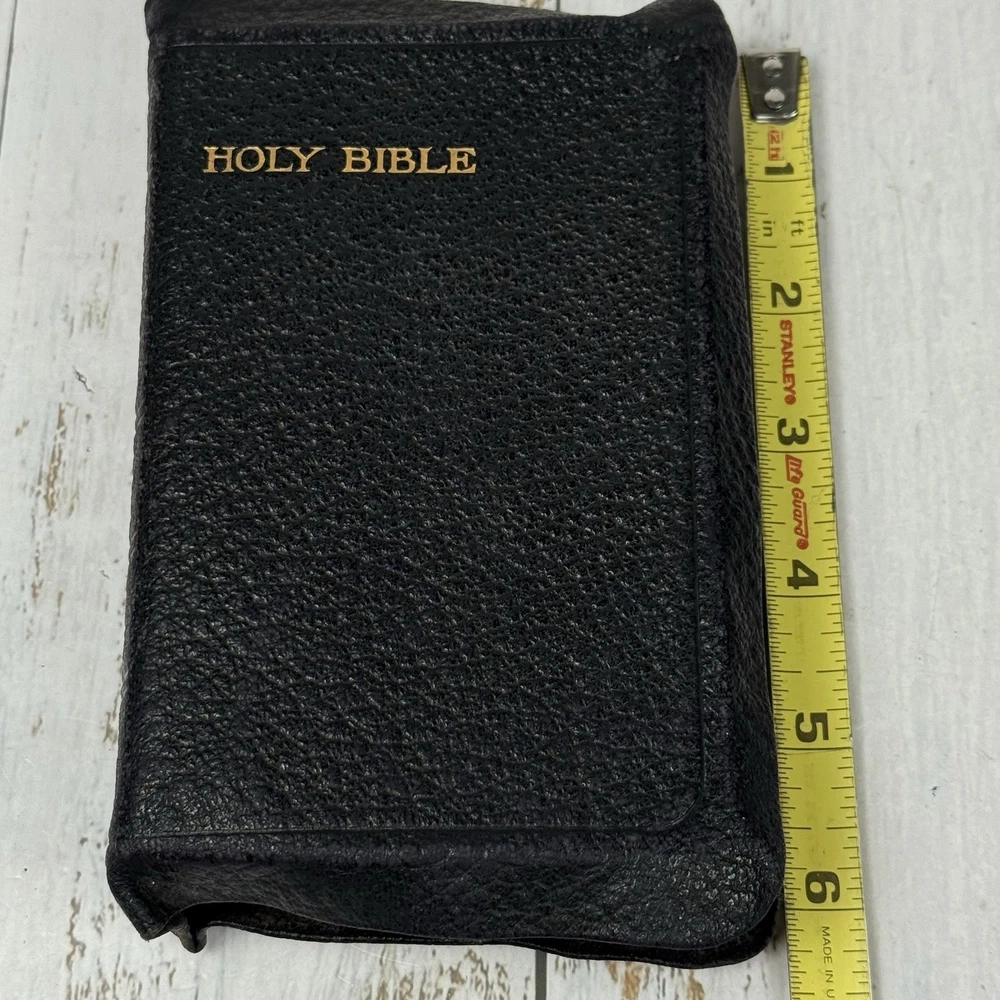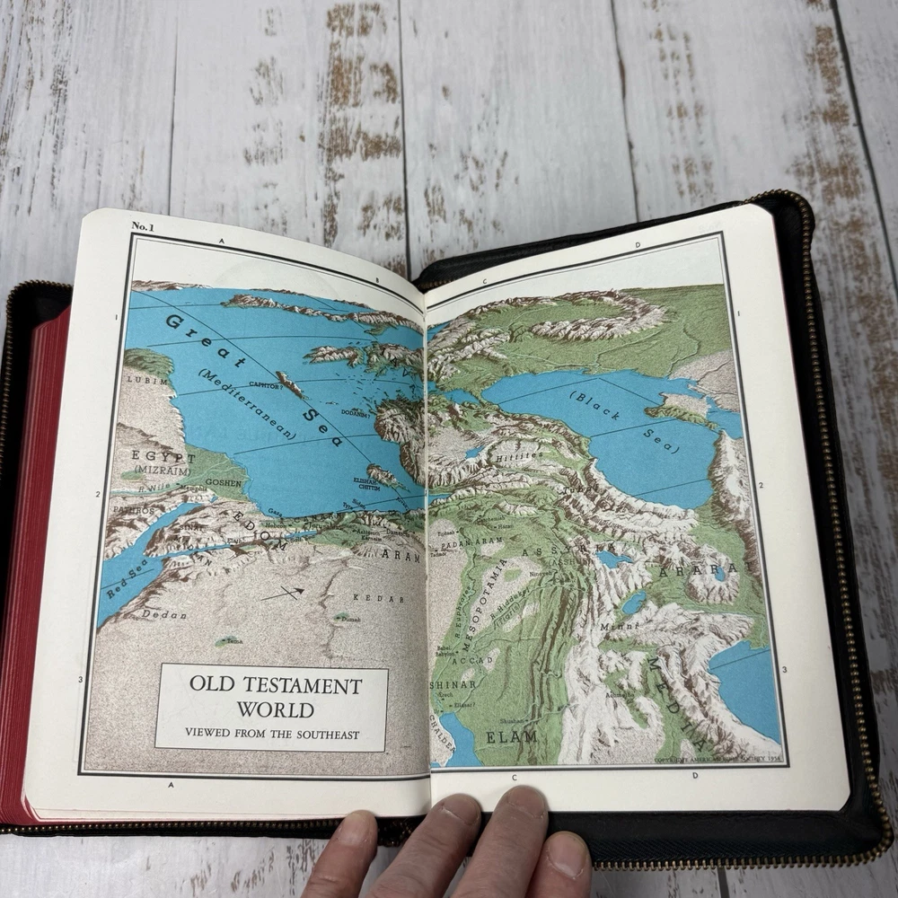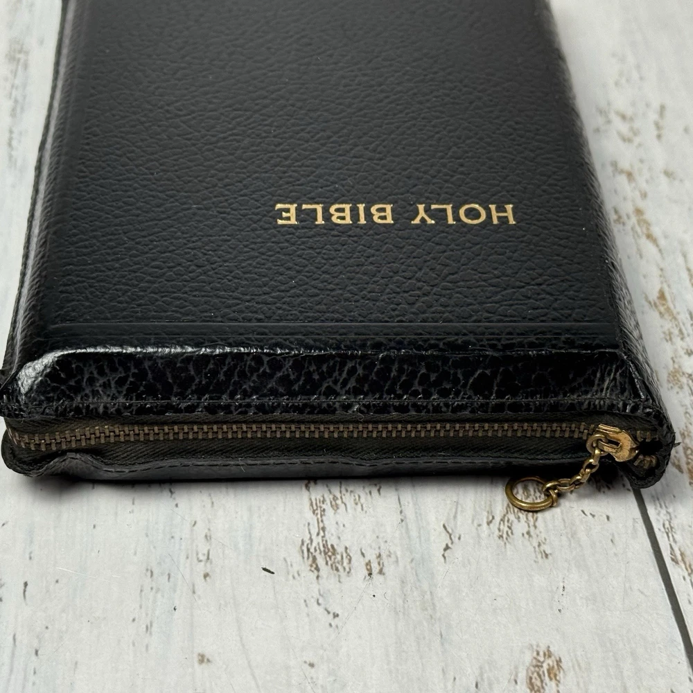 Red edge to pages. Nice clean Bible zip cover. This vintage Holy Bible from the American Bible Society is a beautiful addition to any collection. With a leather cover and maps, this KJV Bible from the 1950s series is perfect for both young adults and adults who are interested in Christianity and the Bible. The book is in excellent condition and is a great treasure for anyone who values history and the teachings of the Bible.
