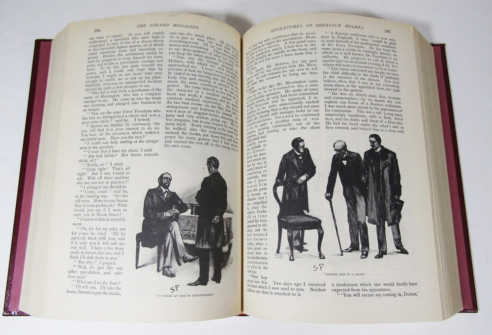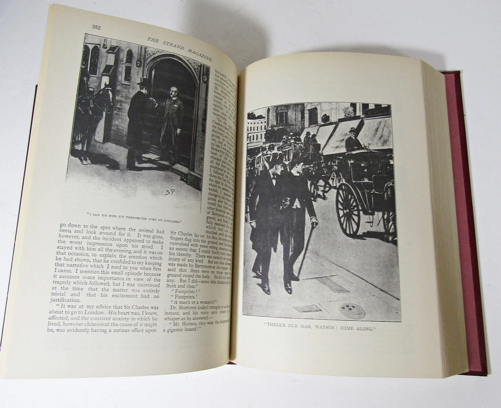 Vintage Illustrated Sherlock Holmes Collection - Leather Bound - Excellent Condition This vintage collection features the original Sherlock Holmes stories by Sir Arthur Conan Doyle, as they were first published in the renowned British magazine The Strand. Included are 37 short stories, along with the complete novel The Hound of the Baskervilles, providing over 600 pages of timeless literary enjoyment. This edition is reproduced in complete facsimile, featuring the iconic illustrations by Sidney Paget, whose depictions of Holmes have become synonymous with the character's visual portrayal. Presented in excellent preowned condition, almost like new, this leather-bound volume is a rare collector's piece sought after by enthusiasts worldwide. Please view all photos for a closer look at this classic collection.