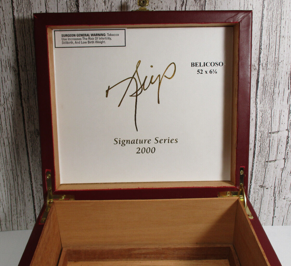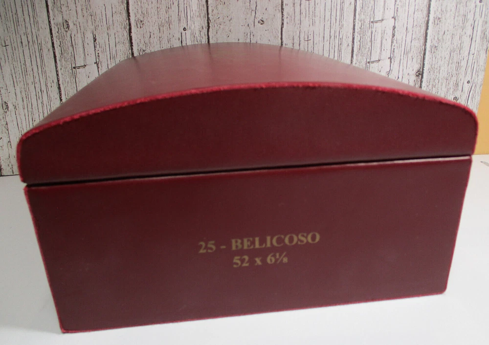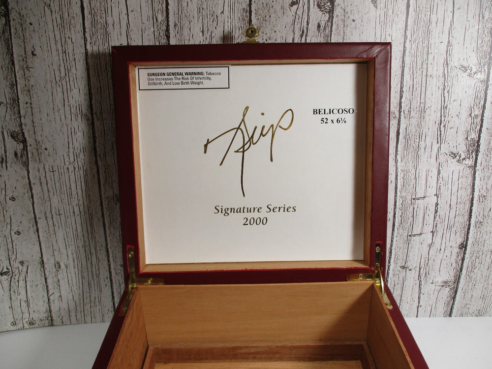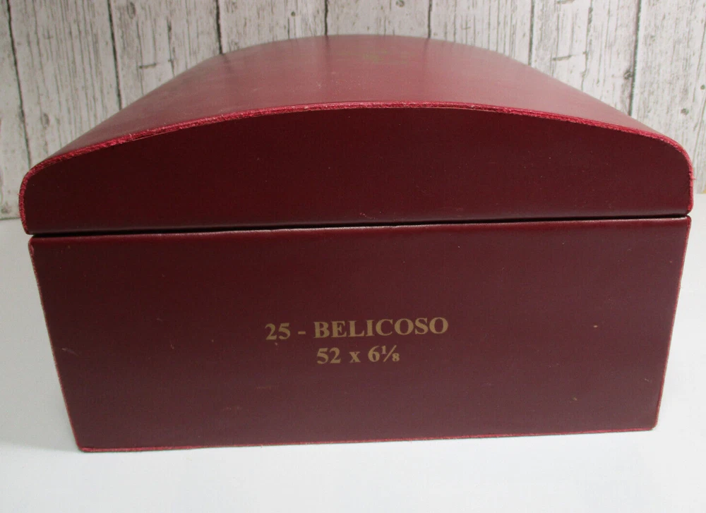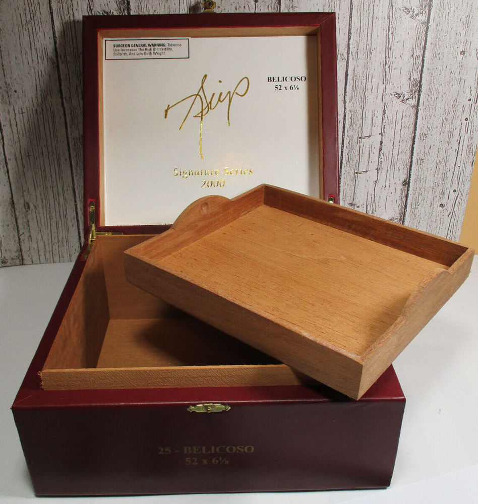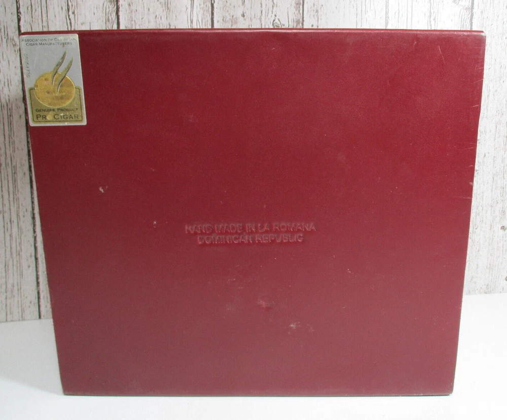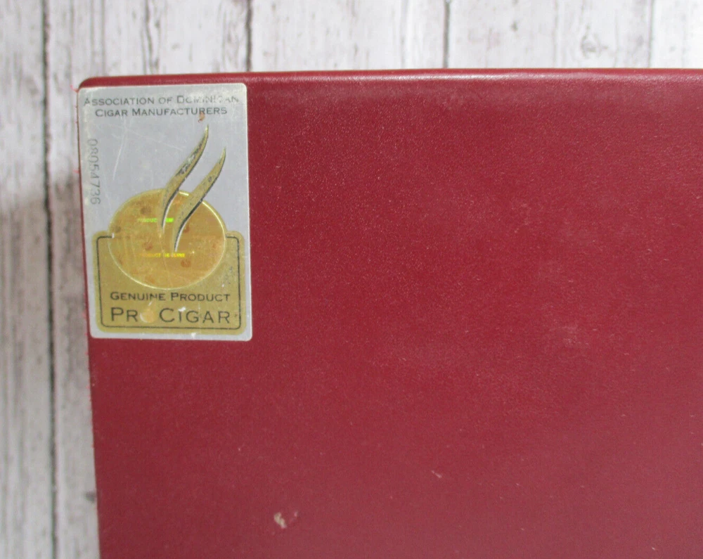 This Jose Seijas Signature Series 2000 Vintage Maroon Leather Bound Cigar Box is in nice condition! It has one lift out inner tray included. It's really a b eautiful, very well made box. The latch and hinges work as they should. It measures about 9 1/4" x 8" x 4 3/4" and is made in the Dominican Republic.