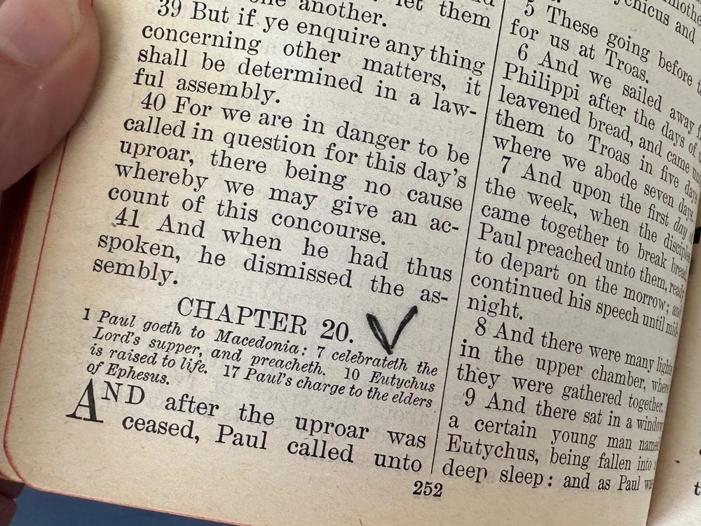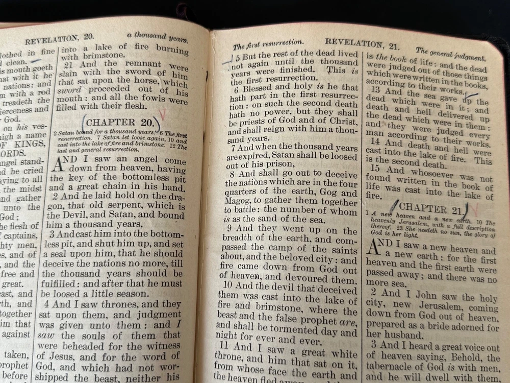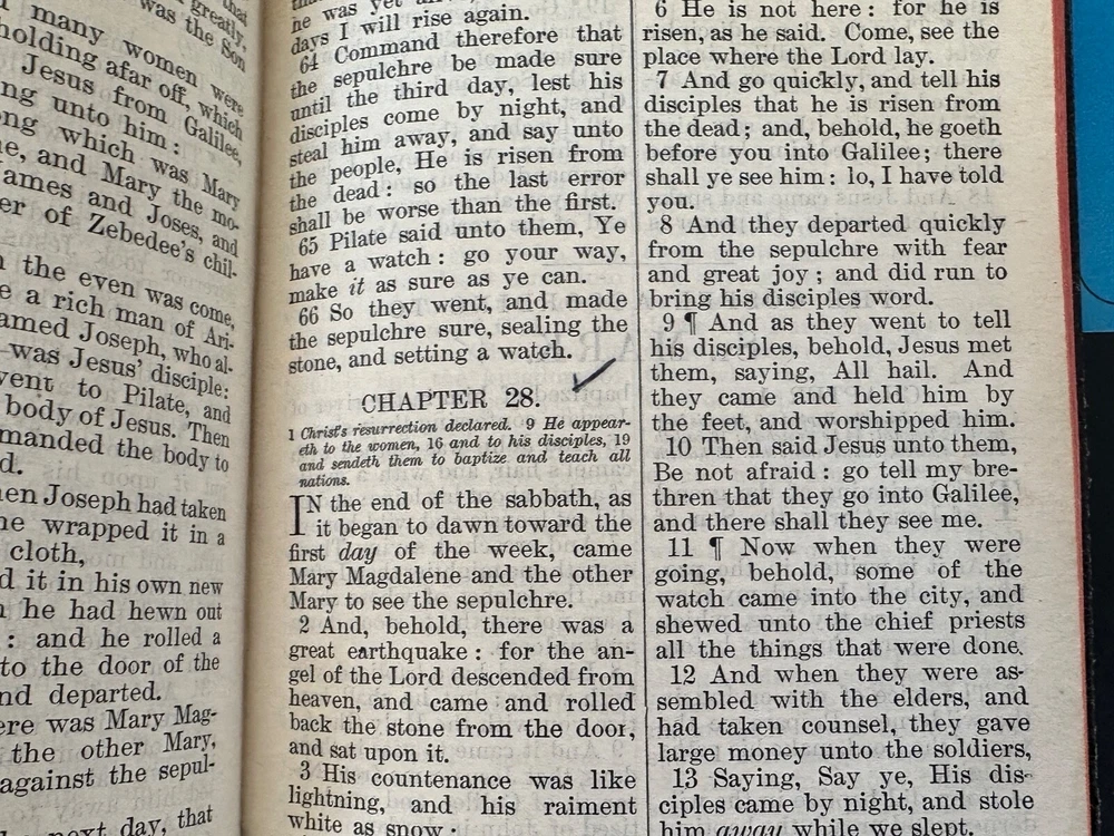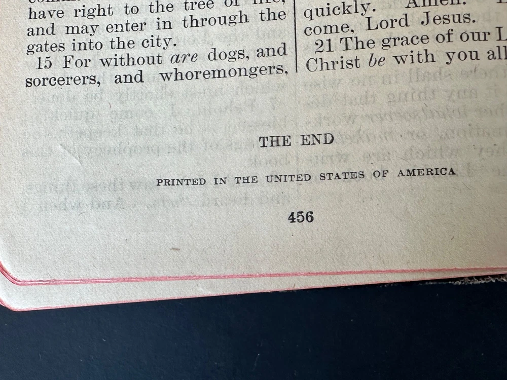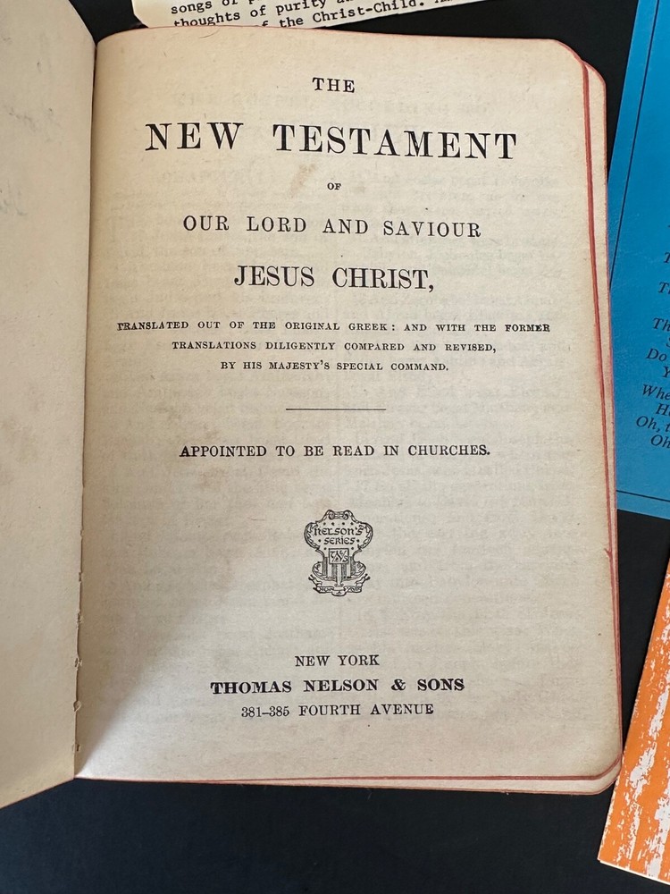 This circa 1940s New Testament Bible has an inscription dated 1/3/44 at the front: "To Warren from Catherine 'Wishing you a safe return'" Included with the ephemera found in the book is one page of a handwritten letter addressing Warren and referring to "a brother in the navy." There is also a handwritten note on an envelope addressed to "Dear Mom" and signed "Son Warren." The vintage New Testament also comes with several other pieces of religious ephemera found in the book including a mass card for Evelyn Ripley dated January 12, 1975 from the Tuttle Funeal Home in Dover, NJ. Warren obviously read and used this bible as it shows obvious wear. There is some damage at the top and bottom of the spine. Warren circled and made check marks at chapter headings through out the book. The New Testament of Our Lord and Savior Jesus Christ Appointed to be Read in Churches Thomas Nelson & Sons, New York 6 1/4" x 4 1/2" No Publication Date Printed in the U.S.A.