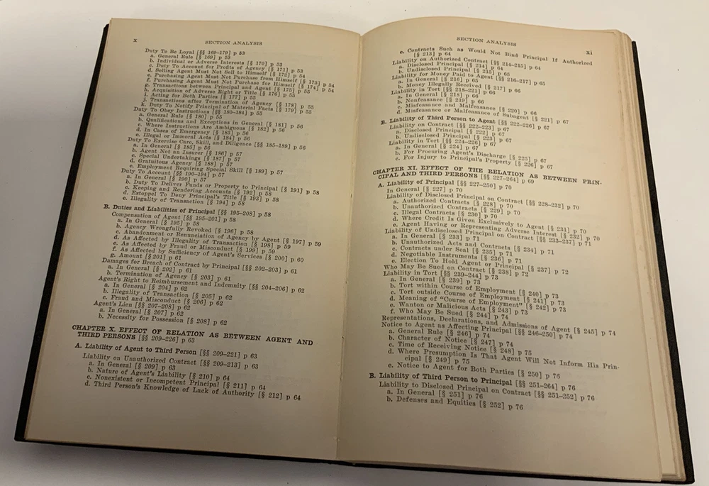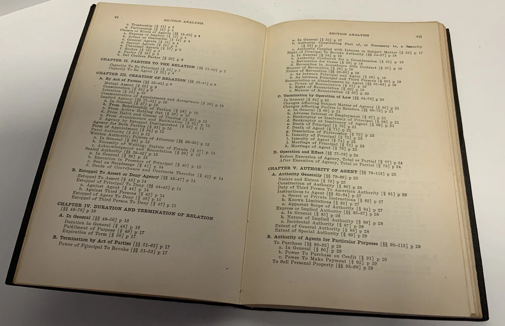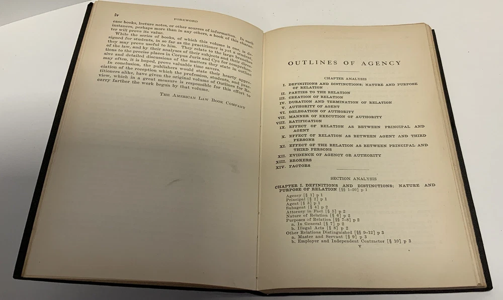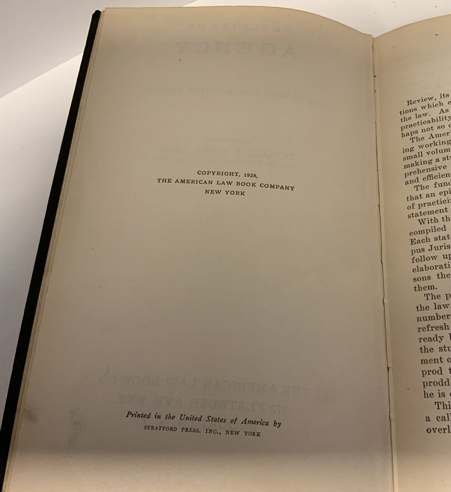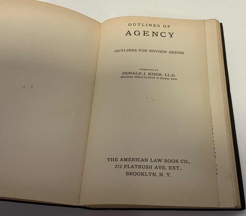 Vintage Leather-bound Law Book, Agency- Outline for Review Series, 1928 American Law Book Co. In Very Good condition with some wearing. Pages have some tanning. See pics. There are 5 more books from this series. Will discount by 15% if all are purchased together. Will combine shipping on like items. Will ship within 1-2 business days.
