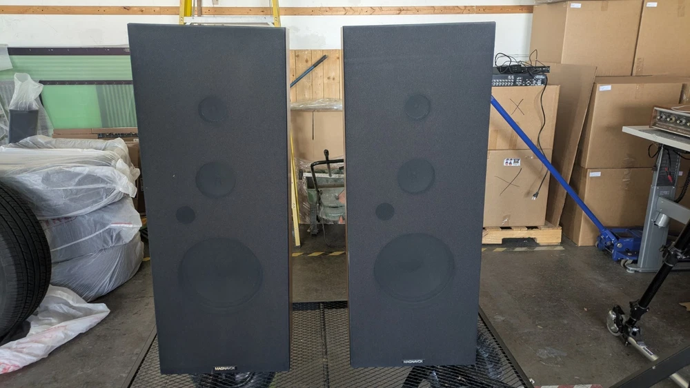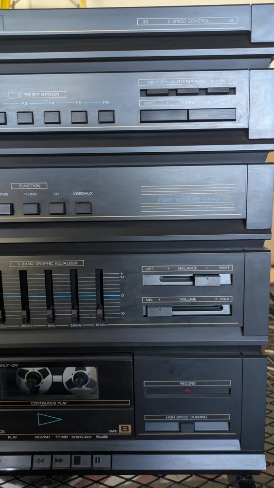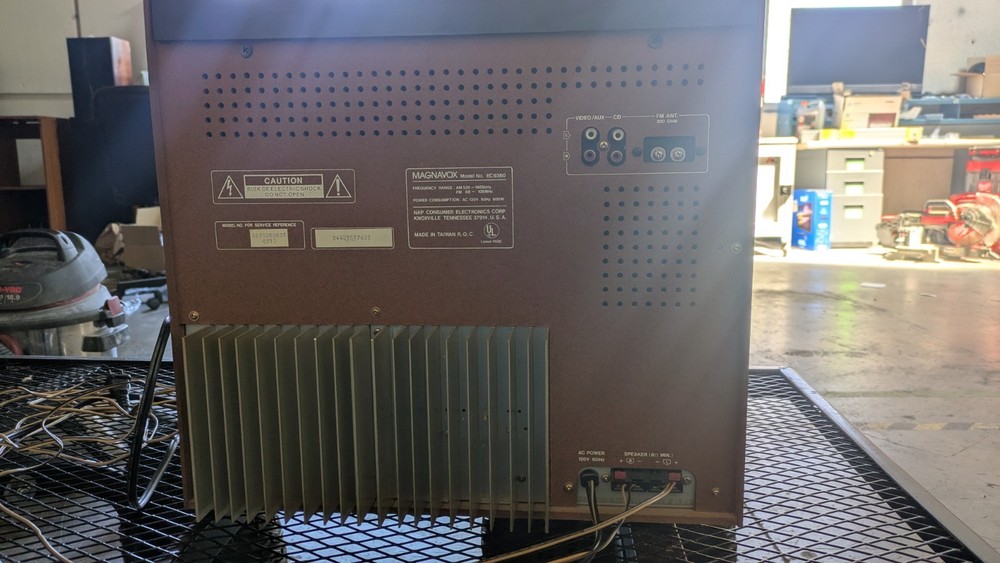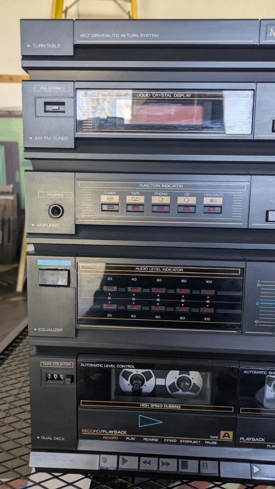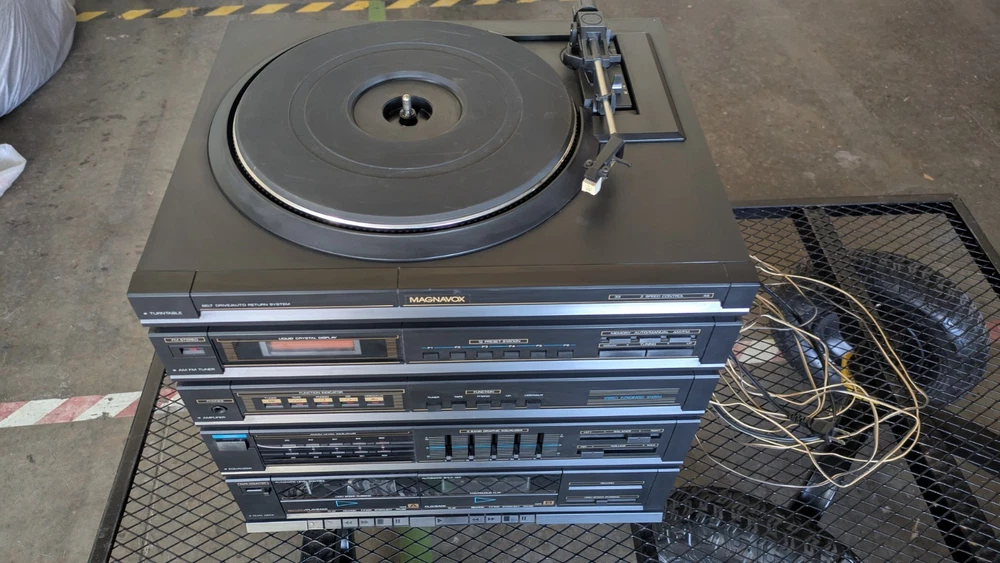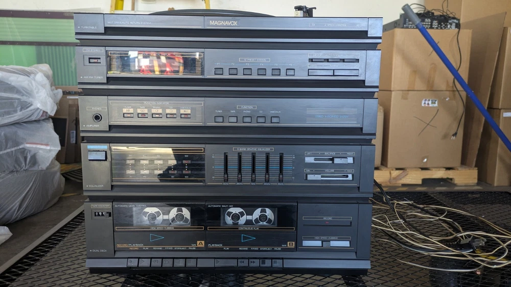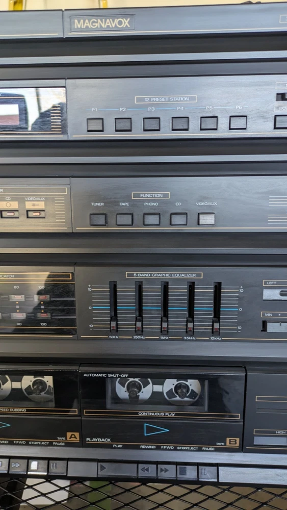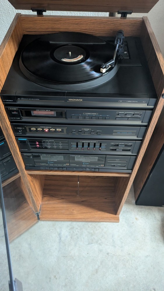 Vintage Magnavox FULL Stereo System w/ Turntable and Cabinet in good working condition. Easy setup integrated module includes: Stereo AM/FM Tuner, Amplifier, Cassette Deck/ Recorder, and Turntable. The set also includes a very nice pair of tall Magnavox speakers! Clean and set up in the original Component Cabinet. You can test out the system at our workshop in Louisville. Try before you buy!