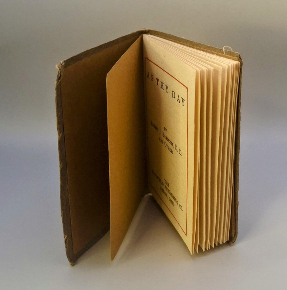 The Vintage Mini Saalfield Bible "As Thy Day" Book is a miniature leather-bound Bible from the Norka Series, originating from the United States. It is an original piece with a focus on Christianity and Bibles, featuring religious content within the context of North American culture. This antique item is not signed, personalized, or known for any special attributes beyond its compact size and classic leather binding.