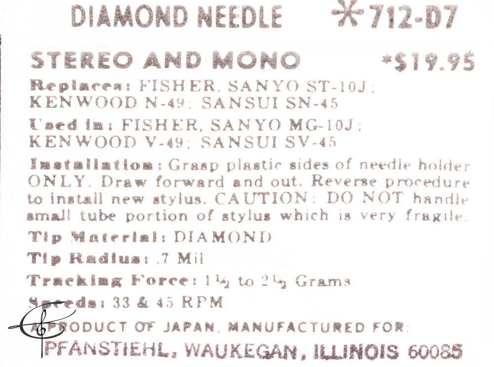 Vintage Record Player Phonograph Needle Stylus Pfanstiehl 712-D7 gsaudioinc We always provide accurate descriptions and explanations to the best of our ability. The item in the photographs is the one that you will receive. The picture is of a representative thing if the ad has multiple quantities. There may be slight cosmetic differences but no functional differences. Please reach out if you have any questions. We will try to answer them as quickly as possible. We have stopped accepting automated returns. We still stand behind everything we sell. If you contact eBay first, our options to solve the issue quickly are severely limited. Your item will include contact information and all claims will be resolved quickly and professionally. GS Audio is a small business located in Colorado. We provide eBay consignment sales and purchase working and non-working electronics and collectibles. We provide a full service electronics repair facility through The Sound Shop in Colorado Springs, with over 40 years of experience repairing and restoring home and professional audio equipment. We are a 2nd chance employer working with ex offenders to reintegrate them back into the work force. Thank you for your purchase. Glen G