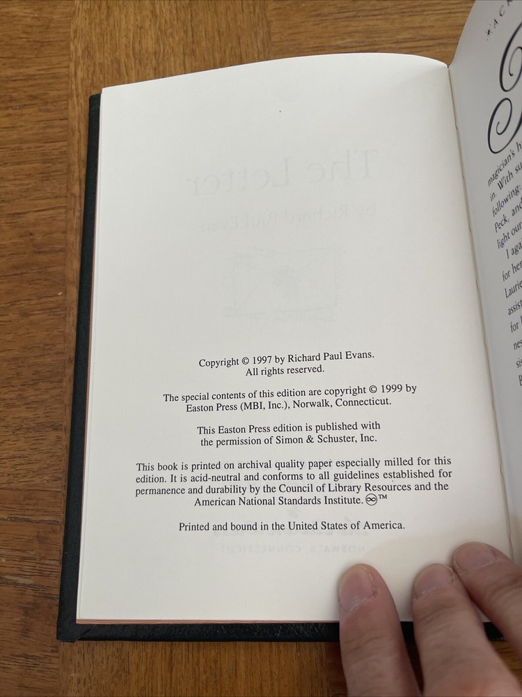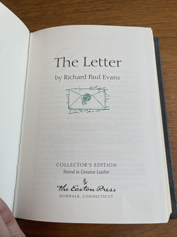 This is a rare collector's edition of The Letter by Richard Paul Evans, printed in 1997 by Easton Press. The book is bound in genuine leather and features special attributes that make it a valuable addition to any collection. The author's classic work is written in English and covers topics related to literature and fiction. The book is a great find for any book collector or enthusiast, and would make a perfect gift for a loved one. It is not personalized and has not been modified in any way. The country of manufacture is the United States, and it has been published by Easton Press. Get your hands on this timeless piece of literature today!