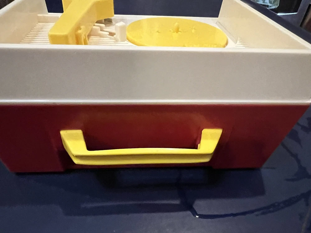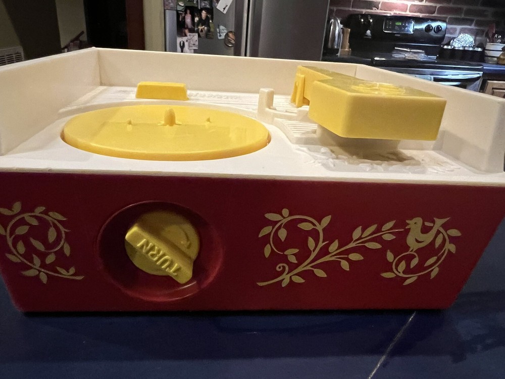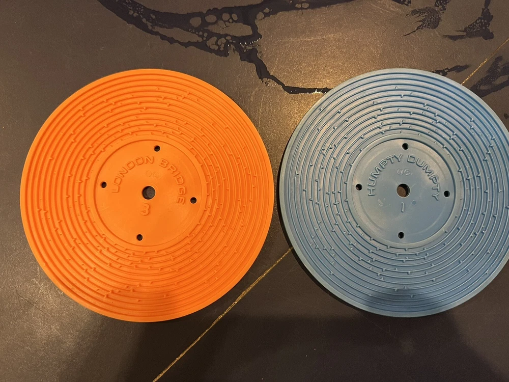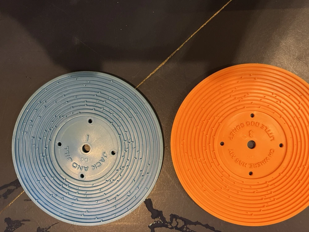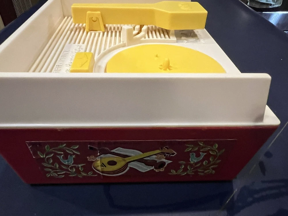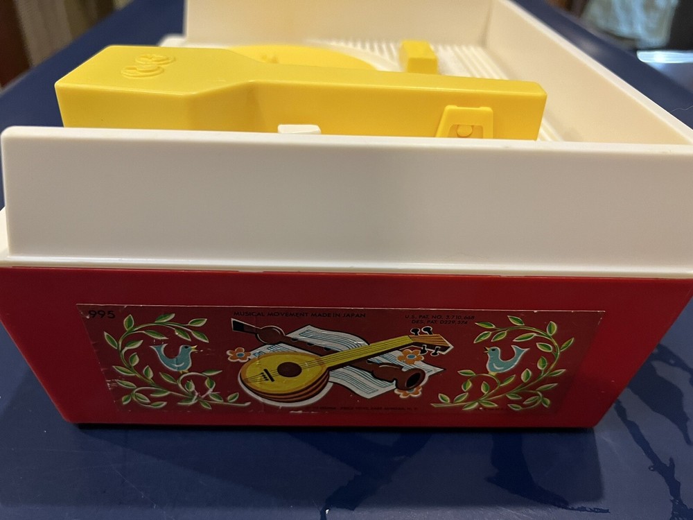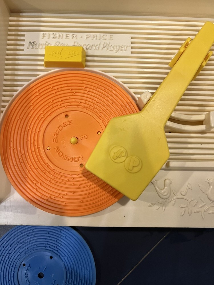 Working record player with 2 discs. Jack and Jill Little Doggy Humpty Dumpty London Bridge Additional discs are easily available on eBay. Please be aware that these are vintage toys. The condition is very good, but look closely at photos. Condition reflects normal wear and tear commensurate with its age. Also be aware that child safety requirements have improved greatly since these toys were made. Be sure the toy is safe for your kiddo and always supervise play with vintage toys.