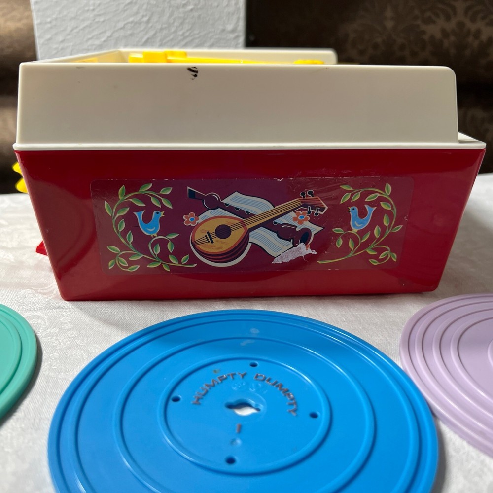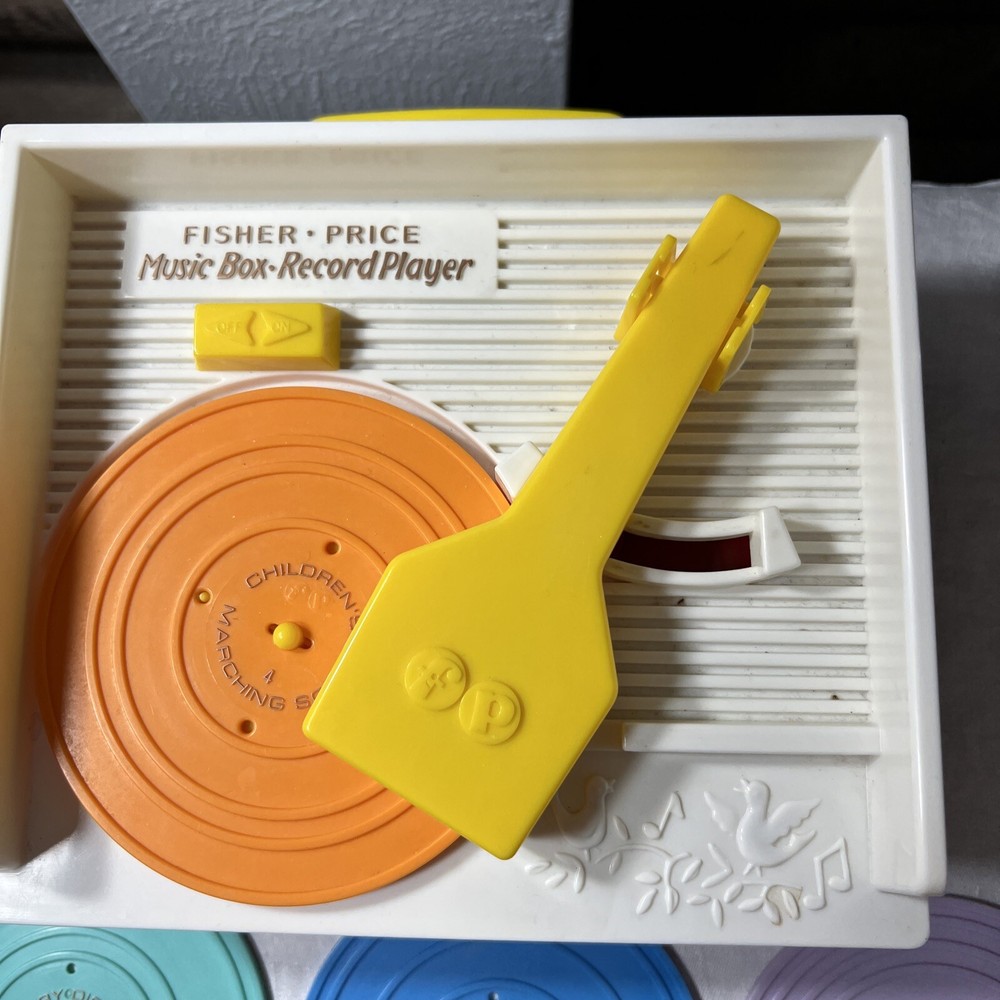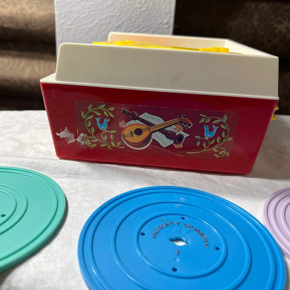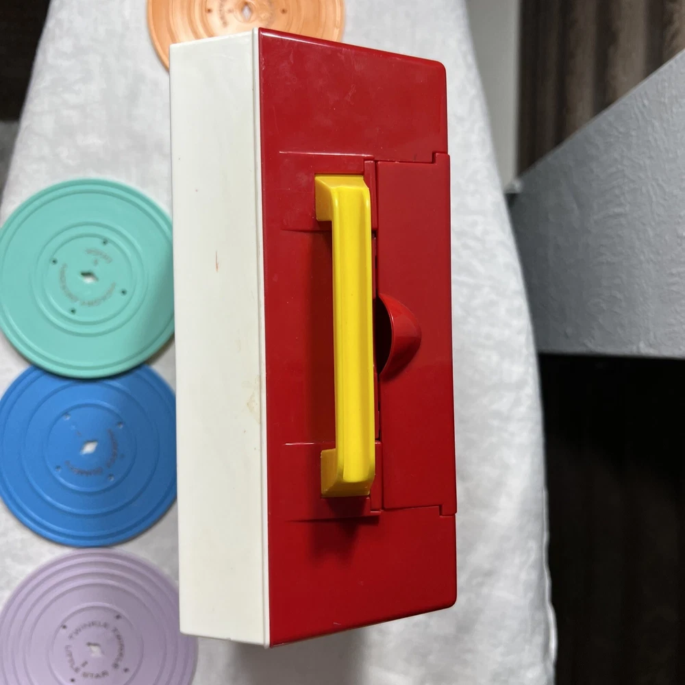 2010 Mattel Inc. Fisher Price Music Box-Record Player 4 Records-works. Missing one record. Small tear to the paper sticker on one side. Small black mark on the outside white part. Comes with the batteries.