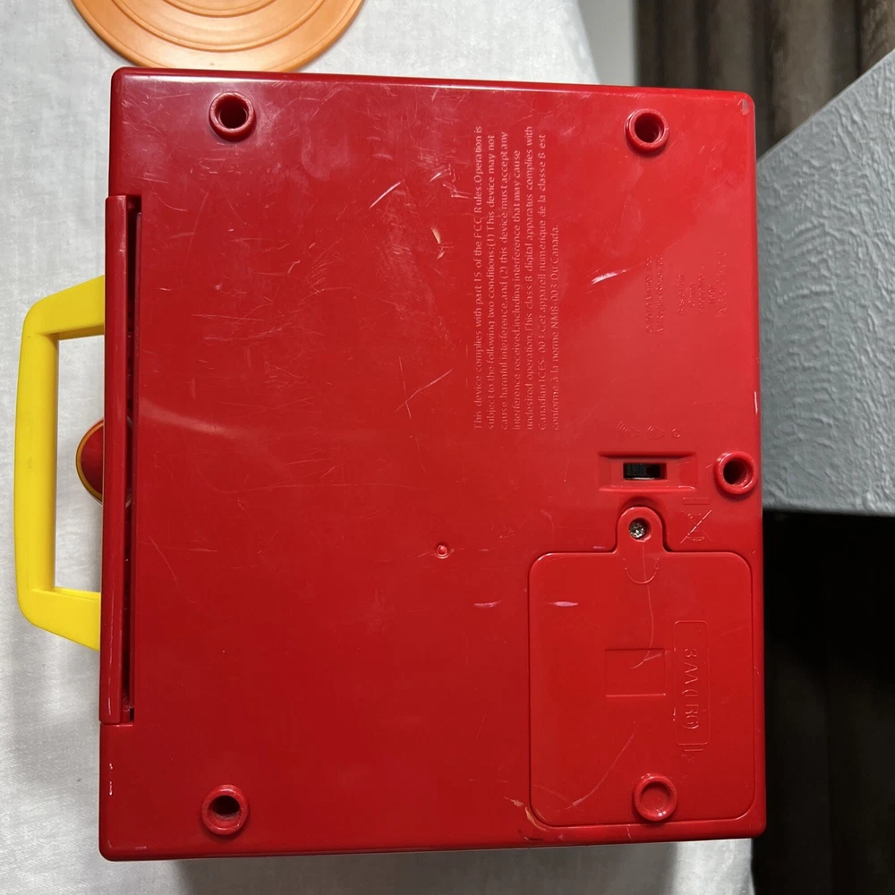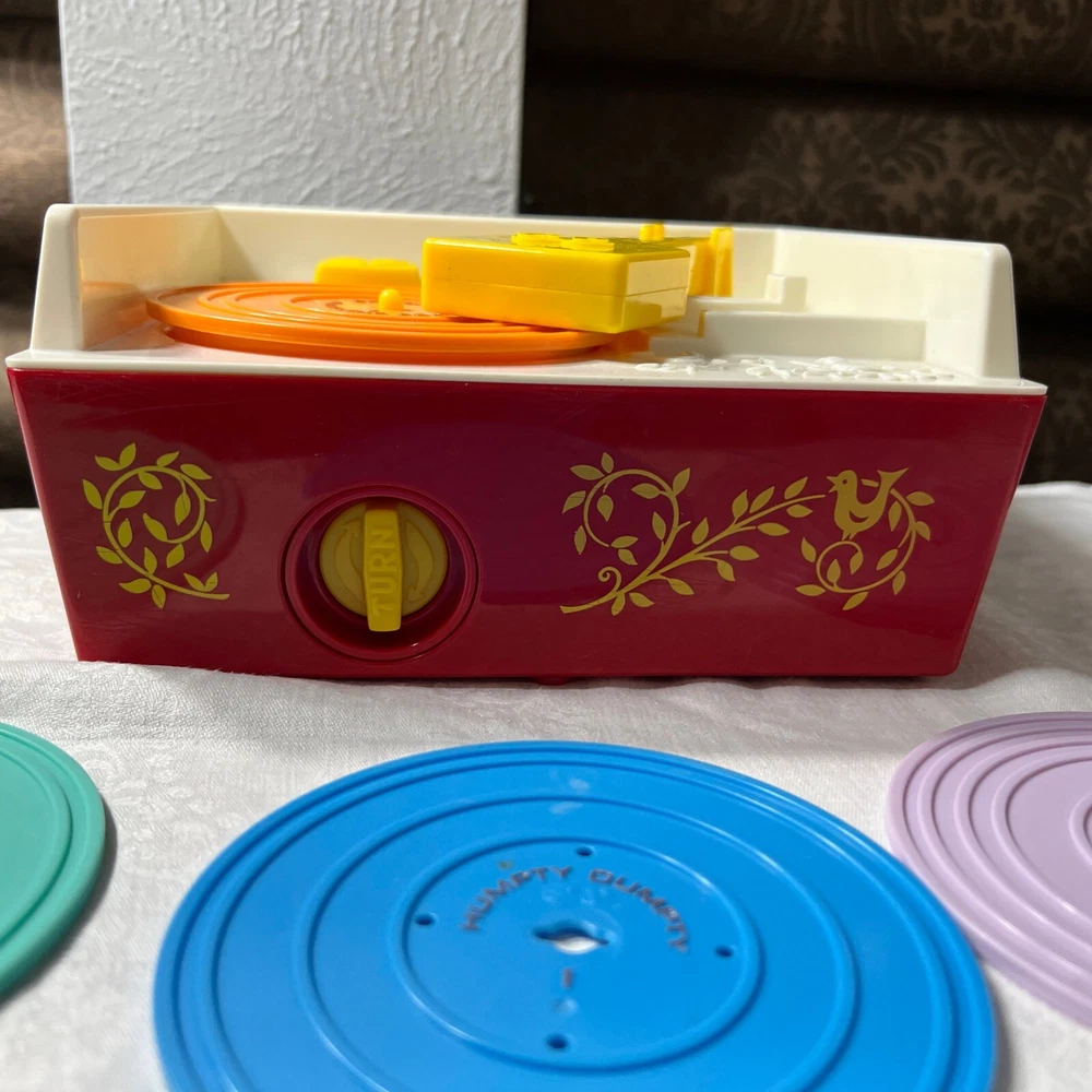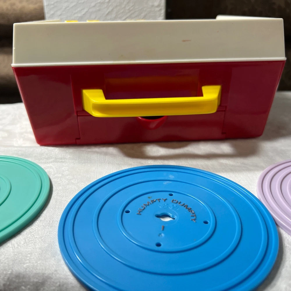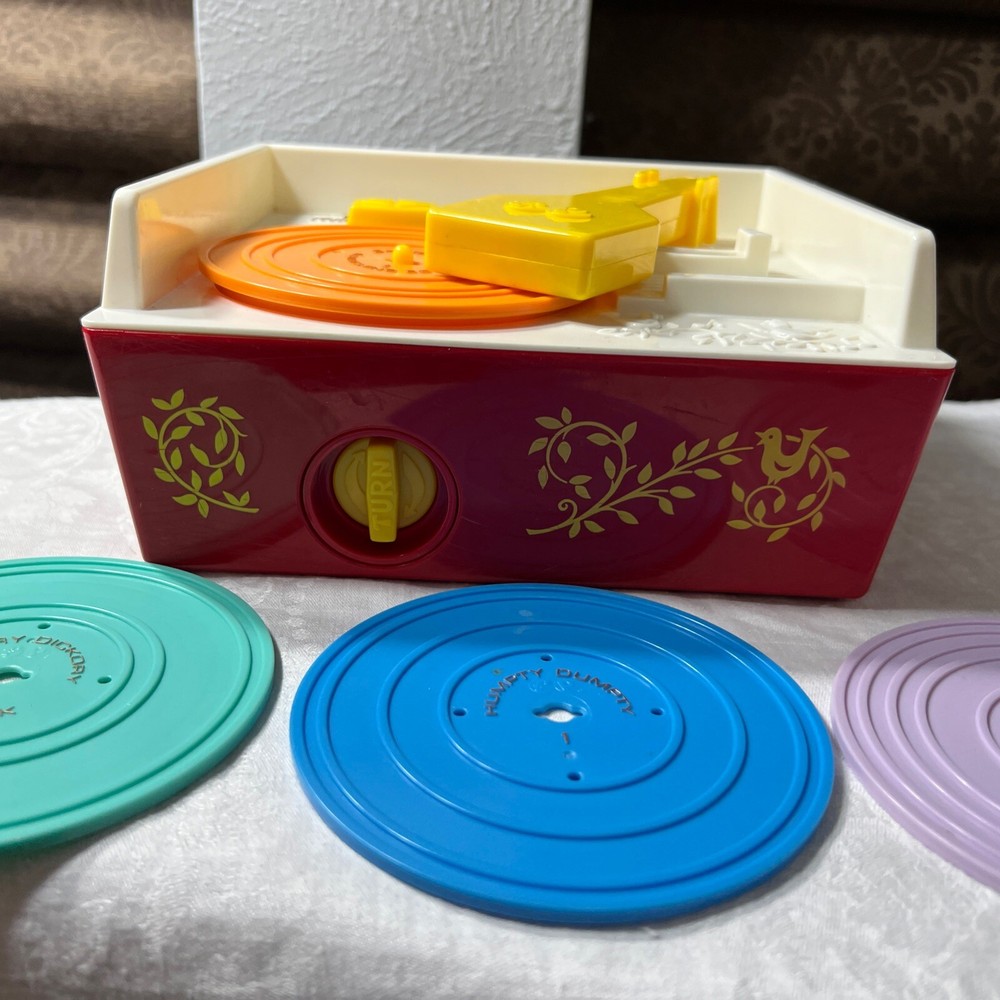 2010 Mattel Inc. Fisher Price Music Box-Record Player 4 Records-works. Missing one record. Small tear to the paper sticker on one side. Small black mark on the outside white part. Comes with the batteries.