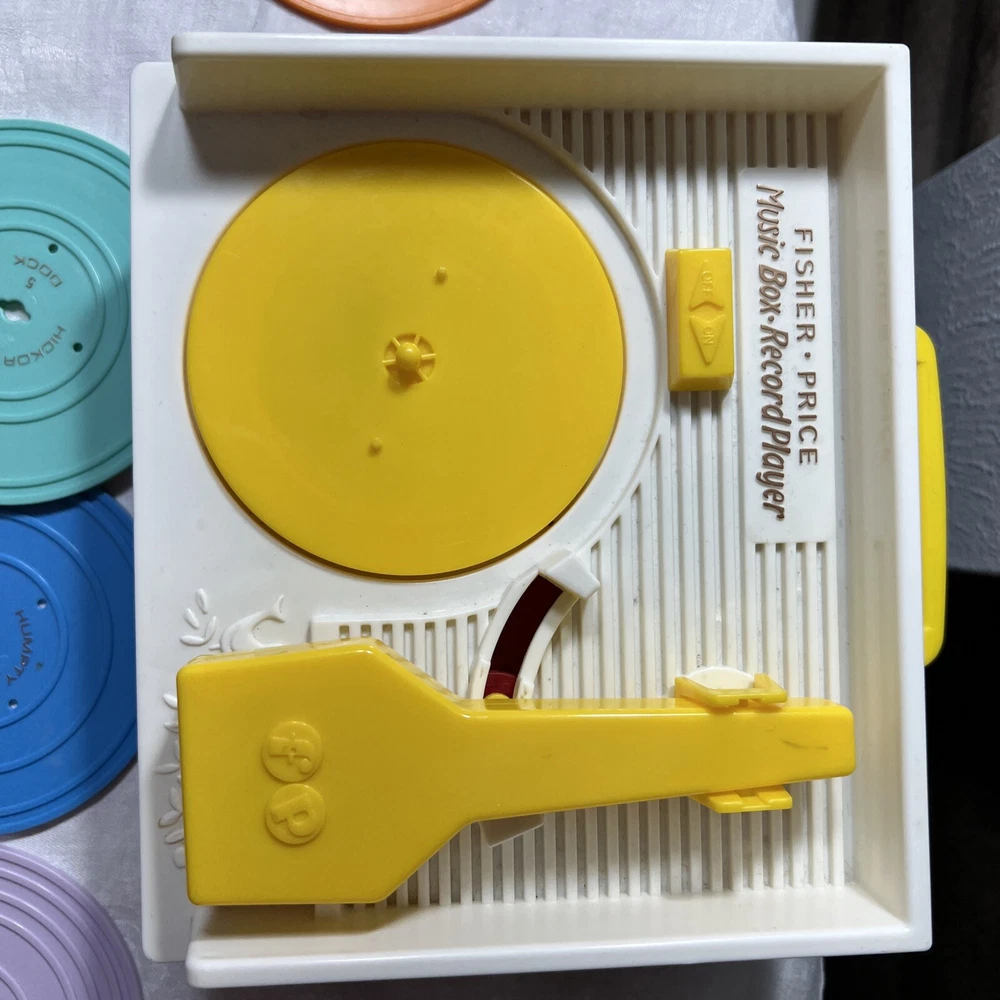 This vintage Fisher Price music box record player is such a charming find! Despite missing one record and having minor wear like a small tear and mark, it works perfectly and comes with batteries. The nostalgic tunes and adorable design make it a delightful piece for collectors or kids. So much fun!