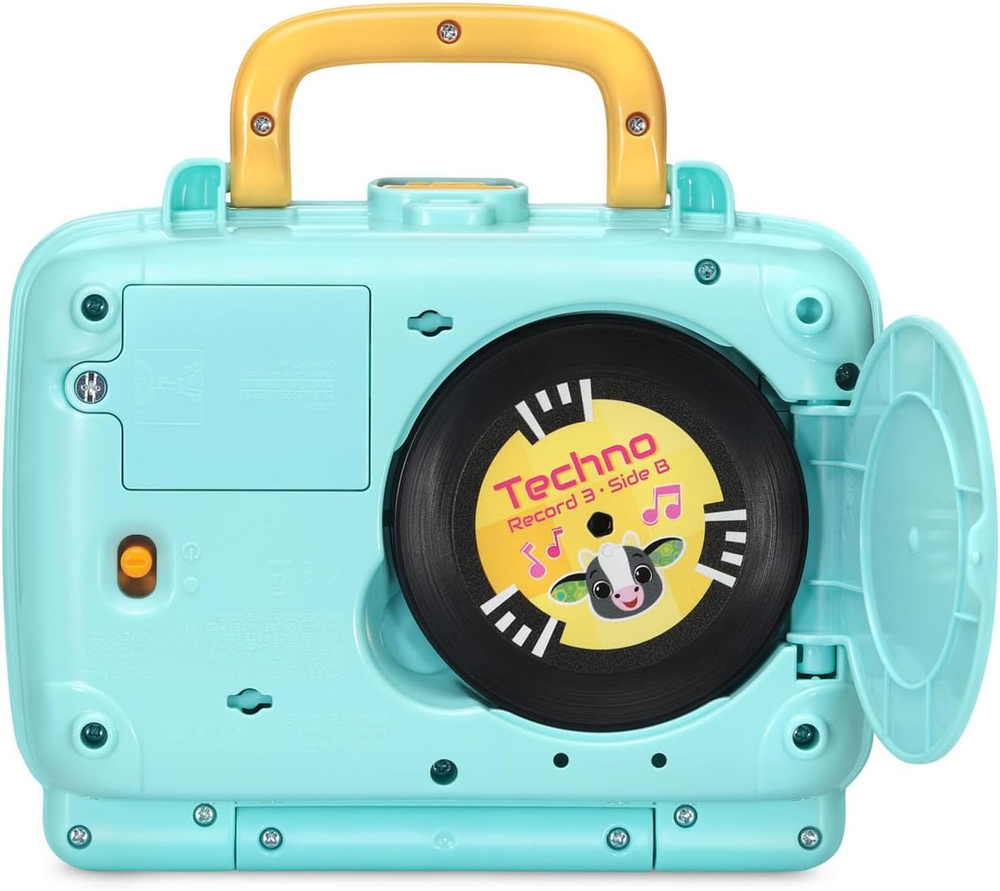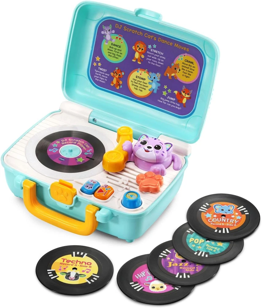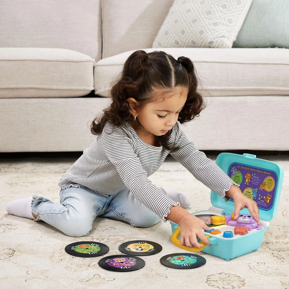 Put on one of the included double-sided records and explore the rhythms of jazz, pop, techno, country and hip hop Add to the role-play with a turntable that lights up as it spins and a kitty whose head bops along to the beats Re-re-remix by layering different animal sounds over the songs, creating unique mixes with every spin Take the show on the road by easily storing the records in the back of the travel-friendly case Intended for ages 12-36 months; requires 3 AA batteries; batteries included for demo purposes only; new batteries recommended for regular use Hey DJ, play that song! Cool cats can spin some mixes with the five included double-sided records. On one side, listen to music in jazz, pop, techno, country and hip hop styles; then flip them over to explore different animal sounds, like the roar of a lion or a horse’s whinny. Keep the role-play going with a turntable that lights up as it spins and a kitty assistant whose head bops along to the beats. Skip ahead to find a favorite song and create unique remixes by layering in the cute animal sounds. Convenient record storage and a carrying handle let mini DJs flip the records, scratch like a pro and go on a musical adventure here, there or anywhere. Let’s mix some beats! Intended for ages 12-36 months. Requires 3 AA batteries. Batteries included for demo purposes only. New batteries recommended for regular use.