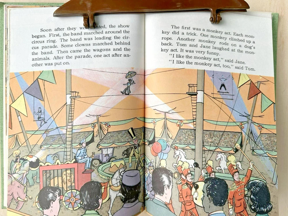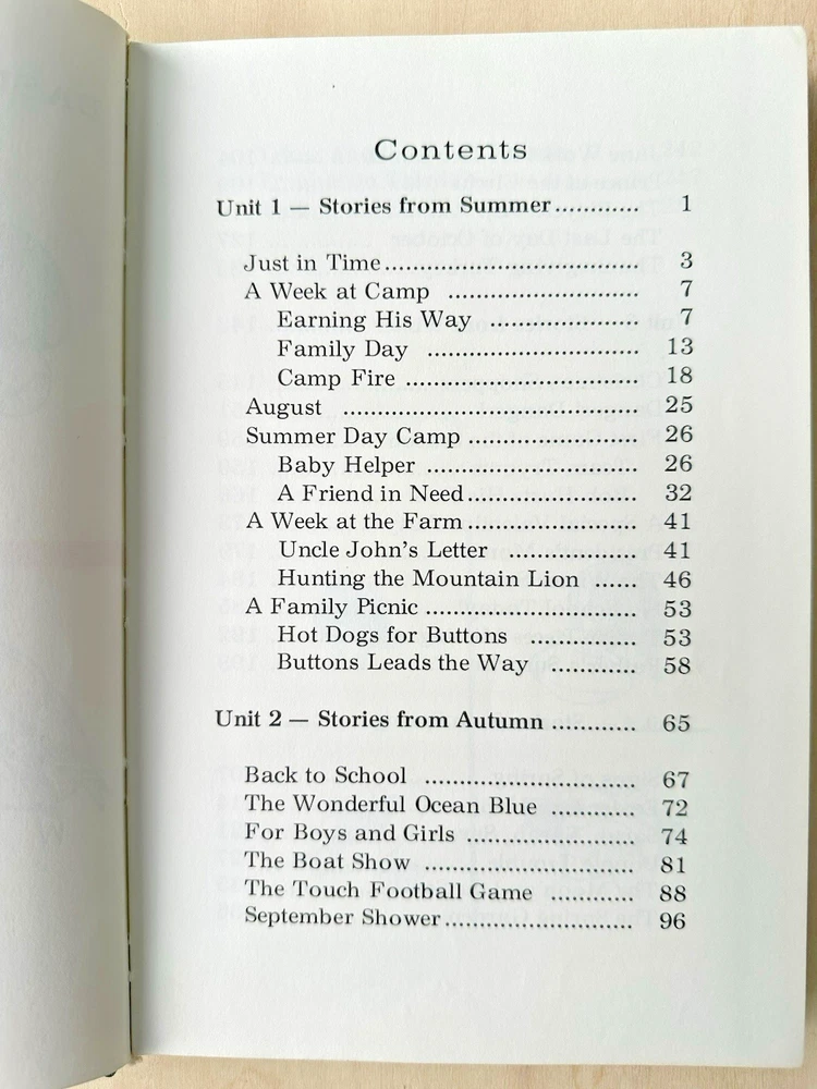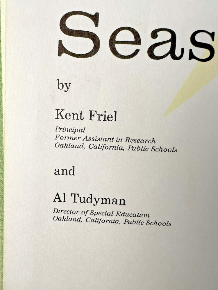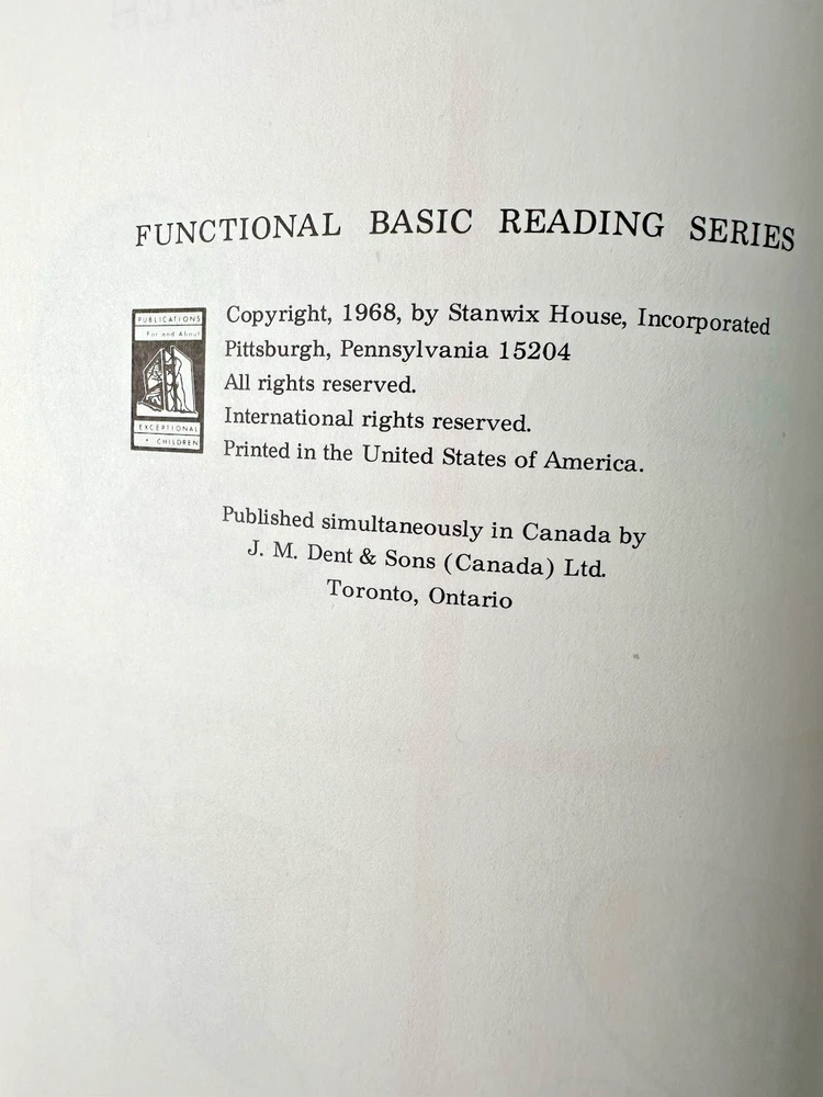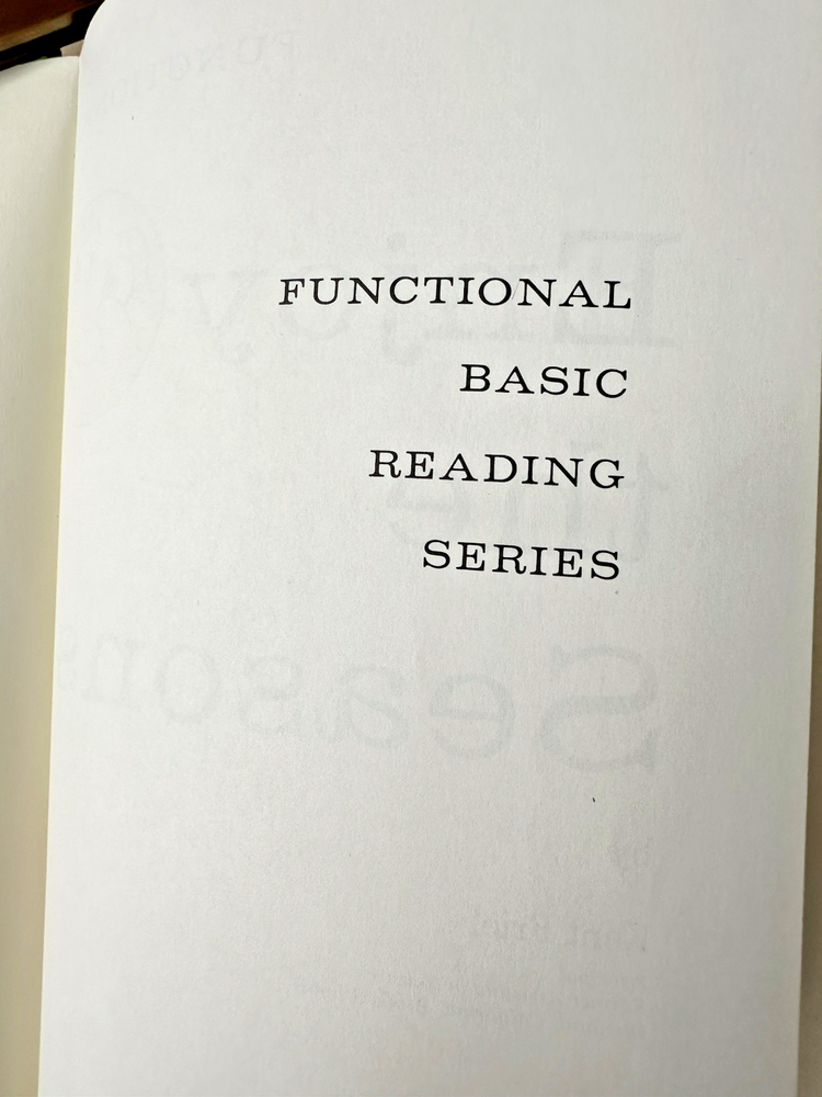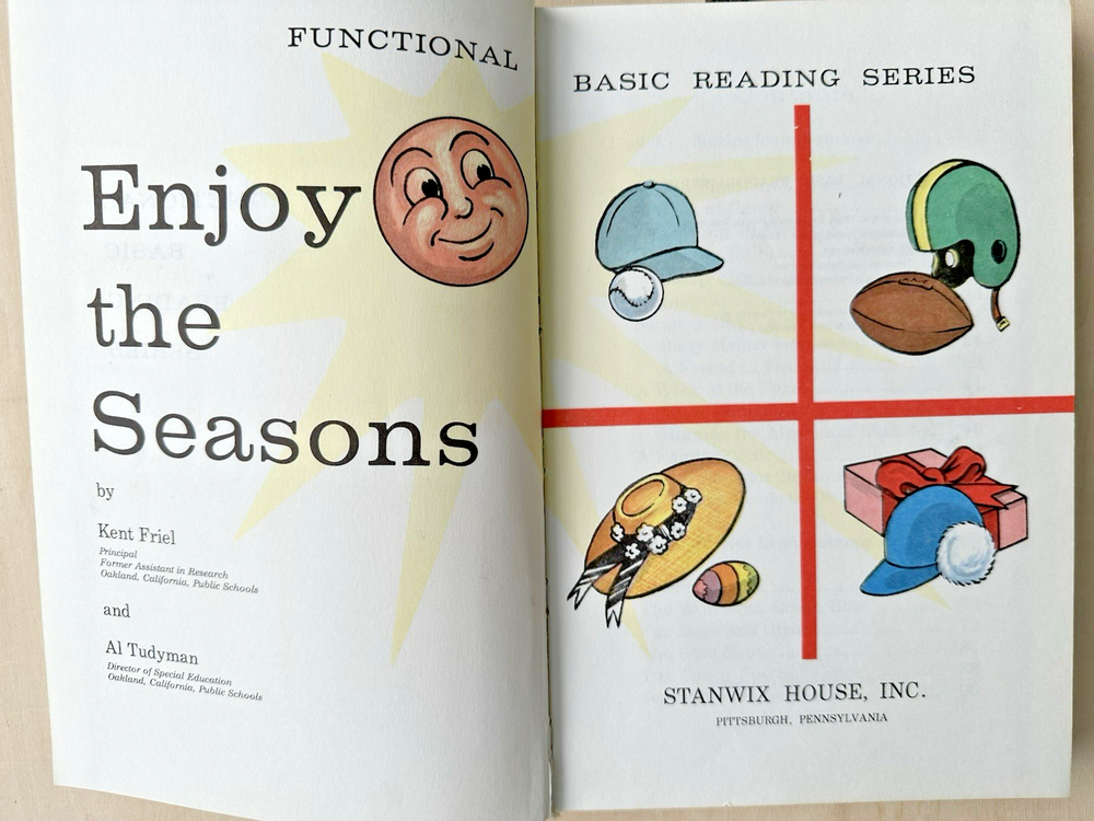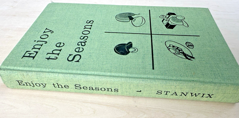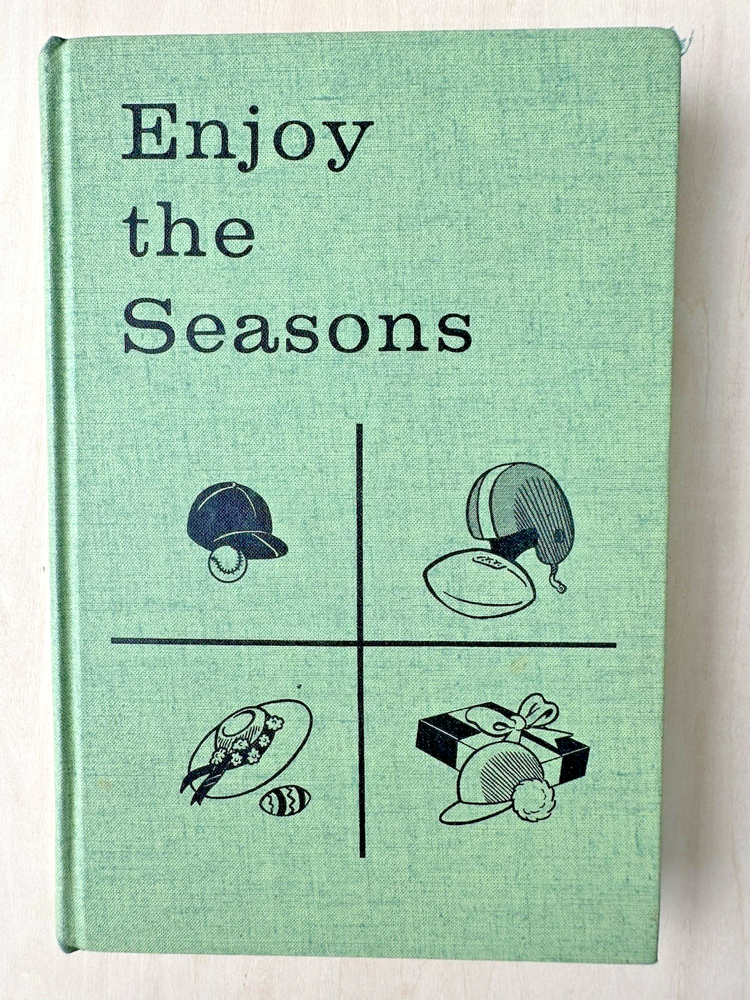 This remedial book is for 11-12 year olds. It emphasizes three social life needs: learning the wise use of leisure time, learning to manage personal affairs, and learning home making and simple money management. The book includes a glossary and a "new word" list. The front cover shows a copy of "Enjoy the Seasons," a book from the Functional Basic Reading Series, published in 1968. The book's cover is light green and features the title in black lettering, along with four black-and-white illustrations representing different seasons: Top Left: A baseball cap and ball, likely symbolizing spring or summer. Top Right: A helmet and football, possibly representing autumn or fall sports season. Bottom Left: A decorated Easter egg, signifying spring. Bottom Right: A wrapped gift with a bow, representing winter or the holiday season. One corner shows more wear than the other three. The pages are very nice and clean. Very little shelf wear!